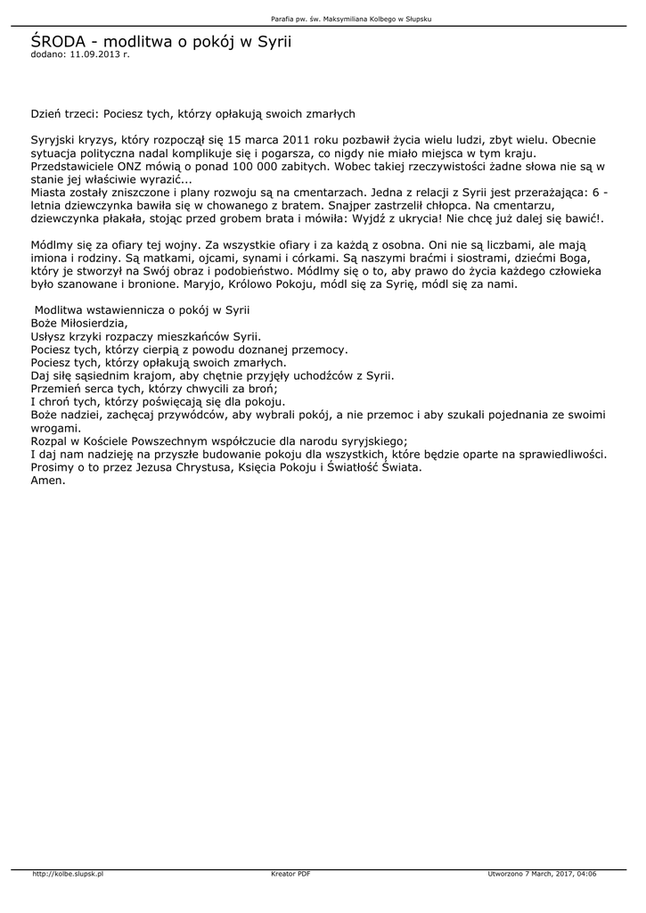 Parafia pw. św. Maksymiliana Kolbego w Słupsku ŚRODA - modlitwa o pokój w Syrii dodano: 11.09.2013 r. Dzień trzeci: Pociesz tych, którzy opłakują swoich zmarłych Syryjski kryzys, który rozpoczął się 15 marca 2011 roku pozbawił życia wielu ludzi, zbyt wielu. Obecnie sytuacja polityczna nadal komplikuje się i pogarsza, co nigdy nie miało miejsca w tym kraju. Przedstawiciele ONZ mówią o ponad 100 000 zabitych. Wobec takiej rzeczywistości żadne słowa nie są w stanie jej właściwie wyrazić... Miasta zostały zniszczone i plany rozwoju są na cmentarzach. Jedna z relacji z Syrii jest przerażająca: 6 letnia dziewczynka bawiła się w chowanego z bratem. Snajper zastrzelił chłopca. Na cmentarzu, dziewczynka płakała, stojąc przed grobem brata i mówiła: Wyjdź z ukrycia! Nie chcę już dalej się bawić!. Módlmy się za ofiary tej wojny. Za wszystkie ofiary i za każdą z osobna. Oni nie są liczbami, ale mają imiona i rodziny. Są matkami, ojcami, synami i córkami. Są naszymi braćmi i siostrami, dziećmi Boga, który je stworzył na Swój obraz i podobieństwo. Módlmy się o to, aby prawo do życia każdego człowieka było szanowane i bronione. Maryjo, Królowo Pokoju, módl się za Syrię, módl się za nami. Modlitwa wstawiennicza o pokój w Syrii Boże Miłosierdzia, Usłysz krzyki rozpaczy mieszkańców Syrii. Pociesz tych, którzy cierpią z powodu doznanej przemocy. Pociesz tych, którzy opłakują swoich zmarłych. Daj siłę sąsiednim krajom, aby chętnie przyjęły uchodźców z Syrii. Przemień serca tych, którzy chwycili za broń; I chroń tych, którzy poświęcają się dla pokoju. Boże nadziei, zachęcaj przywódców, aby wybrali pokój, a nie przemoc i aby szukali pojednania ze swoimi wrogami. Rozpal w Kościele Powszechnym współczucie dla narodu syryjskiego; I daj nam nadzieję na przyszłe budowanie pokoju dla wszystkich, które będzie oparte na sprawiedliwości. Prosimy o to przez Jezusa Chrystusa, Księcia Pokoju i Światłość Świata. Amen. http://kolbe.slupsk.pl Kreator PDF Utworzono 7 March, 2017, 04:06