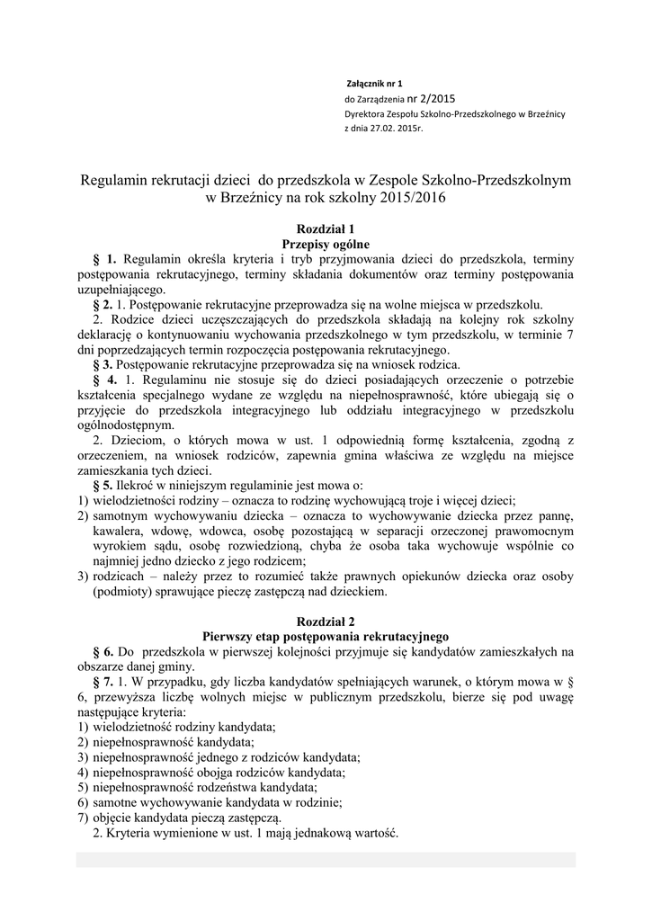 Załącznik nr 1 do Zarządzenia nr 2/2015 Dyrektora Zespołu Szkolno-Przedszkolnego w Brzeźnicy z dnia 27.02. 2015r. Regulamin rekrutacji dzieci do przedszkola w Zespole Szkolno-Przedszkolnym w Brzeźnicy na rok szkolny 2015/2016 Rozdział 1 Przepisy ogólne § 1. Regulamin określa kryteria i tryb przyjmowania dzieci do przedszkola, terminy postępowania rekrutacyjnego, terminy składania dokumentów oraz terminy postępowania uzupełniającego. § 2. 1. Postępowanie rekrutacyjne przeprowadza się na wolne miejsca w przedszkolu. 2. Rodzice dzieci uczęszczających do przedszkola składają na kolejny rok szkolny deklarację o kontynuowaniu wychowania przedszkolnego w tym przedszkolu, w terminie 7 dni poprzedzających termin rozpoczęcia postępowania rekrutacyjnego. § 3. Postępowanie rekrutacyjne przeprowadza się na wniosek rodzica. § 4. 1. Regulaminu nie stosuje się do dzieci posiadających orzeczenie o potrzebie kształcenia specjalnego wydane ze względu na niepełnosprawność, które ubiegają się o przyjęcie do przedszkola integracyjnego lub oddziału integracyjnego w przedszkolu ogólnodostępnym. 2. Dzieciom, o których mowa w ust. 1 odpowiednią formę kształcenia, zgodną z orzeczeniem, na wniosek rodziców, zapewnia gmina właściwa ze względu na miejsce zamieszkania tych dzieci. § 5. Ilekroć w niniejszym regulaminie jest mowa o: 1) wielodzietności rodziny – oznacza to rodzinę wychowującą troje i więcej dzieci; 2) samotnym wychowywaniu dziecka – oznacza to wychowywanie dziecka przez pannę, kawalera, wdowę, wdowca, osobę pozostającą w separacji orzeczonej prawomocnym wyrokiem sądu, osobę rozwiedzioną, chyba że osoba taka wychowuje wspólnie co najmniej jedno dziecko z jego rodzicem; 3) rodzicach – należy przez to rozumieć także prawnych opiekunów dziecka oraz osoby (podmioty) sprawujące pieczę zastępczą nad dzieckiem. Rozdział 2 Pierwszy etap postępowania rekrutacyjnego § 6. Do przedszkola w pierwszej kolejności przyjmuje się kandydatów zamieszkałych na obszarze danej gminy. § 7. 1. W przypadku, gdy liczba kandydatów spełniających warunek, o którym mowa w § 6, przewyższa liczbę wolnych miejsc w publicznym przedszkolu, bierze się pod uwagę następujące kryteria: 1) wielodzietność rodziny kandydata; 2) niepełnosprawność kandydata; 3) niepełnosprawność jednego z rodziców kandydata; 4) niepełnosprawność obojga rodziców kandydata; 5) niepełnosprawność rodzeństwa kandydata; 6) samotne wychowywanie kandydata w rodzinie; 7) objęcie kandydata pieczą zastępczą. 2. Kryteria wymienione w ust. 1 mają jednakową wartość. Rozdział 3 Drugi etap postępowania rekrutacyjnego § 8. Drugi etap postępowania rekrutacyjnego przeprowadza się wówczas, gdy liczba miejsc w przedszkolu jest niewystarczająca w stosunku do liczby kandydatów, którzy uzyskali równorzędne wyniki na pierwszym etapie postępowania rekrutacyjnego, albo gdy przedszkole nadal dysponuje wolnymi miejscami. § 9. Na drugim etapie postępowania rekrutacyjnego brane są pod uwagę następujące kryteria: 1) dzieci najstarsze wiekiem; 2) do tego samego przedszkola uczęszcza rodzeństwo kandydata; Kryteria ustalone w uzgodnieniu z organem prowadzącym stosuje się według hierarchii występowania. Rozdział 4 Kandydaci zamieszkali poza obszarem danej gminy § 10. 1. Kandydaci zamieszkali poza obszarem danej gminy mogą być przyjęci do przedszkola, jeżeli po przeprowadzeniu postępowania rekrutacyjnego zgodnie z § 6 – 9, dana gmina nadal dysponuje wolnymi miejscami w tym przedszkolu. 2. W przypadku większej liczby kandydatów zamieszkałych poza obszarem danej gminy niż liczba wolnych miejsc w przedszkolu, przeprowadza się postępowanie rekrutacyjne, do którego stosuje się odpowiednio § 6 – 9. Rozdział 5 Wniosek o przyjęcie do przedszkola § 11. 1. Wniosek o przyjęcie do przedszkola składa się do dyrektora wybranego przedszkola. 2. Wniosek, o którym mowa w ust. 1, można złożyć do nie więcej niż trzech wybranych publicznych przedszkoli. 3. Formularze wniosków są dostępne w siedzibie. § 12. 1. Do wniosku dołącza się: 1) dokumenty potwierdzające spełnianie kryteriów wymienionych w § 7, mianowicie: a) oświadczenie o wielodzietności kandydata, b) orzeczenie o potrzebie kształcenia specjalnego wydane ze względu na niepełnosprawność, orzeczenie o niepełnosprawności lub o stopniu niepełnosprawności lub orzeczenie równoważne w rozumieniu przepisów ustawy z dnia 27 sierpnia 1997 r. o rehabilitacji zawodowej i społecznej oraz zatrudnianiu osób niepełnosprawnych, c) prawomocny wyrok sądu rodzinnego orzekający rozwód lub separację lub akt zgonu oraz oświadczenie o samotnym wychowywaniu dziecka oraz niewychowywaniu żadnego dziecka z jego rodzicem, d) dokument poświadczający objęcie dziecka pieczą zastępczą; 2) oświadczenia o spełnianiu kryteriów wymienionych w § 9. 2. Dokumenty, o których mowa w ust. 1 pkt 1 lit. b-d, składa się w oryginale, notarialnie poświadczonej kopii albo w postaci urzędowo poświadczonego odpisu lub wyciągu z dokumentu. Dokumenty te mogą być składane także w postaci kopii poświadczonej za zgodność z oryginałem przez rodzica kandydata. 3. Oświadczenia, o których mowa w ust. 1 pkt 1 lit. a i c oraz pkt 2, składa się pod rygorem odpowiedzialności karnej za składanie fałszywych zeznań. 4. Przewodniczący komisji rekrutacyjnej, o której mowa w § 13, może żądać dokumentów potwierdzających okoliczności zawarte w oświadczeniach, w terminie przez siebie wyznaczonym, lub może zwrócić się do wójta (burmistrza, prezydenta miasta) właściwego ze względu na miejsce zamieszkania kandydata o potwierdzenie tych okoliczności. Rozdział 6 Komisja rekrutacyjna § 13. Postępowanie rekrutacyjne przeprowadza komisja rekrutacyjna powołana przez dyrektora przedszkola. Dyrektor wyznacza przewodniczącego komisji rekrutacyjnej. § 14. 1. Do zadań komis
