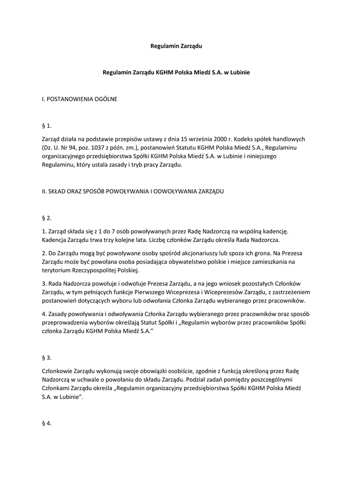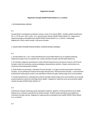 Regulamin Zarządu Regulamin Zarządu KGHM Polska Miedź S.A. w Lubinie I. POSTANOWIENIA OGÓLNE § 1. Zarząd działa na podstawie przepisów ustawy z dnia 15 września 2000 r. Kodeks spółek handlowych (Dz. U. Nr 94, poz. 1037 z późn. zm.), postanowień Statutu KGHM Polska Miedź S.A., Regulaminu organizacyjnego przedsiębiorstwa Spółki KGHM Polska Miedź S.A. w Lubinie i niniejszego Regulaminu, który ustala zasady i tryb pracy Zarządu. II. SKŁAD ORAZ SPOSÓB POWOŁYWANIA I ODWOŁYWANIA ZARZĄDU § 2. 1. Zarząd składa się z 1 do 7 osób powoływanych przez Radę Nadzorczą na wspólną kadencję. Kadencja Zarządu trwa trzy kolejne lata. Liczbę członków Zarządu określa Rada Nadzorcza. 2. Do Zarządu mogą być powoływane osoby spośród akcjonariuszy lub spoza ich grona. Na Prezesa Zarządu może być powołana osoba posiadająca obywatelstwo polskie i miejsce zamieszkania na terytorium Rzeczypospolitej Polskiej. 3. Rada Nadzorcza powołuje i odwołuje Prezesa Zarządu, a na jego wniosek pozostałych Członków Zarządu, w tym pełniących funkcje Pierwszego Wiceprezesa i Wiceprezesów Zarządu, z zastrzeżeniem postanowień dotyczących wyboru lub odwołania Członka Zarządu wybieranego przez pracowników. 4. Zasady powoływania i odwoływania Członka Zarządu wybieranego przez pracowników oraz sposób przeprowadzenia wyborów określają Statut Spółki i „Regulamin wyborów przez pracowników Spółki członka Zarządu KGHM Polska Miedź S.A.” § 3. Członkowie Zarządu wykonują swoje obowiązki osobiście, zgodnie z funkcją określoną przez Radę Nadzorczą w uchwale o powołaniu do składu Zarządu. Podział zadań pomiędzy poszczególnymi Członkami Zarządu określa „Regulamin organizacyjny przedsiębiorstwa Spółki KGHM Polska Miedź S.A. w Lubinie”. § 4. 1. Mandaty członków Zarządu wygasają najpóźniej z dniem odbycia Walnego Zgromadzenia zatwierdzającego sprawozdanie Zarządu z działalności oraz sprawozdanie finansowe Spółki za ostatni rok obrotowy pełnienia funkcji Członka Zarządu. 2. Członkowie Zarządu mogą być w każdej chwili odwołani przez Radę Nadzorczą przed upływem kadencji, co nie narusza ich uprawnień wynikających z umowy o pracę lub innego stosunku prawnego dotyczącego pełnienia funkcji Członka Zarządu. Odwołanie Członka Zarządu wybranego przez pracowników może nastąpić po spełnieniu warunków określonych w §12 ust. 11 – 15 Statutu Spółki. 3. W przypadku zmian w składzie Zarządu, ustępujący Członek Zarządu jest zobowiązany do protokolarnego przekazania wszystkich prowadzonych przez siebie spraw wraz z posiadaną dokumentacją. Przejmującym sprawy i dokumentację jest Prezes Zarządu lub wyznaczony przez Prezesa Członek Zarządu, albo inna osoba wskazana przez Prezesa Zarządu. III. WYNAGRODZENIE I ZAWIERANIE UMÓW Z CZŁONKAMI ZARZĄDU § 5. 1. Zasady wynagradzania i wysokość wynagrodzeń Członków Zarządu określa Rada Nadzorcza. 2. W sprawach dotyczących umów o pracę oraz innych umów z Członkami Zarządu Spółkę reprezentuje Rada Nadzorcza lub Członek Rady, działający na podstawie udzielonego przez Radę upoważnienia. 3. W sporach między Spółką a Członkami Zarządu, Spółkę reprezentuje Rada Nadzorcza, którą może reprezentować Członek Rady, działający na podstawie upoważnienia udzielonego przez Radę, albo pełnomocnicy powołani uchwałą Walnego Zgromadzenia. IV. ZAKRES DZIAŁANIA ZARZĄDU § 6. Do zakresu działania Zarządu należy prowadzenie wszelkich spraw Spółki, za wyjątkiem zastrzeżonych w przepisach Kodeksu spółek handlowych i Statucie Spółki do kompetencji Walnego Zgromadzenia i Rady Nadzorczej. § 7. 1. Zarząd podejmuje decyzje w formie uchwał. 2. W szczególności do spraw wymagających uchwał Zarządu należą: 1) określanie strategii Spółki, 2) uchwalanie rocznych i wieloletnich planów działalności Spółki, 3) ustalanie struktury organizacyjnej, 4) uchwalanie regulaminu Zarządu, regulaminu organizacyjnego przedsiębiorstwa Spółki i regulaminu pracy Biura Zarządu, 5) dokonywanie darowizn, zgodnie z planem techniczno-ekonomicznym zatwierdzonym przez Radę Nadzorczą, 6) ustalanie zasad gospodarki finansowej i systemu ekonomicznego przedsiębiorstwa Spółki, 7) powoływanie, odwoływanie oraz ustalanie zasad wynagradzania i premiowania dyrektorów oddziałów KGHM Polska Miedź S.A., ich zastępców i głównych księgowych, 8) tworzenie, łączenie, podział i likwidacja jednostek organizacyjnych przedsiębiorstwa Spółki, 9) zbycie i nabycie nieruchomości lub udziałów w nieruchomości, 10) zbycie majątku Spółki, w formie wkładu niepieniężnego (aportu) do innego przedsiębiorcy, 11) zbycie i wydzierżawienie przedsiębiorstwa lub jego zorganizowanej części oraz ustanowienie na nich ograniczonego prawa rzeczowego, 12) sprzedaż składnika majątku trwałego ruchomego Spółki, którego wartość rynkowa przekracza w złotych polskich równowartość kwoty 10.000 EURO, obliczonej przy zastosowaniu kursu średniego ogłoszonego przez NBP, obowiązującego w dniu ustalenia wartości rynkowej, 13) zatwierdzanie umów i statutów spółek utworzonych przez KGHM Polska Miedź S.A., kandydatów do zarządów i rad nadzorczych spółek utworzonych z udziałem KGHM Polska Miedź S.A. oraz zasad wynagradzania zarządów spółek zależnych, 14) ustanowienie prokury, 15) udzielanie pełnomocnictw, z wyjątkiem pełnomocnictw procesowych, 16) zwoływanie walnych zgromadzeń KGHM Polska Miedź S.A., 17) przyjęcie jednostkowego i skonsolidowanego sprawozdania finansowego oraz sprawozdania Zarządu z działalności Spółki i Grupy kapitałowej za dany rok obrotowy, 18) przyjęcie wniosku co do podziału zysku lub pokrycia straty, 19) tworzenie i przystępowanie do spółek handlowych, 20) objęcie lub nabycie akcji lub udziałów innej Spółki, 21) zbywanie akcji i udziałów w podmiotach zależnych Spółki, 22) u