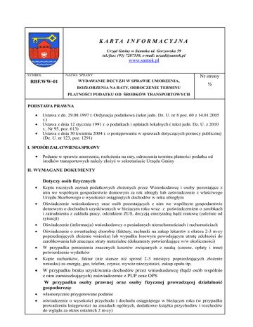 K A RTA I N F O R M A CY J NA Urząd Gminy w Santoku ul. Gorzowska 59 tel./fax: (95) 7287510, e-mail: [email protected] www.santok.pl SYMBOL NAZWA SPRAWY WYDAWANIE DECYZJI W SPRAWIE UMORZENIA, RBF.WW-01 ROZŁORZENIA NA RATY, ODROCZENIE TERMINU Nr strony ½ PŁATNOŚCI PODATKU OD ŚRODKÓW TRANSPORTOWYCH PODSTAWA PRAWNA Ustawa z dn. 29.08.1997 r. Ordynacja podatkowa (tekst jedn. Dz. U. nr 8 poz. 60 z 14.01.2005 r.) Ustawa z dnia 12 stycznia 1991 r. o podatkach i opłatach lokalnych ( tekst jedn. Dz. U. z 2010 r., Nr 95, poz. 613) Ustawa z dnia 30 kwietnia 2004 r. o postępowaniu w sprawach dotyczących pomocy publicznej (Dz. U. nr 123, poz. 1291) I. SPOSÓB ZAŁATWIENIA SPRAWY Podanie w sprawie umorzenia, rozłożenia na raty, odroczenia terminu płatności podatku od środków transportowych należy złożyć w sekretariacie Urzędu Gminy II. WYMAGANE DOKUMENTY Dotyczy osób fizycznych Kopie rocznych zeznań podatkowych złożonych przez Wnioskodawcę i osoby pozostające z nim we wspólnym gospodarstwie domowym za rok ubiegły lub zaświadczenie z właściwego Urzędu Skarbowego o wysokości osiągniętych dochodów w roku ubiegłym Oświadczenie wnioskodawcy oraz osób pozostających z nim we wspólnym gospodarstwie domowym o dochodach uzyskiwanych w bieżącym roku wraz z poświadczeniem o zarobkach i zatrudnieniu z zakładu pracy, odcinkiem ZUS, decyzją emerytalną bądź rentową (zależnie od sytuacji) Oświadczenie (informacja) wnioskodawcy o posiadanych nieruchomościach i ruchomościach Oświadczenie o ewentualnej chorobie (faktury, rachunki na zakup lekarstw z okresu 2-3 m-cy poprzedzających złożenie wniosku) lub wypadku losowym powodującym utratę zdolności do zarobkowania lub znaczące straty materialne (dokumenty potwierdzające w/w okoliczności) W przypadku poniesienia znacznych kosztów związanych z nauką (czesne, opłaty i inne) potwierdzenie wydatków Kopie rachunków, faktur (nie starsze niż sprzed 2-3 miesięcy poprzedzających złożenie wniosku) za energię, gaz, telefon, czynsz, wywóz nieczystości, zakup opału itp. W przypadku braku uzyskiwania dochodów przez wnioskodawcę (bądź osób wspólnie z nim zamieszkujących) zaświadczenie z PUP oraz OPS W przypadku osoby prawnej oraz osoby fizycznej prowadzącej działalność gospodarczą: własnoręcznie przygotowane podanie oświadczenie o wysokości przychodu i dochodu osiągniętego w bieżącym roku (w przypadku prowadzenia księgowości na zasadach ogólnych, dodatkowo książka przychodów i rozchodów do wglądu za okres ostatnich 2 m-cy) informacja o liczbie zatrudnionych (np. ZUS DRA) zaświadczenie z ZUS i US o niezaleganiu ze składkami, zobowiązaniami podatkowymi oświadczenie wnioskodawcy o posiadanych środkach trwałych (ewidencja do wglądu) oświadczenie o posiadanych kredytach, pożyczkach, leasingu (ksero umów) aktualny wyciąg z bieżącego rachunku bankowego (za okres 2 m-cy poprzedzających złożenie wniosku) W przypadku ubiegania się o pomoc de minimis dodatkowo: Zaświadczenie o pomocy de minimis otrzymanej w okresie obejmującym bieżący rok kalendarzowy oraz dwa poprzedzające go lata kalendarzowe albo oświadczenie o wielkości pomocy de minimis otrzymanej w tym okresie bądź informację o nieotrzymaniu pomocy Oświadczenie, że nie jest przedsiębiorcą znajdującym się w trudnej sytuacji ekonomicznej III. OPŁATY Nie podlega opłacie IV. SPOSÓB POSTĘPOWANIA Wydanie decyzji w sprawie odroczenia, rozłożenia zaległości podatkowych na raty, umorzenia zaległości podatkowych V. TERMIN ZAŁATWIENIA SPRAWY Wydanie decyzji – do 30 dni od daty złożenia dokumentów, a w sprawach wymagających przeprowadzenia dodatkowego postępowania wyjaśniającego – do 60 dni VI. TRYB ODWOŁAWCZY Od decyzji przysługuje stronie odwołanie do Samorządowego Kolegium Odwoławczego w Gorzowie Wlkp. Za pośrednictwem organu podatkowego, który wydał decyzję w terminie 14 dni od daty doręczenia niniejszej decyzji . VII. INFORMACJE DODATKOWE Wniosek bez uzasadnienia, a także wniosek nie poparty odpowiednimi dokumentami może pozostać bez rozpatrzenia. O wszelkich zmianach mających wpływ na wysokość zobowiązania podatkowego (sprzedaż, zmiana miejsca zamieszkania lub siedziby podatnika) podatnik zobowiązany jest zawiadomić Urząd Gminy w terminie 14 dni od daty zmiany. VIII.OSOBA ZAŁATWIEJĄCA SPRAWĘ ( ODPOWIEDZIALNY ZA PROCES) Stanowisko ds. wymiaru i windykacji, pokój nr 6 (parter), Tel.095 728-75-16 RBF.WW- 01 Wydanie III z dnia 30.03.2012 Strona 2/2 INFORMACJA o sytuacji majątkowej wnioskodawcy ubiegającego się o zastosowanie ulgi w spłacie zobowiązań podatkowych - pobierz Pomoc de minimis zał. nr 2 do RBF.WW-01 - pobierz