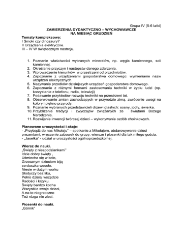 Grupa IV (5-6 latki) ZAMIERZENIA DYDAKTYCZNO – WYCHOWAWCZE NA MIESIĄC GRUDZIEŃ Tematy kompleksowe: I Smoki czy dinozaury? II Urządzenia elektryczne. III – IV W świątecznym nastroju. 1. Poznanie właściwości wybranych minerałów, np. węgla kamiennego, soli kamiennej. 2. Określanie przyczyn i następstw danego zdarzenia. 3. Wprowadzenie kierunków w przestrzeni od przedmiotów. 4. Zapoznanie z urządzeniami gospodarstwa domowego: wymienianie nazw urządzeń elektrycznych. 5. Nazywanie przodków dzisiejszych urządzeń gospodarstwa domowego. 6. Zapoznanie z różnymi formami zastosowania techniki w życiu ludzi (np. korzystanie z telefonu, radia, telewizji) 7. Podawanie przykładów rozwoju techniki na przestrzeni lat. 8. Obserwowanie zmian zachodzących w przyrodzie zimą, zwrócenie uwagi na kolory i piękno przyrody. 9. Poznanie wybranych przedstawicieli drzew iglastych: sosny, jodły, świerka. 10. Przybliżenie tradycji i zwyczajów związanych ze świętami Bożego Narodzenia. 11. Rozwijanie inwencji twórczej dzieci – wykonywanie ozdób choinkowych. Planowane uroczystości i akcje: - „Przybądź do nas Mikołaju” – spotkanie z Mikołajem, obdarowywanie dzieci prezentami, wręczenie zabawek do grupy, wiersze i piosenki dla tak miłego gościa. - „Jasełka” - udział w uroczystości ogólnoprzedszkolnej. Wiersz do nauki. „Święty z niespodziankami” Idzie dobry święty , Uśmiecha się w koło, Grzecznym dzieciom biją serduszka wesoło. Niesie w dużym worku Słodyczy bez liku, Pełno dzisiaj wszędzie Radości i krzyku. Święty bardzo kocha Wszystkie swoje dzieci, A na te niegrzeczne Też rózga nie zleci. Piosenki do nauki. „Górnik” Młody górnik znalazł dziś skamieniały liść Nie oderwię bryły sam młot i kilof mam Podniósł kilof, podniósł młot, otarł ręką z czoła pot Kiedy nadszedł pracy czas stuknął w ścianę raz Warczy świder tur, tur, tur kroi w węglu wzór Potem kilof w twardy głaz wali raz po raz wydobywa liścia ślad leżał w węglu milion lat Górnik otarł z czoła pot raźno dzwoni młot „Przyjedź do nas Mikołaju” Kiedy za oknami w śniegu zasną drzewa Kiedy nad polami, wiatr o zimie śpiewa. Przyjedź do nas Mikołaju, Mikołaju z workiem jak to niebo. Przywieź radość i zabawki, i zabawki Dla nas, dla każdego, dla nas dla każdego. Usiądź pod choinką, porozmawiaj z nami I tak jak się śniło obdziel podarkami. Przyjedź do nas Mikołaju, Mikołaju na saniach srebrzystych, Niech Ci gwiazdy drogę wskażą, drogę wskażą Gdzie czekamy wszyscy, gdzie czekamy wszyscy.