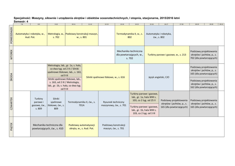 Specjalność: Maszyny, siłownie i urządzenia okrętów i obiektów oceanotechnichnych, I stopnia, stacjonarne, 2015/2016 letni Semestr: 4 8-9 Automatyka i robotyka, w., Aud. Pot. 9-10 10-11 11-12 Metrologia, w., Podstawy konstrukcji maszyn, s. 702 w., s. 801 12-13 13-14 14-15 Termodynamika II, w., s. 802 Mechanika techniczna dla powtarzających, w., s. 702 15-16 16-17 17-18 18-19 19-20 Automatyka i robotyka, ćw., s. 802 Turbiny parowe i gazowe, w., s. 213 Podstawy projektowania okrętów i jachtów, p., s. 702 (dla powtarzających) Podstawy projektowania okrętów i jachtów, p., s. 165 (dla powtarzających) Silniki spalinowe tłokowe, w., s. 616 Język angielski, CJO Podstawy projektowania okrętów i jachtów, p., s. 162 (dla powtarzających) CZWARTEK Metrologia, lab., gr. 1a, s. hala, co dwa tyg. od 2 III / Silniki spalinowe tłokowe, lab., s. 163, od 9 III Silniki spalinowe tłokowe, lab., s. 163, od 2 III / Metrologia, lab., gr. 1b, s. hala, co dwa tyg. od 9 III Turbiny Silniki parowe i spalinowe gazowe, ćw., tłokowe, ćw., s. s. 809 809 Termodynamika II, ćw., s. 701A Rysunek techniczny maszynowy, ćw., s. 701 PIĄTEK ŚRODA WTOREK PONIEDZIAŁEK 7-8 Mechanika techniczna dla powtarzających, ćw., s. 410 Podstawy automatyzacji okrętu, w., s. Aud. Pot. Podstawy konstrukcji maszyn, ćw., s. 701 Turbiny parowe i gazowe, lab., gr. 1a, hala WM s. 103, co 2 tyg. od 25 II Turbiny parowe i gazowe, lab., gr. 1b, hala WM s. 103, co 2 tyg. od 3 III Podstawy projektowania okrętów i jachtów, p., s. 165 (dla powtarzających) Podstawy projektowania okrętów i jachtów, p., s. 165 (dla powtarzających) 20-21