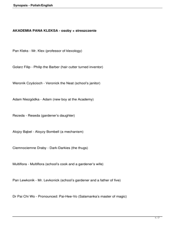 Synopsis - Polish/English AKADEMIA PANA KLEKSA - osoby + streszczenie Pan Kleks - Mr. Klex (professor of klexology) Golarz Filip - Philip the Barber (hair cutter turned inventor) Weronik Czyścioch - Veronick the Neat (school’s janitor) Adam Niezgódka - Adam (new boy at the Academy) Rezeda - Reseda (gardener’s daughter) Alojzy Bąbel - Aloyzy Bombell (a mechanism) Ciemnociemne Draby - Dark-Darkies (the thugs) Multiflora - Multiflora (school’s cook and a gardener’s wife) Pan Lewkonik - Mr. Levkonick (school’s gardener and a father of five) Dr Pai Chi Wo - Pronounced: Pai-Hee-Vo (Salamanka’s master of magic) 1/7 Synopsis - Polish/English Dalia, Róża, Hortensja, Piwonia - Dahlia, Rose, Hortensia, Peony (Reseda’s sisters) uczniowie - students of the Academy Królowa Aba - Queen Aba (also called Melusyne) Rak Pustorak - Pustorak the Crab (Queen Aba’s page) Patentoniusz - Patentonius (Chief Engineer of Patentonia) Inżynier Bubel - Boobel the Engineer (Patentonius’s assistant) Kwaternoster - Quaternoster (King of Alamakota, the Land of Eggs) Ministron - Ministron (Prime Minister of Alamakota) Abeci - The Abetians Patentoci - The Patentonians Nibyci - The Tender Nolanders Alamakoci - The Alamakotans 2/7 Synopsis - Polish/English I AKT Adaś Niezgódka, chłopiec nieco gapowaty i nie rozpieszczany przez otoczenie, zostaje wysłany na naukę do Akademii Pana Kleksa, gdzie ma wyrosnąć na mężczyznę (Ten chłopak grosza nie jest wart ). Okazuje się, że nie jest to zwykła szkoła, tylko szkoła magii, w której najważniejszym przedmiotem jest kleksografia i to właśnie od niej rozpoczyna się nauka ( Kleksografia ). Lekcja zoologii ( ZOO ) zostaje przerwana przez przybycie Golarza Filipa, w asyście złowieszczych Ciemno-Ciemnych drabów ( Miły, zdolny i uroczy ). Fryzjer odmawia dalszych dostaw piegów, bez których Pan Kleks nie może prowadzić zajęć. Domaga się też przyjęcia nowego ucznia, rzekomo swego kuzyna, Alojzego Bąbla. Rzut oka do pracowni Golarza Filipa przekonuje, że ten podstępny wynalazca skonstruował chłopca-lalkę ( Ta lalka będzie żyć ). Niecny fryzjer ma zamiar wykraść Kleksowi szkatułkę z sekretami doktora Paj-Chi-Wo – źródło magicznej mocy profesora i gwarancję bezpieczeństwa świata bajek oraz samej Akademii. Zamierza posłużyć się w tym celu chłopcem-lalką. Przybycie Alojzego przerywa wesoły posiłek ( Kolorowy jadłospis ), a on sam najpierw zachowuje się niesfornie ( Leń ), a następnie wprost wymawia posłuszeństwo ( Chcę być zły ). Brakuje mu oleju P+P, używanego przez profesora Kleksa w pracy dydaktycznej z uczniami. Podczas walki z Alojzym Adaś Niezgódka dzielnie broni Rezedy, córki szkolnego ogrodnika. Kleks opowiada dwojgu młodym o swoich studiach w Salamance i poznajemy doktora Paj-Chi-Wo ( Salamanka ). Niestety, podczas wieczornego Balu Bajek, Alojzy wykrada sekrety – lalka uczy się bardzo szybko i zdobywa niezależność. Odmawia wykonania rozkazów swego twórcy, Filipa Golarza, i woli zatrzymać sekrety dla siebie. Ucieka na Wyspy Bergamuty, których – jak powszechnie wiadomo – nie ma. Bajki zapadają w sen... Zdruzgotany profesor ze smutkiem obserwuje upadek Akademii i martwi się o jej przyszłość ( Świat bez magii ). Na szczęście wszyscy podchwytują inicjatywę Adasia Niezgódki, który zachęca do powołania grupy pościgowej. Kleks każe przyszykować swój cudowny pojazd, „Kleksolot”. W pogoni za Alojzym Bąblem poleci nim on sam, dzielny woźny Weronik, Adaś i Rezeda ( Na Wyspach Bergamutach ). Nie poddają się również Golarz Filip i jego draby. W ostatniej scenie I Aktu widzimy, jak „Kleksolot”, zestrzelony przez fryzjera nad wzburzonym oceanem, pogrąża się w odmętach. 3/7 Synopsis - Polish/English II AKT Szczęśliwym trafem do katastrofy „Kleksolotu” doszło nad podwodną krainą, Abecją, znaną profesorowi z wcześniejszych podróży. Oddychanie nie stanowi tam problemu i czwórka naszych bohaterów wesoło baraszkuje w podmorskiej głębi (Hej, barakuda). Poznajemy Meluzynę, królową Abecji, która opowiada o miłości do Raka-Pustoraka ( Meluzyna ). Ale audiencję przerywa przybycie Golarza Filipa w nieodłącznej asyście drabów – oni także pragną odzyskać szkatułkę z sekretami. W wielkim zamieszaniu okazuje się, że Rakiem-Pustorakiem był przebiegły Alojzy Bąbel, lecz lalka umyka – jej trop prowadzi do Patentonii, krainy wynalazków. Włada nią Patentoniusz, mistrz inżynierii, całkowicie oddany produkcji dziur, dawny kolega Pana Kleksa z Salamanki ( Moja maszyna ). Obaj uczeni wspominają dawne czasy ( Wynalazcy wynalazków ), a w tym czasie nowy asystent Patentoniusza – inżynier Bubel – podaje Rezedzie bardzo niebezpieczny napój: kochalginę. Kochalgina jest produktem ubocznym wytwarzania dziur, jej wypicie zaś powoduje przypływ bezkrytycznej miłości do tego, kto ją podał. Oczywiście rzekomy inż. Bubel, to kolejne chytre przebranie Alojzego Bąbla. Tak więc tym razem – chociaż w walce Kleksa z Filipem Golarzem dzielny Adaś ratuje profesorowi życie – Adasia nie czeka nagroda za odwagę, wręcz przeciwnie ( Prawda boli tak jak ząb ). Zakochana Rezeda marzy tylko o swoim „przystojnym inżynierze”. Rozbita grupa pościgowa trafia do Nibycji, przedziwnej krainy, w której wszystko jest na niby – zaludniają ją osobliwi ludzie ( Rozmyci Nibyci ). Hasło do dalszej pogoni i tym razem wypływa od Adasia, któremu wtóruje woźny Weronik ( Nikt nie może być szczęśliwy ). Nasi bohaterowie trafiają do Alamakoty, najdziwniejszej z odwiedzonych dotychczas krain – jej mieszkańcy hodują drób, eksportują jaja i zamieniają je na zegarki, które następnie... psują. Zasady rządzące Alamakotą wyjaśnia jej król, Kwateronster, w trakcie przemówienia z okazji święta państwowego ( Kraj Jaj ). Ale i tutaj dogania naszych bohaterów Golarz Filip w asyście nieodłącznych drabów. Sprytny fryzjer n