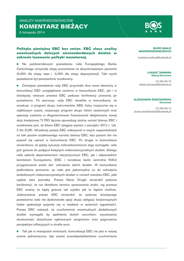 ANALIZY MAKROEKONOMICZNE KOMENTARZ BIEŻĄCY 6 listopada 2014 Polityka pieniężna EBC bez zmian. EBC zleca analizy ewentualnych dalszych niestandardowych działań w zakresie luzowania polityki monetarnej. Na październikowym posiedzeniu rada Europejskiego BIURO ANALIZ MAKROEKONOMICZNYCH [email protected] Banku Centralnego utrzymała stopy procentowe na dotychczasowym poziomie (0,05% dla stopy repo i -0,20% dla stopy depozytowej). Taki wynik posiedzenia był powszechnie oczekiwany. Dzisiejsze posiedzenie rady EBC przyniosło dwa nowe elementy w ŁUKASZ TARNAWA Główny Ekonomista 22-850-86-75 [email protected] komunikacji EBC uwzględnione zarówno w komunikacie EBC, jak i w dzisiejszej retoryce prezesa EBC podczas konferencji prasowej po posiedzeniu. Po pierwsze, rada EBC określiła w komunikacie, że oczekuje, iż program skupu instrumentów ABS, który rozpocznie się w najbliższym czasie, rozpoczęty program skupu listów zastawnych oraz operacje zasilania w długoterminowe finansowanie dedykowane nowej akcji kredytowej TLTRO łącznie spowodują istotny wzrost bilansu EBC i oczekiwane jest, że bilans EBC osiągnie poziom z początku 2012 r. (ok. 3 bln EUR). Wcześniej prezes EBC wskazywał w swych wypowiedziach na taki poziom oczekiwanego wzrostu bilansu EBC, lecz poziom ten nie pojawił się wprost w komunikacie EBC. Po drugie w komunikacie stwierdzono, że gdyby sytuacja makroekonomiczna tego wymagała, rada jest gotowa do podjęcia kolejnych niekonwencjonalnych działań, dlatego rada zaleciła departamentom merytorycznym EBC, jak i odpowiednim komitetom Eurosystemu (EBC i narodowe banki centralne EMU) przygotowanie analiz dot. wdrożenia takich działań. W komunikacie podkreślono ponownie, że rada jest jednomyślna co do wdrożenia dodatkowych niekonwencjonalnych działań w ramach mandatu EBC, jeśli zajdzie taka potrzeba. Prezes Mario Draghi stwierdził podczas konferencji, że nie określono terminu opracowania analiz, wg prezesa EBC analizy te będą gotowe tak szybko jak to będzie możliwe. Jednocześnie prezes EBC stwierdził, że podczas dzisiejszego posiedzenia rada nie dyskutowała opcji skupu obligacji korporacyjnych (takie spekulacje pojawiły się w mediach w ostatnich tygodniach). Prezes EBC wskazał, że uruchomienie ewentualnych dodatkowych działań wymagało by spełnienia dwóch warunków: wyczerpania skuteczności dotychczas ogłoszonych programów oraz pogorszenia perspektyw inflacyjnych w strefie euro. Tak jak w miesiącach minionych, komunikacja EBC nie jest w naszej ocenie jednoznaczna, aby ocenić prawdopodobieństwo uruchomienia ALEKSANDRA ŚWIĄTKOWSKA Ekonomista 22-850-88-12 [email protected] przez bank centralny szerokiego programu skupu aktywów, w tym skupu obligacji skarbowych. Na wzrost prawdopodobieństwa takiego działania mogłoby wskazywać zdecydowanie bardziej jednoznaczne wskazanie na cel EBC w kontekście wielkości bilansu banku centralnego, jak również informacje o zaleceniach dot. uruchomienia dalszych prac dot. nowych działań luzowania polityki pieniężnej. Z drugiej strony zwraca uwagę fakt często powtarzanego przez prezesa EBC podczas konferencji prasowej warunku analizy wpływu dotychczas ogłoszonych działań w zakresie luzowania polityki pieniężnej oraz bardzo nieprecyzyjne określenia dot. prac nad nowymi działaniami luzowania polityki pieniężnej, w szczególności w kontekście niejednokrotnie powtarzanego w minionych miesiącach wątku, że rada EBC dysponuje szerokim wachlarzem działań. Analiza opublikowanego komunikatu rady EBC oraz wypowiedzi prezesa M. Draghi mogłyby wskazywać na perspektywę uruchomienia w najbliższych miesiącach szerokiego programu skupu aktywów. Z kolei wciąż nieprecyzyjne informacje w tym kontekście (prezes M. Draghi w ogóle nie ustosunkował się do informacji medialnych o planach skupu obligacji korporacyjnych przez EBC) mogłoby także oznaczać utrzymanie dotychczasowej polityki banku centralnego stopniowego „dozowania” procesu luzowania polityki pieniężnej i realizacji głównego celu jakim jest utrzymanie słabszych notowań kursu euro poprzez podtrzymywanie oczekiwań rynkowych na kontynuację luzowania polityki pieniężnej. W taką ocenę wpisuje się także podkreślany przez prezesa EBC wątek dywegencji polityki pieniężnej głównych banków centralnych. W takim scenariuszu celem rady EBC byłoby odsuwanie możliwie najdalej w czasie konieczności rozstrzygnięcia w zakresie programu skupu obligacji skarbowych. Oceniając retorykę EBC z miesięcy minionych skłaniamy się do tej drugiej interpretacji. W naszej ocenie decyzje rady EBC z miesięcy minionych potwierdzają, że gdyby rada miała zdecydować się na bardzo trudną z politycznego punktu widzenia decyzję skupu obligacji skarbowych musi mieć absolutną pewność, że w ramach realizacji mandatu banku centralnego wykorzystała wszelkie dostępne narzędzia. Biorąc pod uwagę utrzymujące się ryzyka dla perspektyw wzrostu gospodarczego strefy euro (i tym samym perspektyw inflacji) oraz trudności w oszacowaniu wpływu uruchomionych przez EBC programów na poziom bilansu banku centralnego trudno wykluczać taką decyzję EBC w miesiącach kolejnych i przyznajemy, że ryzyko takiej decyzji jest wysokie. Biorąc jednak pod uwagę nasze założenia stopniowego przyspieszenia wzrostu gospodarczego w strefie euro pod koniec br. oraz opisywany wcześniej problem niepopularnych decyzji politycznych 2 2014-11-06 podtrzymujemy scenariusz bazowy, że rada EBC nie zdecyduje się na szeroki skup obligacji skarbowych. Przy ryzykach dla tego scenariusza w średnim okresie sądzimy, że o ile w krótkim okresie dane ze strefy euro nie zaskoczą silnie negatywnie (w październiku i na początku listopada dane wskazujące na pewne wyhamowanie silnego pogorszenia danych z II kw.) taka decyzja na posiedzeniu w grudniu bądź w pierwszych miesiącach 2015 r. jest mało prawdopodobna. Analiza wdrażanych dopiero