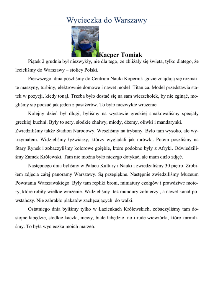 Wycieczka do Warszawy Kacper Tomiak Piątek 2 grudnia był niezwykły, nie dla tego, że zbliżały się święta, tylko dlatego, że lecieliśmy do Warszawy – stolicy Polski. Pierwszego dnia poszliśmy do Centrum Nauki Kopernik ,gdzie znajdują się rozmaite maszyny, turbiny, elektrownie domowe i nawet model Titanica. Model przedstawia statek w pozycji, kiedy tonął. Trzeba było dostać się na sam wierzchołek, by nie zginąć, mogliśmy się poczuć jak jeden z pasażerów. To było niezwykłe wrażenie. Kolejny dzień był długi, byliśmy na wystawie greckiej smakowaliśmy specjały greckiej kuchni. Były to sery, słodkie chałwy, miody, dżemy, oliwki i mandarynki. Zwiedziliśmy także Stadion Narodowy. Weszliśmy na trybuny. Było tam wysoko, ale wytrzymałem. Widzieliśmy łyżwiarzy, którzy wyglądali jak mrówki. Potem poszliśmy na Stary Rynek i zobaczyliśmy kolorowe gołębie, które podobno były z Afryki. Odwiedziliśmy Zamek Królewski. Tam nie można było niczego dotykać, ale mam dużo zdjęć. Następnego dnia byliśmy w Pałacu Kultury i Nauki i zwiedzaliśmy 30 piętro. Zrobiłem zdjęcia całej panoramy Warszawy. Są przepiękne. Następnie zwiedziliśmy Muzeum Powstania Warszawskiego. Były tam repliki broni, miniatury czołgów i prawdziwe motory, które robiły wielkie wrażenie. Widzieliśmy też mundury żołnierzy , a nawet kanał powstańczy. Nie zabrakło plakatów zachęcających do walki. Ostatniego dnia byliśmy tylko w Łazienkach Królewskich, zobaczyliśmy tam dostojne łabędzie, słodkie kaczki, mewy, białe łabędzie no i rude wiewiórki, które karmiliśmy. To była wycieczka moich marzeń.