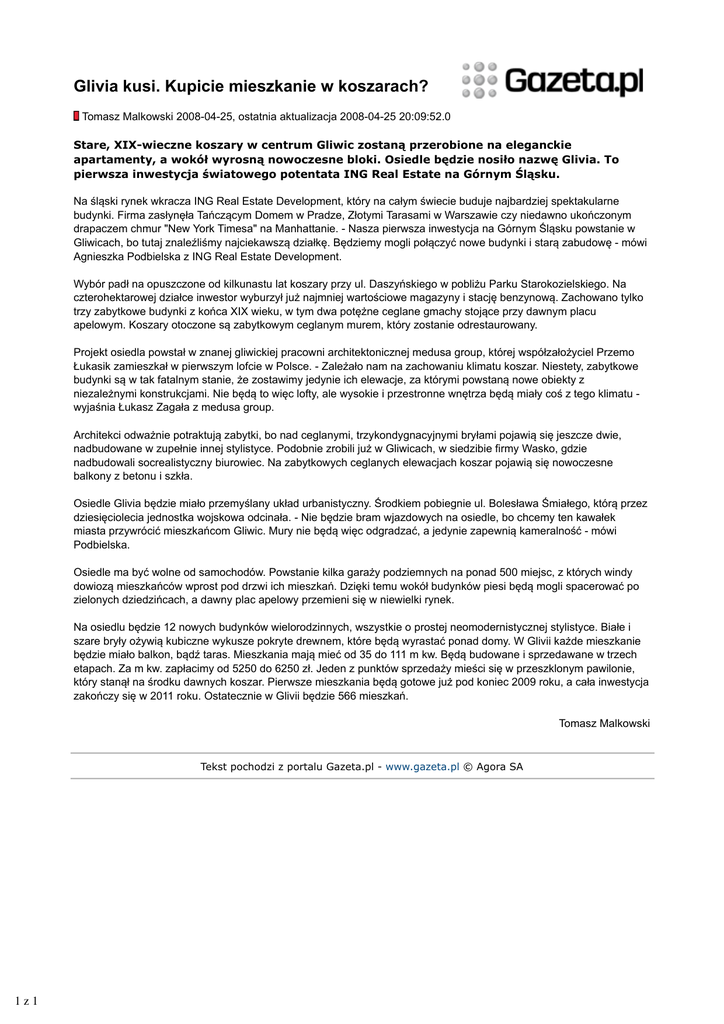 Glivia kusi. Kupicie mieszkanie w koszarach? Tomasz Malkowski 2008-04-25, ostatnia aktualizacja 2008-04-25 20:09:52.0 Stare, XIX-wieczne koszary w centrum Gliwic zostaną przerobione na eleganckie apartamenty, a wokół wyrosną nowoczesne bloki. Osiedle będzie nosiło nazwę Glivia. To pierwsza inwestycja światowego potentata ING Real Estate na Górnym Śląsku. Na śląski rynek wkracza ING Real Estate Development, który na całym świecie buduje najbardziej spektakularne budynki. Firma zasłynęła Tańczącym Domem w Pradze, Złotymi Tarasami w Warszawie czy niedawno ukończonym drapaczem chmur "New York Timesa" na Manhattanie. - Nasza pierwsza inwestycja na Górnym Śląsku powstanie w Gliwicach, bo tutaj znaleźliśmy najciekawszą działkę. Będziemy mogli połączyć nowe budynki i starą zabudowę - mówi Agnieszka Podbielska z ING Real Estate Development. Wybór padł na opuszczone od kilkunastu lat koszary przy ul. Daszyńskiego w pobliżu Parku Starokozielskiego. Na czterohektarowej działce inwestor wyburzył już najmniej wartościowe magazyny i stację benzynową. Zachowano tylko trzy zabytkowe budynki z końca XIX wieku, w tym dwa potężne ceglane gmachy stojące przy dawnym placu apelowym. Koszary otoczone są zabytkowym ceglanym murem, który zostanie odrestaurowany. Projekt osiedla powstał w znanej gliwickiej pracowni architektonicznej medusa group, której współzałożyciel Przemo Łukasik zamieszkał w pierwszym lofcie w Polsce. - Zależało nam na zachowaniu klimatu koszar. Niestety, zabytkowe budynki są w tak fatalnym stanie, że zostawimy jedynie ich elewacje, za którymi powstaną nowe obiekty z niezależnymi konstrukcjami. Nie będą to więc lofty, ale wysokie i przestronne wnętrza będą miały coś z tego klimatu wyjaśnia Łukasz Zagała z medusa group. Architekci odważnie potraktują zabytki, bo nad ceglanymi, trzykondygnacyjnymi bryłami pojawią się jeszcze dwie, nadbudowane w zupełnie innej stylistyce. Podobnie zrobili już w Gliwicach, w siedzibie firmy Wasko, gdzie nadbudowali socrealistyczny biurowiec. Na zabytkowych ceglanych elewacjach koszar pojawią się nowoczesne balkony z betonu i szkła. Osiedle Glivia będzie miało przemyślany układ urbanistyczny. Środkiem pobiegnie ul. Bolesława Śmiałego, którą przez dziesięciolecia jednostka wojskowa odcinała. - Nie będzie bram wjazdowych na osiedle, bo chcemy ten kawałek miasta przywrócić mieszkańcom Gliwic. Mury nie będą więc odgradzać, a jedynie zapewnią kameralność - mówi Podbielska. Osiedle ma być wolne od samochodów. Powstanie kilka garaży podziemnych na ponad 500 miejsc, z których windy dowiozą mieszkańców wprost pod drzwi ich mieszkań. Dzięki temu wokół budynków piesi będą mogli spacerować po zielonych dziedzińcach, a dawny plac apelowy przemieni się w niewielki rynek. Na osiedlu będzie 12 nowych budynków wielorodzinnych, wszystkie o prostej neomodernistycznej stylistyce. Białe i szare bryły ożywią kubiczne wykusze pokryte drewnem, które będą wyrastać ponad domy. W Glivii każde mieszkanie będzie miało balkon, bądź taras. Mieszkania mają mieć od 35 do 111 m kw. Będą budowane i sprzedawane w trzech etapach. Za m kw. zapłacimy od 5250 do 6250 zł. Jeden z punktów sprzedaży mieści się w przeszklonym pawilonie, który stanął na środku dawnych koszar. Pierwsze mieszkania będą gotowe już pod koniec 2009 roku, a cała inwestycja zakończy się w 2011 roku. Ostatecznie w Glivii będzie 566 mieszkań. Tomasz Malkowski Tekst pochodzi z portalu Gazeta.pl - www.gazeta.pl © Agora SA 1z1