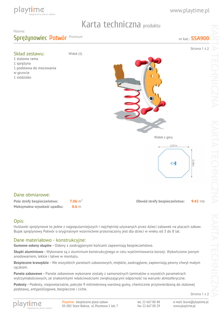 playtime www.playtime.pl bezpieczne place zabaw Sprężynowiec Potwór Premium Skład zestawu: Widok (1) nr kat.: SSA900 Strona 1 z 2 1 stalowa rama 1 sprężyna 1 podstawa do mocowania w gruncie 1 siedzisko Dane obmiarowe: Pole strefy bezpieczeństwa: Maksymalna wysokość upadku: 7.06 m2 0.6 m Obwód strefy bezpieczeństwa: 9.42 mb Huśtawki sprężynowe to jedne z najpopularniejszych i najchętniej używanych przez dzieci zabawek na placach zabaw. Bujak sprężynowy Potwór o oryginalnym wzornictwie przeznaczony jest dla dzieci w wieku od 3 do 8 lat. Dane materiałowo - konstrukcyjne: Gumowe osłony słupów - Osłony z zaokrąglonymi końcami zapewniają bezpieczeństwo. Słupki aluminiowe - Wykonane są z aluminium konstrukcyjnego w celu wyeliminowania korozji. Wykończone jasnym anodowaniem, lekkie i łatwe w montażu. Bezpieczne krawędzie - We wszystkich panelach zabawowych, miękkie, zaokrąglone, zapewniają pewny chwyt małym rączkom. Panele zabawowe - Panele zabawowe wykonane zostały z samonośnych laminatów o wysokich parametrach wytrzymałościowych, ze znakomitymi właściwościami zwiększającymi odporność na warunki atmosferyczne. Podesty - Podesty, niepowtarzalne, pokryte 9 milimetrową warstwą gumy, chemicznie przytwierdzoną do stalowej podstawy, antypoślizgowe, bezpieczne i ciche. Strona 1 z 2 playtime bezpieczne place zabaw Playtime - bezpieczne place zabaw 05-082 Stare Babice, ul. Pocztowa 1 lok. 7 tel. 22 667 00 48 fax 22 667 00 29 e-mail: [email protected] www.playtime.pl KARTA TECHNICZNA Opis: KARTA TECHNICZNA Widok z góry KARTA TECHNICZNA Karta techniczna produktu Nazwa: playtime www.playtime.pl bezpieczne place zabaw Sprężynowiec Potwór Premium nr kat.: SSA900 Strona 2 z 2 Elementy złączne - Elementy złączne, łatwe w użyciu, wysokiej jakości z zabezpieczeniami antysabotażowymi. Siatki i liny - Siatki i liny do wspinaczki wykonane są ze skręconych polipropylenowych włókien, wzmacniane stalowym rdzeniem, zakończenia zabezpieczone są aluminiowymi tulejkami i złączkami z nierdzewnej stali lub łącznikami typu T. Zestaw łożysk - Zestaw łożysk (w obrotnicach) składających się z wykonanych z wysoką precyzją łożysk kulkowych z obudową, ukrytych w belkach pionowych. Chroni to łożyska przed innymi elementami i czyni je antysabotażowymi. Stalowe slupki - Stalowe słupki galwanizowane głęboko na gorąco wewnątrz i na zewnątrz, by zapewnić długie użytkowanie nie wymagające konserwacji. Żłobkowane wkładki o wysokich momentach dokręcania, wraz z odpornymi na uderzenia plastikowymi osłonami, osłaniają śruby umożliwiając montaż antysabotażowy. KARTA TECHNICZNA Karta techniczna produktu Nazwa: KARTA TECHNICZNA playtime bezpieczne place zabaw Powered by TCPDF (www.tcpdf.org) Playtime - bezpieczne place zabaw 05-082 Stare Babice, ul. Pocztowa 1 lok. 7 tel. 22 667 00 48 fax 22 667 00 29 e-mail: [email protected] www.playtime.pl KARTA TECHNICZNA Strona 2 z 2