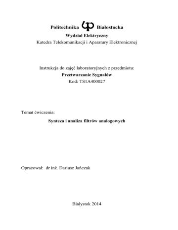 Politechnika Białostocka Wydział Elektryczny Katedra Telekomunikacji i Aparatury Elektronicznej Instrukcja do zajęć laboratoryjnych z przedmiotu: Przetwarzanie Sygnałów Kod: TS1A400027 Temat ćwiczenia: Synteza i analiza filtrów analogowych Opracował: dr inż. Dariusz Jańczak Białystok 2014 Przetwarzanie Sygnałów - laboratorium Temat: Synteza i analiza filtrów analogowych 1. Cel ćwiczenia Celem ćwiczenia jest poszerzenie wiedzy studentów oraz nabycie przez nich umiejętności z zakresu syntezy i analizy filtrów analogowych. W ramach zajęć studenci ugruntowują umiejętność sformułowania specyfikacji prostych analogowych układów przetwarzania sygnałów oraz nabywają podstawowe umiejętności z zakresu ich syntezy i weryfikacji przy wykorzystaniu narzędzi komputerowego wspomagania projektowania. Studenci zdobywają umiejętność realizacji sprzętowej prostych analogowych układów przetwarzania sygnałów oraz umiejętność wykonania pomiarów ich charakterystyk. Studenci doskonalą umiejętność opracowania dokumentacji dotyczącej realizacji zadania inżynierskiego obejmującej omówienie wyników. 2. Zagadnienia do opracowania przed przystąpieniem do zajęć 2.1 Przed przystąpieniem do zajęć należy opracować (na podstawie materiałów z wykładu "Przetwarzanie Sygnałów 1") następujące zagadnienia teoretyczne: - aproksymacje analogowe filtrów idealnych: Butterwortha, Czebyszewa, eliptyczny – charakterystyki, parametry; - znaczenie charakterystyk częstotliwościowych (amplitudowych i fazowych); - metody wyznaczania charakterystyk częstotliwościowych (w sposób sprzętowy i teoretyczny). 2.2 Przed przystąpieniem do zajęć należy wykonać następujące ćwiczenie: - Zapoznać się z programem FilterCAD firmy Linear Technology służącym do projektowania filtrów analogowych. W tym celu wstępnie zaprojektować filtr o podanych przez prowadzącego parametrach wykorzystując układ filtra z przełączanymi pojemnościami LTC1060. Należy wyznaczyć dołączane rezystancje zewnętrzne oraz wyznaczyć charakterystyki częstotliwościowe i czasowe. 3. Program ćwiczeń 3.1. Dokonać syntezy filtra dolnoprzepustowego o podanym przez prowadzącego typie i parametrach, wykorzystując układ filtra z przełączanymi pojemnościami LTC1060. 3.2. Dokonać realizacji sprzętowej zaprojektowanego filtra poprzez dołączenie odpowiednich rezystancji zewnętrznych do układu LTC1060 wykorzystując laboratoryjny moduł filtrów. 3.3. Zbadać charakterystyki częstotliwościowe otrzymanych filtrów. Porównać z charakterystykami obliczonymi teoretycznie. 3.4. Zbadać odpowiedzi impulsowe i skokowe otrzymanych filtrów. Porównać z charakterystykami obliczonymi teoretycznie. 3.5. Zbadać odpowiedzi otrzymanych filtrów na sygnały prostokątne o następujących częstotliwościach: 0,01fp;. 0,1fp; 0,2fp; 0,3fp; 0,7fp (gdzie fp to częstotliwość graniczna pasma przepustowego filtra). Do analizy uzyskanych wyników pomocne będą informacje zamieszczone w Dodatku 2. 3.6. (dodatkowe) Przeprowadzić badania z punktów 3.1 – 3.3 dla filtra środkowoprzepustowego o parametrach podanych przez prowadzącego. 4. Realizacja ćwiczeń 4.1 Projekt filtra analogowego o podanych przez prowadzącego parametrach należy wykonać wykorzystując program FilterCAD firmy Linear Technology. Uwzględniając konstrukcję stanowiska laboratoryjnego, w projekcie należy przyjąć poniższą konfigurację układu filtrów: - układ z przełączaną pojemnością "Switched Capacitor" - typ układu: 1060 - zasilanie +/- 5V - podział 100:1 lub 50:1 - zegar - do wyboru: 250kHz, 125kHz, 72,5kHz W dodatku 1. zamieszczono opis programu FilterCAD wraz z przykładem procesu projektowego filtra analogowego. 4.2 Filtry realizowane są z wykorzystaniem laboratoryjnego modułu z układem LTC1060 (rys. 1). W celu realizacji filtra należy ustawić uzyskane w projekcie wartości rezystorów i wykonać odpowiednie połączenia. Należy również pamiętać o ustawieniu przy pomocy zworek odpowiedniej częstotliwości pracy zegara (250, 125, 72,5kHz) oraz wartości podziału (100:1, 50:1) (patrz rys. 1). 72,5 kHz 125 kHz 250 kHz 100:1 50:1 Wy We LTC1060 We Wy Rys. 1. Laboratoryjny moduł filtrów z układem LTC1060 W dodatkowym pliku PS_L1_LTC1060.pdf zamieszczono fragmenty dokumentacji układu filtra analogowego LTC1060 firmy Linear Technology (wyjątki z: Linear Technology, LTC1060 Universal Dual Filter Building Block). 4.3 Badania eksperymentalne należy przeprowadzić w układzie zestawionym według schematu przedstawionego na rys. 2. oscyloskop filtr analogowy LTC1060 We Wy Y1 Y2 generator Wy Rys. 2. Schemat połączeń stanowiska laboratoryjnego DSP 5. Sprawozdanie powinno zawierać: - wymagania projektowe, skrócony opis syntezy i implementacji filtra; - wyznaczone eksperymentalnie oraz wyznaczone teoretycznie (korzystając z programu FilterCAD) charakterystyki amplitudowe i fazowe badanych filtrów; - wyznaczone eksperymentalnie oraz teoretycznie odpowiedzi czasowe badanych filtrów; - porównanie charakterystyk obliczonych analitycznie oraz wyznaczonych eksperymentalnie; - uwagi i wnioski nasuwające się w trakcie wykonywania ćwiczenia. 6. Wymagania BHP W trakcie realizacji programu ćwiczenia należy przestrzegać zasad omówionych we wstępie do ćwiczeń, zawartych w: „Regulaminie porządkowym w laboratorium” oraz w „Instrukcji obsługi urządzeń elektronicznych znajdujących się w laboratorium z uwzględnieniem przepisów BHP”. Regulamin i instrukcja są dostępne w pomieszczeniu laboratoryjnym w widocznym miejscu. 7. Literatura 1. Linear Technology, LTC1060 Universal Dual Filter Building Block 2. Wojciechowski J. M., Sygnały i systemy, WKŁ, Warszawa, 2008. 3. Lyons R., Wprowadzenie do cyfrowego przetwarzania sygnałów, WKŁ, Warszawa, 2010. 4. Zieliński T., Cyfrowe przetwarzanie sygnałów: od teorii do zastosowań, WKŁ, Warszawa, 2009. 5. Szabatin J., Podstawy t
