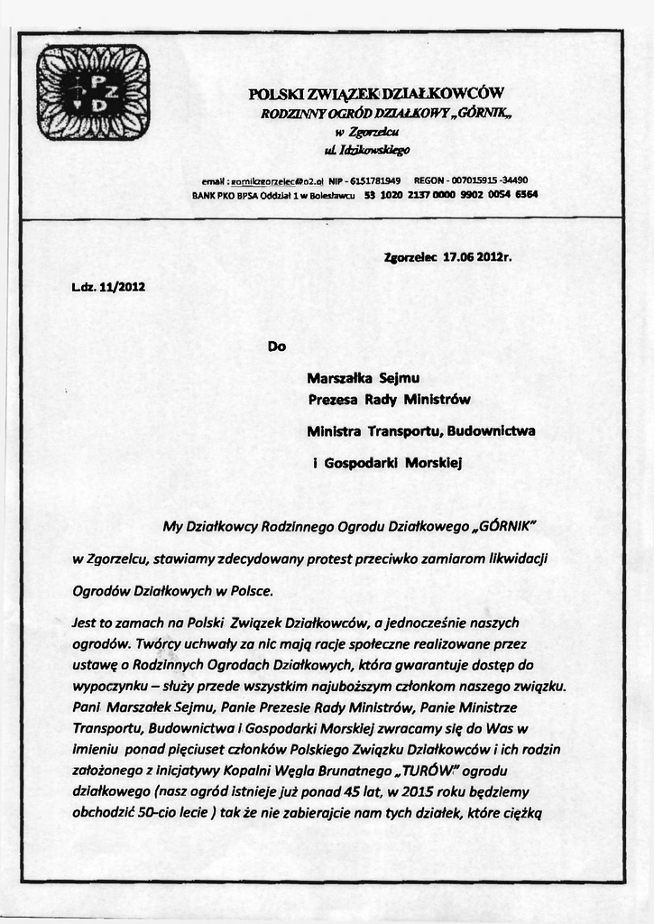 POLSKI ZWIĄZEK DZIAŁKOWCÓW RODZIMY OGRÓD DZIAŁKOWY „GÓRNIK^ w Zgorzelcu uL Idzikowskiego email: gomilggoraelecgo2.nl NIP - 6151781949 BANK PKO BPSA Oddział 1 w Bolesławcu REGON - 007015915-34490 53 1 0 2 0 2 1 3 7 0 0 0 0 9 9 0 2 0 0 5 4 6 5 6 4 Zgorzelec 17.06 2012r. Ldz. 11/2012 Do Marszałka Sejmu Prezesa Rady Ministrów Ministra Transportu, Budownictwa i Gospodarki Morskiej My Działkowcy Rodzinnego Ogrodu Działkowego „GÓRNIK" w Zgorzelcu, stawiamy zdecydowany protest przeciwko zamiarom likwidacji Ogrodów Działkowych w Polsce. Jest to zamach na Polski Związek Działkowców, a jednocześnie naszych ogrodów. Twórcy uchwały za nic mają racje społeczne realizowane przez ustawę o Rodzinnych Ogrodach Działkowych, która gwarantuje dostęp do wypoczynku - służy przede wszystkim najuboższym członkom naszego związku. Pani Marszałek Sejmu, Panie Prezesie Rady Ministrów, Panie Ministrze Transportu, Budownictwa i Gospodarki Morskiej zwracamy się do Was w imieniu ponad pięciuset członków Polskiego Związku Działkowców i ich rodzin założonego z inicjatywy Kopalni Węgla Brunatnego „TURÓW" ogrodu działkowego (nasz ogród istnieje już ponad 45 lat, w 2015 roku będziemy obchodzić 50-cio lecie ) także nie zabierajcie nam tych działek, które ciężką pracq je stworzyliśmy. Większość z nas jest już na emeryturze, ale nawet 70-cio latek czy 80-cio latek, a tacy sq potrafi się zmobilizować i z radością pracować na swojej działce. Mamy niskie emerytury-działka jest naszym żywicielem a nadwyżki naszych plonów z działek sprzedajemy mieszkańcom naszego osiedla w Zgorzelcu. Większość z nas przy zapowiadanych zmianach nie będzie stać na wykupienie tego kawałka tej ziemi. Cytuję słowa Jana Pawła II „TEJ ZIEMI" Ziemia jest po to żeby ją obsiewać^sadzić i zbierać plony, a nie szansą wzbogacenia się. Przykładem są afery gruntowe. Dotychczasowa Ustawa o Rodzinnych Ogrodach Działkowych jest dobra i nie wymaga żadnych zmian. Pozwólcie nam działkowcom u schyłku życia cieszyć się „kawałkiem zielonej radości" i czuć się jeszcze potrzebnymi. Apelujemy - zajmijcie się likwidacją bezrobocia w Polsce a Rodzinnym Ogrodom Działkowym dajcie spokój. Zajmijcie się też likwidacją nieużytków, jest ich setki tysięcy hektarów. W imieniu Działkowców Rodzinnego Ogrodu Działkowego „GÓRNIK' w Zgorzelcu, oraz członków Zarządu ROD Z poważaniem KRS S^d MJonowy dla ifl.lt. Wareuwy w Warszawki, XH Wydział Gospodarczy Kratowego RejeRra Sadowego nr KRS 0002 93 886