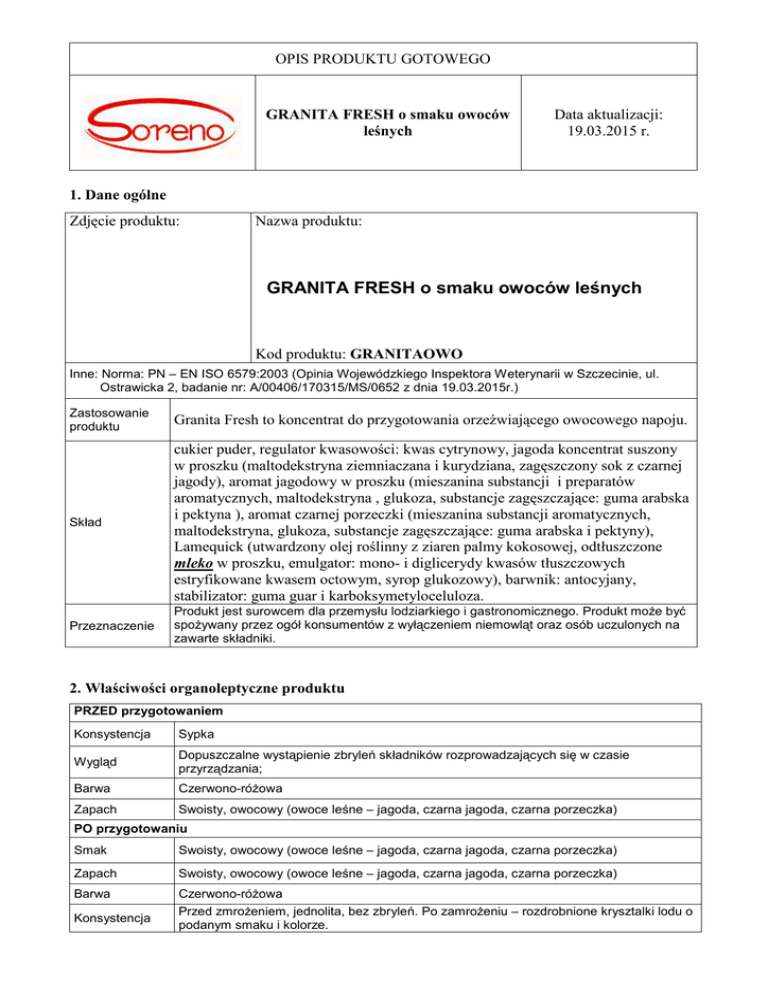 OPIS PRODUKTU GOTOWEGO GRANITA FRESH o smaku owoców leśnych Data aktualizacji: 19.03.2015 r. 1. Dane ogólne Zdjęcie produktu: Nazwa produktu: GRANITA FRESH o smaku owoców leśnych Kod produktu: GRANITAOWO Inne: Norma: PN – EN ISO 6579:2003 (Opinia Wojewódzkiego Inspektora Weterynarii w Szczecinie, ul. Ostrawicka 2, badanie nr: A/00406/170315/MS/0652 z dnia 19.03.2015r.) Zastosowanie produktu Granita Fresh to koncentrat do przygotowania orzeźwiającego owocowego napoju. Skład cukier puder, regulator kwasowości: kwas cytrynowy, jagoda koncentrat suszony w proszku (maltodekstryna ziemniaczana i kurydziana, zagęszczony sok z czarnej jagody), aromat jagodowy w proszku (mieszanina substancji i preparatów aromatycznych, maltodekstryna , glukoza, substancje zagęszczające: guma arabska i pektyna ), aromat czarnej porzeczki (mieszanina substancji aromatycznych, maltodekstryna, glukoza, substancje zagęszczające: guma arabska i pektyny), Lamequick (utwardzony olej roślinny z ziaren palmy kokosowej, odtłuszczone mleko w proszku, emulgator: mono- i diglicerydy kwasów tłuszczowych estryfikowane kwasem octowym, syrop glukozowy), barwnik: antocyjany, stabilizator: guma guar i karboksymetyloceluloza. Przeznaczenie Produkt jest surowcem dla przemysłu lodziarkiego i gastronomicznego. Produkt może być spożywany przez ogół konsumentów z wyłączeniem niemowląt oraz osób uczulonych na zawarte składniki. 2. Właściwości organoleptyczne produktu PRZED przygotowaniem Konsystencja Sypka Wygląd Dopuszczalne wystąpienie zbryleń składników rozprowadzających się w czasie przyrządzania; Barwa Czerwono-różowa Zapach Swoisty, owocowy (owoce leśne – jagoda, czarna jagoda, czarna porzeczka) PO przygotowaniu Smak Swoisty, owocowy (owoce leśne – jagoda, czarna jagoda, czarna porzeczka) Zapach Swoisty, owocowy (owoce leśne – jagoda, czarna jagoda, czarna porzeczka) Barwa Czerwono-różowa Przed zmrożeniem, jednolita, bez zbryleń. Po zamrożeniu – rozdrobnione krysztalki lodu o podanym smaku i kolorze. Konsystencja 3. Właściwości fizykochemiczne produktu Ołów nie więcej niż 0,30 mg/kg Obecność metali szkodliwych dla zdrowia Kadm nie więcej niż 0,10 mg/kg Rtęć nie więcej niż 0,02 mg/kg Arsen nie więcej niż 0,20 mg/kg Obecność zanieczyszczeń Niedopuszczalna 4. Właściwości mikrobiologiczne produktu Ogólna liczba drobnoustrojów w 1g Gronkowce chorobotwórcze w 0,1g Pałeczki Salmonella w 25g 5 Nie więcej niż: 2 x 10 Nieobecne Nieobecne 5. Opakowanie produktu Rodzaj opakowania Masa netto w opakowaniu Paletyzacja Opakowania kartonowe zamknięte (zaklejone) 1 kg 100 x 6 kg ( 1 kg x 6) Opakowania, które mają bezpośrednią styczność z produktami są przeznaczone do bezpośredniego kontaktu z żywnością. 6. Przechowywanie produktu Warunki przechowywania Opakowania kartonowe zamknięte (zaklejone), szczelne, zabezpieczone przed dostępem wilgoci, powietrza i światła, w pomieszczeniach suchych, czystych i chłodnych, wolnych od szkodników. Okres przechowywania 9 miesięcy od daty produkcji 7. Oznakowanie produktu Na etykiecie powinny znaleźć się następujące informacje: - nazwa produktu, - nazwa i adres producenta, - skład, - przeznaczenie - zawartość netto, - przepis przygotowania - data ważności, - oznaczenie partii produkcyjnej - sposób i warunki przechowywania 8. Transport Odbywa się za pomocą transportu środków spożywczych, w warunkach zapewniających właściwe utrzymanie jakości produktu. 9. Oświadczenie GMO Niniejszym oświadczamy, że nie podlega modyfikacją genetycznym oraz nie zawiera składników genetycznie modyfikowanych. 10. Składniki alergenne produktu Deklaracja o obecności składników alergennych Dyrektywa Komisji 2000/13/WE z późniejszymi zmianami Produkt / surowiec zawiera Lp. Nazwa składnika Objaśnienie / komentarz TAK NIE Zboża zawierające gluten (tj. pszenica, żyto, jęczmień, owies zwyczajny, pszenica oplewiona / 1. X orkisz, kamut lub ich szczepy hybrydowe) i produkty pochodne 2. Skorupiaki i produkty pochodne X 3. Jaja i produkty pochodne X 4. Ryby i produkty pochodne X Orzeszki ziemne / orzeszki arachidowe i produkty pochodne 6. Nasiona soi i produkty pochodne 5. 7. Mleko i z laktozą) produkty pochodne (łącznie X X X Orzechy, tj. migdał, orzech laskowy, orzech włoski, 8. nerkowiec, orzech pekan, orzech brazylijski, pistacja, orzech pistacjowy, orzech makdamia. X 9. Seler i produkty pochodne X 10. Gorczyca i produkty pochodne X 11. Nasiona sezamu i produkty pochodne X 12. Dwutlenek siarki i siarczyny w stężeniach powyżej 10 mg/kg lub 10 mg/l w przeliczeniu na SO2 X 13. Łubin i produkty pochodne X 14. Mięczaki i produkty pochodne X Może zawierać śladowe ilości: jaj, soi, orzechów, sezamu i łubinu 11. Wartość energetyczna i odżywcza produktu Wartość energetyczna Tłuszcze W tym kwasy tłuszczowe nasycone 370 kcal / 1535 kJ 1,0 g 0,6 g Białko 3,8 g Węglowodany 84,4 g Wartości obliczone na podstawie deklaracji dostawców i tabel wartości odżywczych IŻIŻ. Wartości te podlegają biologicznym W tym cukier 41,8 g Błonnik 1,4 g Sód 0,3 g i produkcyjno – technicznym naturalnym wahaniom. Dokument został przygotowany w wersji elektronicznej i jest ważny bez podpisu. Informacje zawarte w dokumencie zostały opracowane na podstawie danych uzyskanych od naszych dostawców; naszej wiedzy i doświadczeniu oraz obowiązujących przepisach prawa. Wszystkie dane są aktualne w chwili obecnej, jednak dane te mogą ulec zmianie w zależności od właściwości surowców użytych w produkcji. Niniejszy dokument ma charakter informacyjny.