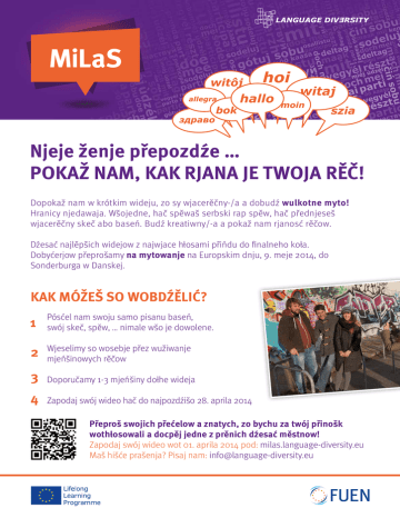 Njeje ženje přepozdźe … POKAŽ NAM, KAK RJANA JE TWOJA RĚČ! Dopokaž nam w krótkim wideju, zo sy wjacerěčny-/a a dobudź wulkotne myto! Hranicy njedawaja. Wšojedne, hač spěwaš serbski rap spěw, hač přednjeseš wjacerěčny skeč abo baseń. Budź kreatiwny/-a a pokaž nam rjanosć rěčow. Dźesać najlěpšich widejow z najwjace hłosami přińdu do finalneho koła. Dobyćerjow přeprošamy na mytowanje na Europskim dnju, 9. meje 2014, do Sonderburga w Danskej. KAK MÓŽEŠ SO WOBDŹĚLIĆ? 1 Pósćel nam swoju samo pisanu baseń, swój skeč, spěw, … nimale wšo je dowolene. 2 Wjeselimy so wosebje přez wužiwanje mjeńšinowych rěčow 3 Doporučamy 1-3 mjeńšiny dołhe wideja 4 Zapodaj swój wideo hač do najpozdźišo 28. aprila 2014 Přeproš swojich přećelow a znatych, zo bychu za twój přinošk wothłosowali a docpěj jedne z prěnich dźesać městnow! Zapodaj swój wideo wot 01. aprila 2014 pod: milas.language-diversity.eu Maš hišće prašenja? Pisaj nam: [email protected]