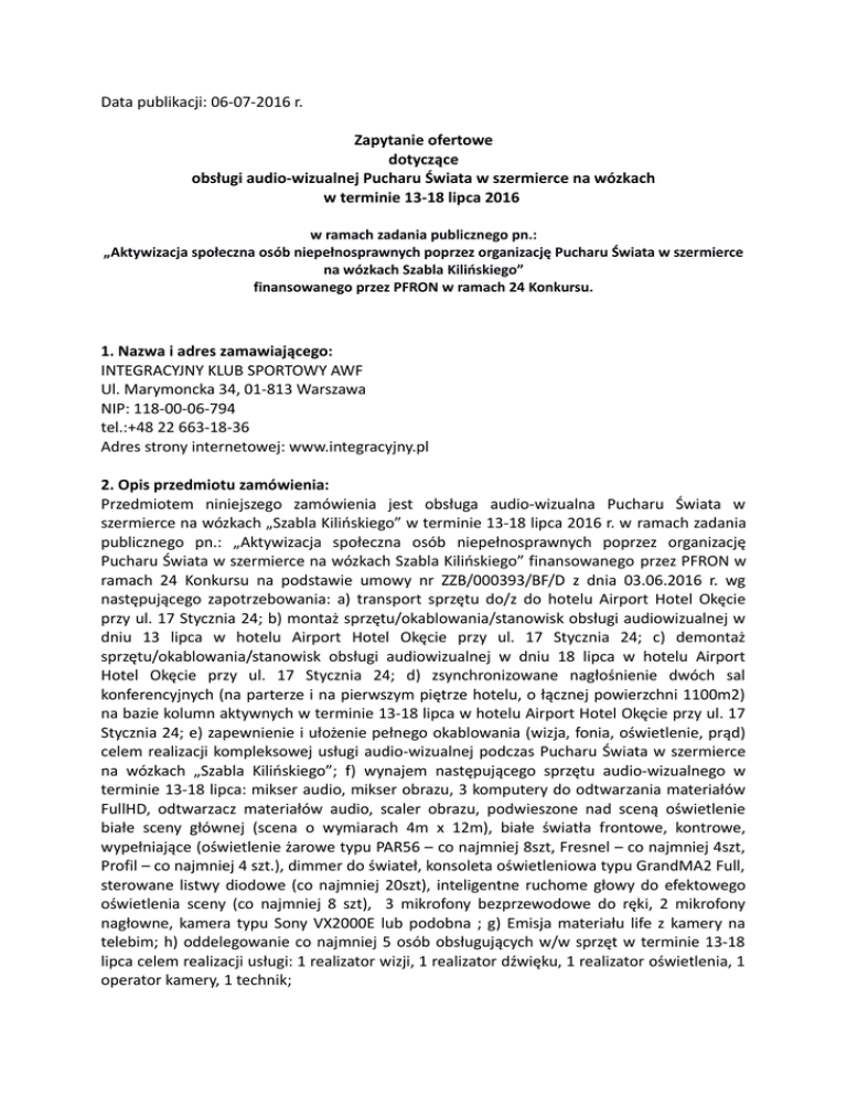 Data publikacji: 06-07-2016 r. Zapytanie ofertowe dotyczące obsługi audio-wizualnej Pucharu Świata w szermierce na wózkach w terminie 13-18 lipca 2016 w ramach zadania publicznego pn.: „Aktywizacja społeczna osób niepełnosprawnych poprzez organizację Pucharu Świata w szermierce na wózkach Szabla Kilińskiego” finansowanego przez PFRON w ramach 24 Konkursu. 1. Nazwa i adres zamawiającego: INTEGRACYJNY KLUB SPORTOWY AWF Ul. Marymoncka 34, 01-813 Warszawa NIP: 118-00-06-794 tel.:+48 22 663-18-36 Adres strony internetowej: www.integracyjny.pl 2. Opis przedmiotu zamówienia: Przedmiotem niniejszego zamówienia jest obsługa audio-wizualna Pucharu Świata w szermierce na wózkach „Szabla Kilińskiego” w terminie 13-18 lipca 2016 r. w ramach zadania publicznego pn.: „Aktywizacja społeczna osób niepełnosprawnych poprzez organizację Pucharu Świata w szermierce na wózkach Szabla Kilińskiego” finansowanego przez PFRON w ramach 24 Konkursu na podstawie umowy nr ZZB/000393/BF/D z dnia 03.06.2016 r. wg następującego zapotrzebowania: a) transport sprzętu do/z do hotelu Airport Hotel Okęcie przy ul. 17 Stycznia 24; b) montaż sprzętu/okablowania/stanowisk obsługi audiowizualnej w dniu 13 lipca w hotelu Airport Hotel Okęcie przy ul. 17 Stycznia 24; c) demontaż sprzętu/okablowania/stanowisk obsługi audiowizualnej w dniu 18 lipca w hotelu Airport Hotel Okęcie przy ul. 17 Stycznia 24; d) zsynchronizowane nagłośnienie dwóch sal konferencyjnych (na parterze i na pierwszym piętrze hotelu, o łącznej powierzchni 1100m2) na bazie kolumn aktywnych w terminie 13-18 lipca w hotelu Airport Hotel Okęcie przy ul. 17 Stycznia 24; e) zapewnienie i ułożenie pełnego okablowania (wizja, fonia, oświetlenie, prąd) celem realizacji kompleksowej usługi audio-wizualnej podczas Pucharu Świata w szermierce na wózkach „Szabla Kilińskiego”; f) wynajem następującego sprzętu audio-wizualnego w terminie 13-18 lipca: mikser audio, mikser obrazu, 3 komputery do odtwarzania materiałów FullHD, odtwarzacz materiałów audio, scaler obrazu, podwieszone nad sceną oświetlenie białe sceny głównej (scena o wymiarach 4m x 12m), białe światła frontowe, kontrowe, wypełniające (oświetlenie żarowe typu PAR56 – co najmniej 8szt, Fresnel – co najmniej 4szt, Profil – co najmniej 4 szt.), dimmer do świateł, konsoleta oświetleniowa typu GrandMA2 Full, sterowane listwy diodowe (co najmniej 20szt), inteligentne ruchome głowy do efektowego oświetlenia sceny (co najmniej 8 szt), 3 mikrofony bezprzewodowe do ręki, 2 mikrofony nagłowne, kamera typu Sony VX2000E lub podobna ; g) Emisja materiału life z kamery na telebim; h) oddelegowanie co najmniej 5 osób obsługujących w/w sprzęt w terminie 13-18 lipca celem realizacji usługi: 1 realizator wizji, 1 realizator dźwięku, 1 realizator oświetlenia, 1 operator kamery, 1 technik; 3. Zapytanie dotyczy kodu CPV: 79952000-2 4. Zadania po stronie Wykonawcy złożenie w terminie oferty na formularzu załączonym do ogłoszenia (załącznik nr 1) złożenie w terminie załącznika nr 2, Wykonawca ma prawo złożyć tylko jedną ofertę, Wykonawca jest związany złożoną ofertą przez okres 30 dni, bieg terminu związania ofertą rozpoczyna się wraz z upływem terminu składania ofert, Wykonawca może, przed upływem terminu składania ofert, zmienić lub wycofać ofertę, Zamawiający nie dopuszcza możliwości udziału w postępowaniu firm pośredniczących. 5. Zadania po stronie Zamawiającego uregulowanie zobowiązania wynikającego z wystawionej na w/w przedmiot faktury we wskazanym terminie. 6. Termin i miejsce wykonania zamówienia Przedmiot zamówienia należy wykonać w terminie 13-18 lipca 2016 r. 7. Warunki udziału w postępowaniu oraz dokumenty wymagane w celu spełnienia warunków Wymagania formalne wobec Oferenta/Wykonawcy: posiada uprawnienia do wykonywania określonej działalności lub czynności, jeżeli ustawy nakładają obowiązek posiadania takich uprawnień, posiada wpis do Ewidencji Działalności Gospodarczej lub Krajowego Rejestru Sądowego; posiada niezbędną wiedzę i doświadczenie oraz potencjał techniczny, a także dysponuje osobami zdolnymi do wykonania zamówienia; znajduje się w sytuacji ekonomicznej i finansowej zapewniającej wykonanie zamówienia; nie jest podmiotem powiązanym z Zamawiającym osobowo lub kapitałowo. Przez powiązania kapitałowe lub osobowe rozumie się wzajemne powiązania między Zamawiającym lub osobami wykonującymi w imieniu Zamawiającego czynności związane z przygotowaniem i przeprowadzeniem procedury wyboru wykonawcy a Wykonawcą, polegające w szczególności na: 1. uczestniczeniu w spółce jako wspólnik spółki cywilnej lub spółki osobowej; 2. posiadaniu udziałów lub co najmniej 10 % akcji; 2 3. pełnieniu funkcji członka organu nadzorczego lub zarządzającego, prokurenta, pełnomocnika; 4. pozostawaniu w związku małżeńskim, w stosunku pokrewieństwa lub powinowactwa w linii prostej, pokrewieństwa lub powinowactwa w linii bocznej do drugiego stopnia lub w stosunku przysposobienia, opieki lub kurateli dysponuje potencjałem technicznym, organizacyjnym i merytorycznym niezbędnym do wykonania usługi. zobowiązuje się w ramach podpisanej umowy do przechowywania w sposób zapewniający dostępność, poufność i bezpieczeństwo oraz udostępnienia kontroli dokumentacji związanej z niniejszym zleceniem do dnia 31 grudnia 2021 r. Potwierdzenie powyższych warunków ujęte zostało w załączniku nr 2 do niniejszego zapytania. 8. Waluta i warunki dotyczące rozliczeń związanych z realizacją niniejszego zamówienia Ceny oraz wartość zbiorcza zamówienia powinny być podane w złotych polskich (netto i brutto). Zamawiający nie wyraża zgody na płatność zaliczkową. Wymagany termin płatności FV nie krótszy niż 14 dni. 9. Opis sposobu przygotowania oferty: Oferta powinna być sporządzona na formularzu ofertowym, zgodnie ze wzorem z