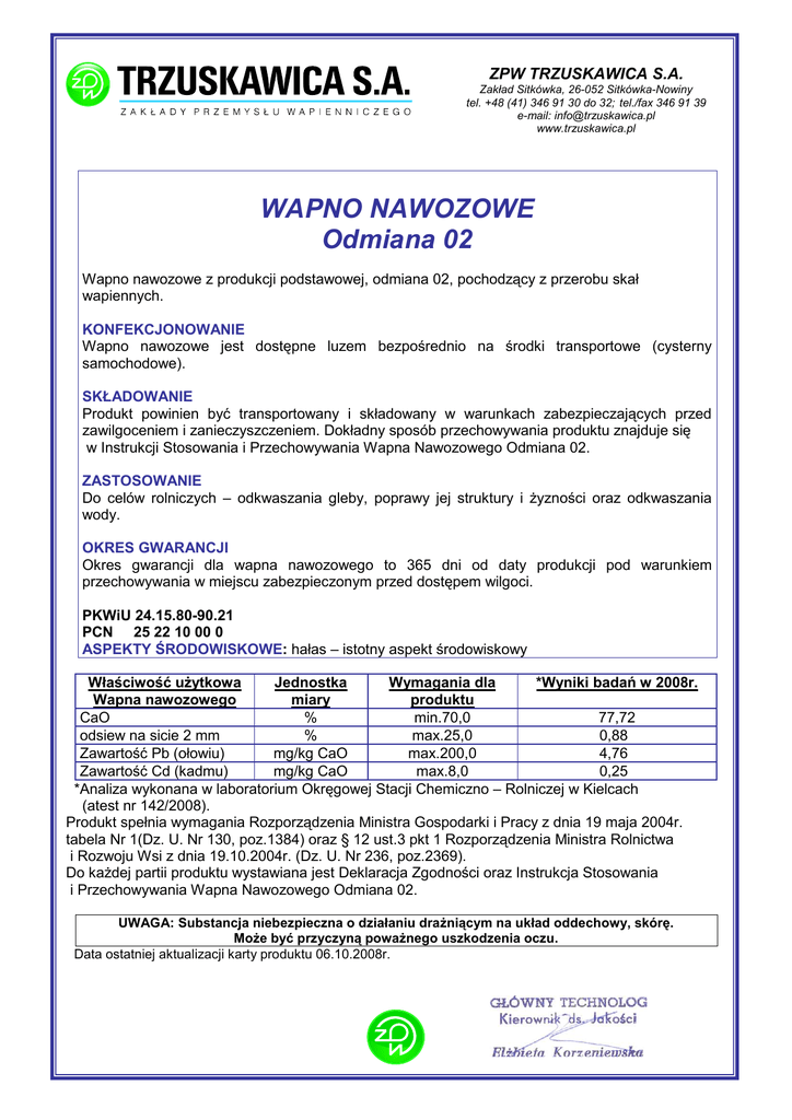 ZPW TRZUSKAWICA S.A. Zakład Sitkówka, 26-052 Sitkówka-Nowiny tel. +48 (41) 346 91 30 do 32; tel./fax 346 91 39 e-mail: [email protected] www.trzuskawica.pl WAPNO NAWOZOWE Odmiana 02 Wapno nawozowe z produkcji podstawowej, odmiana 02, pochodzący z przerobu skał wapiennych. KONFEKCJONOWANIE Wapno nawozowe jest dostępne luzem bezpośrednio na środki transportowe (cysterny samochodowe). SKŁADOWANIE Produkt powinien być transportowany i składowany w warunkach zabezpieczających przed zawilgoceniem i zanieczyszczeniem. Dokładny sposób przechowywania produktu znajduje się w Instrukcji Stosowania i Przechowywania Wapna Nawozowego Odmiana 02. ZASTOSOWANIE Do celów rolniczych – odkwaszania gleby, poprawy jej struktury i Ŝyzności oraz odkwaszania wody. OKRES GWARANCJI Okres gwarancji dla wapna nawozowego to 365 dni od daty produkcji pod warunkiem przechowywania w miejscu zabezpieczonym przed dostępem wilgoci. PKWiU 24.15.80-90.21 PCN 25 22 10 00 0 ASPEKTY ŚRODOWISKOWE: hałas – istotny aspekt środowiskowy Właściwość uŜytkowa Jednostka Wymagania dla *Wyniki badań w 2008r. Wapna nawozowego miary produktu CaO % min.70,0 77,72 odsiew na sicie 2 mm % max.25,0 0,88 Zawartość Pb (ołowiu) mg/kg CaO max.200,0 4,76 Zawartość Cd (kadmu) mg/kg CaO max.8,0 0,25 *Analiza wykonana w laboratorium Okręgowej Stacji Chemiczno – Rolniczej w Kielcach (atest nr 142/2008). Produkt spełnia wymagania Rozporządzenia Ministra Gospodarki i Pracy z dnia 19 maja 2004r. tabela Nr 1(Dz. U. Nr 130, poz.1384) oraz § 12 ust.3 pkt 1 Rozporządzenia Ministra Rolnictwa i Rozwoju Wsi z dnia 19.10.2004r. (Dz. U. Nr 236, poz.2369). Do kaŜdej partii produktu wystawiana jest Deklaracja Zgodności oraz Instrukcja Stosowania i Przechowywania Wapna Nawozowego Odmiana 02. UWAGA: Substancja niebezpieczna o działaniu draŜniącym na układ oddechowy, skórę. MoŜe być przyczyną powaŜnego uszkodzenia oczu. Data ostatniej aktualizacji karty produktu 06.10.2008r.