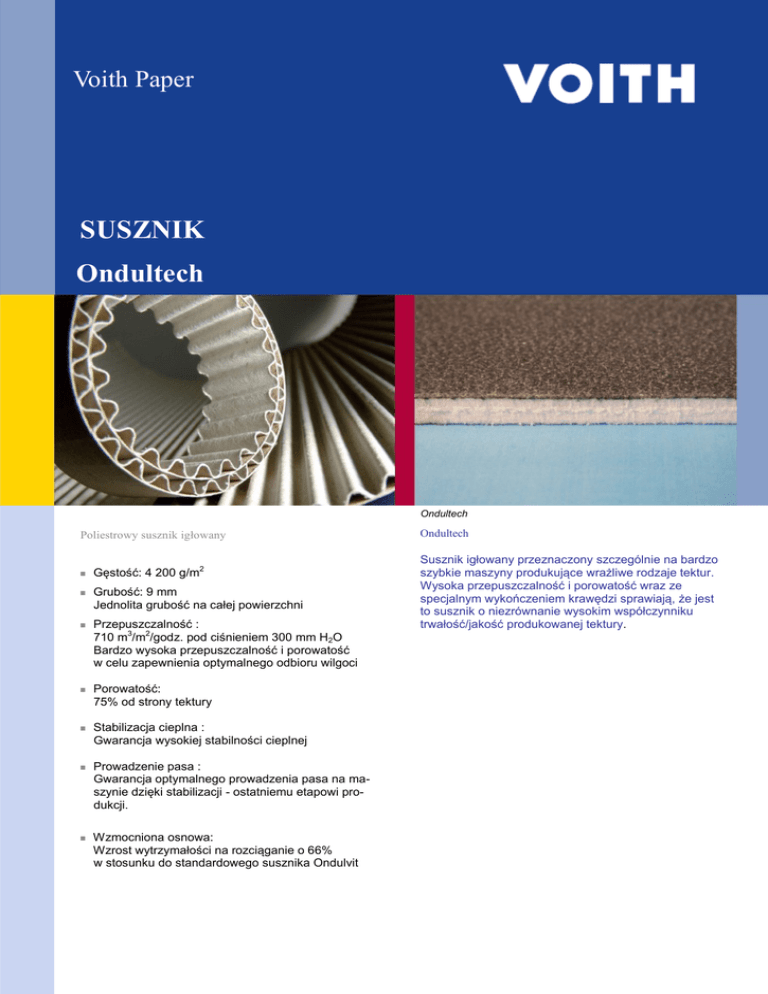 Voith Paper SUSZNIK Ondultech Ondultech Poliestrowy susznik igłowany Gęstość: 4 200 g/m2 Grubość: 9 mm Jednolita grubość na całej powierzchni Przepuszczalność 3 2 : 710 m /m /godz. pod ciśnieniem 300 mm H2O Bardzo wysoka przepuszczalność i porowatość w celu zapewnienia optymalnego odbioru wilgoci Porowatość: 75% od strony tektury Stabilizacja cieplna : Gwarancja wysokiej stabilności cieplnej Prowadzenie pasa : Gwarancja optymalnego prowadzenia pasa na maszynie dzięki stabilizacji - ostatniemu etapowi produkcji. Wzmocniona osnowa: Wzrost wytrzymałości na rozciąganie o 66% w stosunku do standardowego susznika Ondulvit Ondultech Susznik igłowany przeznaczony szczególnie na bardzo szybkie maszyny produkujące wrażliwe rodzaje tektur. Wysoka przepuszczalność i porowatość wraz ze specjalnym wykończeniem krawędzi sprawiają, że jest to susznik o niezrównanie wysokim współczynniku trwałość/jakość produkowanej tektury. Voith Paper Fabrics S.A.S. BP 32 16220 Montbron FRANCE Tel. +33 5 45 23 91 11 Fax +33 5 45 70 86 26 [email protected] www.voithpaper.com Ondultech : Jakość wyprodukowanej tektury Ondultech : Średnia żywotność Obróbka oraz złącze Opcje mające na celu podniesienie osiągów susznika Ukośne od strony papieru: Ma zapewnić jak najlepszą przyczepność do papieru w celu ułatwienia wprowadzania wstęgi Złącze zagłębione i zakryte Eliminuje znakowanie tektury przez zszywki. Obróbka krawędzi od strony maszyny: Nowy sposób obróbki zapewniający wysoką odporność na ścieranie oraz na przyleganie kleju. złącze : Zmniejsza drgania na wałach: zmiejsza hałas, znakowanie wstęgi oraz koszty obsługi. Obróbka od strony maszyny: Ma zapewnić niski współczynnik tarcia C313 Rev. 0 Zastrzega się możliwość wprowadzenia zmian bez uprzedzenia. Obróbka
