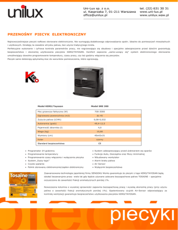 Uni-Lux sp. z o.o. ul. Kasprzaka 7, 01-211 Warszawa [email protected] tel. (22) 631 30 31 www.uni-lux.pl www.unilux.waw.pl PRZENOŚNY PIECYK ELEKTRONICZNY Najnowocześniejsze piecyki naftowe sterowane elektronicznie. Nie wymagają dodatkowego odprowadzania spalin. Idealne do pomieszczeń mieszkalnych i użytkowych. Działają na zasadzie wtrysku paliwa, bez użycia tradycyjnego knota. Perfekcyjnie wykonanie i cyfrowa kontrola parametrów pracy, nie nagrzewająca się obudowa i specjalne zabezpieczenie przed dziećmi gwarantują bezpieczeństwo i ekonomię użytkowania piecyków KERO/TAYOSAN. Komfort zapewnia „samo-uczący się” system elektronicznego sterowania umożliwiający dowolne programowanie temperatury, czasu pracy, czy też godziny włączenia się piecyków. Piecyki same dobierają optymalną moc do warunków pomieszczenia, które ogrzewają. Model KERO/Tayosan Moc grzewcza faktyczna (W) Ogrzewana powierzchnia (m2) Zużycia paliwa (l/24h) Autonomia (godz) Pojemność zbiornika (l) Waga (kg) Wymiary (cm) Kolor Model SRE 300 700-3000 do 45 0,08-0,032 49,4-12,5 4,0 10,80 40x42x31 czarny Standard bezpieczeństwa Programator 24 godzinny CE System zabezpieczający przed ulatnianiem się oparów Programowanie temperatury Funkcje Auto, Oszczędna oraz Mocy minimalnej Programowanie czasy włączenia i wyłączenia piecyka Wbudowany wentylator System „fuzzy logic” Alarm braku paliwa Czyste spalanie Air Sensor Palnik sterowany elektronicznie/zapłon elektroniczny Wyłącznik bezpieczeństwa Zaawansowana technologia japońskiej firmy SENGOKU Works gwarantuje że piecyki z logo KERO/TAYOSAN będą działać bezawaryjnie przez wiele lat gdy będzie używane zalecane bezzapachowe paliwo TOSAINE – specjalnie oczyszczone do zawartości frakcji aromatycznych poniżej 1%. Nowoczesna kolumna o wysokiej sprawności zapewnia bezzapachową pracę i wysoką ekonomię pracy (przy użyciu paliwa o zawartości frakcji aromatycznych poniżej 1%). Opatentowany czujnik Air-Sensor odpowiadający za kontrolę wentylacji gwarantuje bezpieczeństwo użytkowania piecyków KERO/TAYOSAN. piecyki