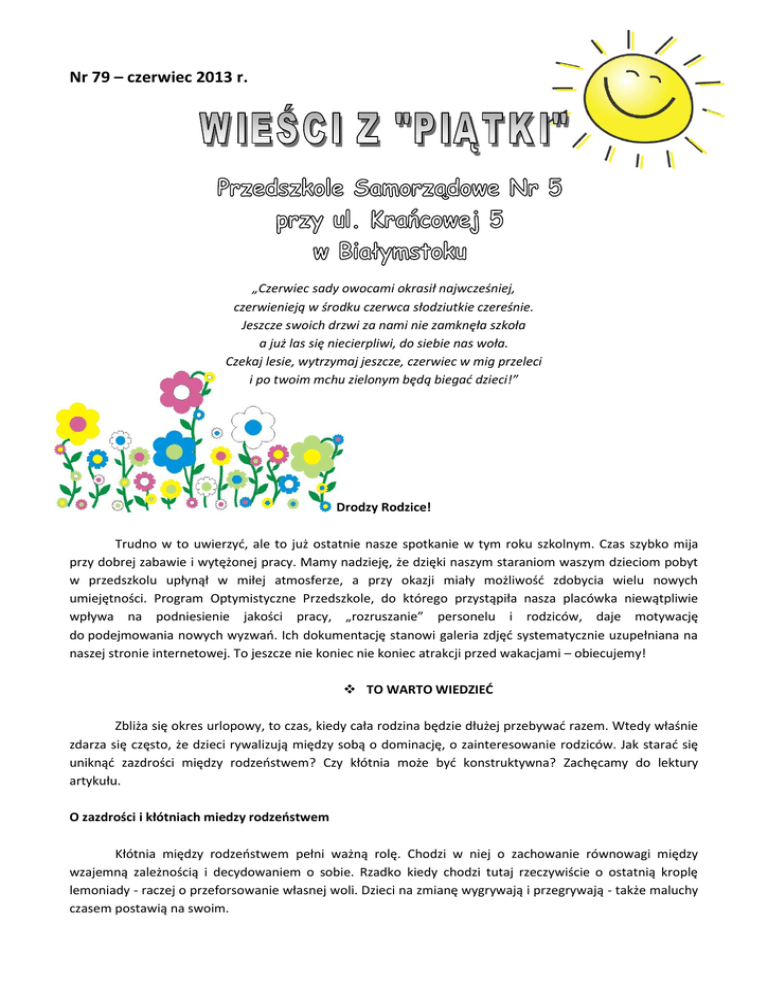 Nr 79 – czerwiec 2013 r. „Czerwiec sady owocami okrasił najwcześniej, czerwienieją w środku czerwca słodziutkie czereśnie. Jeszcze swoich drzwi za nami nie zamknęła szkoła a już las się niecierpliwi, do siebie nas woła. Czekaj lesie, wytrzymaj jeszcze, czerwiec w mig przeleci i po twoim mchu zielonym będą biegać dzieci!” Drodzy Rodzice! Trudno w to uwierzyć, ale to już ostatnie nasze spotkanie w tym roku szkolnym. Czas szybko mija przy dobrej zabawie i wytężonej pracy. Mamy nadzieję, że dzięki naszym staraniom waszym dzieciom pobyt w przedszkolu upłynął w miłej atmosferze, a przy okazji miały możliwość zdobycia wielu nowych umiejętności. Program Optymistyczne Przedszkole, do którego przystąpiła nasza placówka niewątpliwie wpływa na podniesienie jakości pracy, „rozruszanie” personelu i rodziców, daje motywację do podejmowania nowych wyzwań. Ich dokumentację stanowi galeria zdjęć systematycznie uzupełniana na naszej stronie internetowej. To jeszcze nie koniec nie koniec atrakcji przed wakacjami – obiecujemy! TO WARTO WIEDZIEĆ Zbliża się okres urlopowy, to czas, kiedy cała rodzina będzie dłużej przebywać razem. Wtedy właśnie zdarza się często, że dzieci rywalizują między sobą o dominację, o zainteresowanie rodziców. Jak starać się uniknąć zazdrości między rodzeństwem? Czy kłótnia może być konstruktywna? Zachęcamy do lektury artykułu. O zazdrości i kłótniach miedzy rodzeństwem Kłótnia między rodzeństwem pełni ważną rolę. Chodzi w niej o zachowanie równowagi między wzajemną zależnością i decydowaniem o sobie. Rzadko kiedy chodzi tutaj rzeczywiście o ostatnią kroplę lemoniady - raczej o przeforsowanie własnej woli. Dzieci na zmianę wygrywają i przegrywają - także maluchy czasem postawią na swoim. Jeśli dorośli zbyt szybko interweniują, odbierają dzieciom szansę na samodzielne szukanie rozwiązań. W przypadku kłótni oznacza to: im mniej interwencji, tym lepiej. Nawet jeżeli czasem jest to trudne, ponieważ płyną łzy i dzieci bardzo hałasują albo wołają mamę. Życie jest pełne konfliktów - czasem nie dostajemy tego, co chcemy, albo musimy się bardzo starać, by to zachować. Przejście od kłótni do zgody jest wielokrotnie tak błyskawiczne, że my, dorośli, często nie nadążamy za nim. Jednocześnie może to nas odciążać, ponieważ pokazuje nam, że dzieci jak najbardziej potrafią radzić sobie samodzielnie ze swoimi sporami, a nawet tego chcą. Jeśli poważnie potraktujemy więzi między rodzeństwem jako samodzielny związek, wówczas wolno nam interweniować tylko wtedy, gdy mamy do czynienia z zagrożeniem zdrowia (jeśli kłótnia przybiera postać bójki – interweniuj i zdecydowanie rozdziel dzieci) albo gdy dzieci poproszą nas o wtrącenie się. Bardziej im pomożemy, rozwijając kulturę sporu, której przykładem musimy być my, dorośli, w życiu codziennym. Oznacza to, że musimy być dla dzieci partnerami, którzy pertraktują z nimi, by ustalić wspólnie obowiązujące reguły. Jeśli jako matka lub ojciec stanowczo nakazuje, co dzieci mają robić, kto co może mieć, a kto nie, nie powinienem się dziwić, jeśli dzieci nie znają żadnej innej strategii rozwiązywania konfliktu niż ta, w której zwycięża silniejszy. Trzeba przy tym naturalnie uwzględnić fakt, że dzieci zachowują się odpowiednio do swojego wieku. Trzylatki będą szukały raczej niewerbalnych rozwiązań, jak na przykład bicie, ponieważ nie władają jeszcze tak dobrze językiem jak ich starsze rodzeństwo. Dorośli muszą rozważyć te wzorce zachowania. Jak bardzo rodzice nie znoszą tego, gdy dzieci się biją? Czy z moralnego punktu widzenia jest to dla nich do zaakceptowania? Niezależnie od tego, jaką metodę dziecko wybierze, by wygrać kłótnię, zawsze odpowiada ona w pierwszej kolejności możliwościom dziecka w danym momencie i dopiero z tego punktu może się ono dalej uczyć. Często zdarza się, że dzieci w kłótni wołają o pomoc dorosłych, ale ledwo ci się wtrącą, już są niepożądani i zbędni. Rodzeństwo sprzymierza się przeciwko rodzicom, skoro tylko z ich ust padną słowa krytyki, nie chcąc właściwie ich interwencji. Są oni wołani raczej po to, by zapewnili sprawiedliwy przebieg walki, a nie po to, by ją regulowali albo decydowali o jej zakończeniu. I tak nie nadają się na sędziego, ponieważ nigdy nie można znaleźć „winnego". Kto zaczął? Jak dorośli mają o tym zdecydować? Ile wiedzą o wydarzeniach poprzedzających kłótnię? Ile docinków poprzedziło kopnięcie w nogę? Ofiarą nie zawsze jest ten, kto najgłośniej krzyczy. Jak można uniknąć konfliktów? • Zazdrość wynika często z tego, że jednemu dziecku więcej wolno niż drugiemu albo że więcej ono dostaje. Różnice wieku, różne kompetencje, prawa i obowiązki, kryją w sobie ogromny potencjał konfliktów. Dlatego korzystne jest spędzanie czasu przez matkę lub ojca z pojedynczymi dziećmi. Wtedy ich uwaga skupia się tylko na tym jednym dziecku, które nie musi wówczas rywalizować z bratem lub siostrą o rodzicielską miłość i uwagę. • Jasne reguły mogą pomóc w uniknięciu kłótni. Jeżeli regularnie dochodzi do kłótni z powodu tego, kto ma decydować o wyborze programu telewizyjnego, kto posprząta klatkę kanarka, kto może nacisnąć guzik pilota do automatycznej bramy garażowej, wtedy można wspólnie z dziećmi ustalić sprawiedliwe reguły, na które wszyscy się zgodzą. Dzieci są bardzo wyczulone na sprawiedliwe traktowanie. W poniedziałki jest moja kolej, we wtorki twoja. Nie można w tym nic zmieniać, nawet jeśli komuś w danej chwili to nie pasuje. • Im mniej rodzice porównują rodzeństwo oraz im więcej indywidualnych możliwości rozwoju mają dzieci (różne kręgi przyjaciół, odmienne zainteresowania), tym mniej jest przestrzeni dla zawiści. Porównywanie rodzeństwa jest częstym sposobe