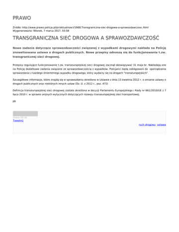 PRAWO Źródło: http://www.prawo.policja.pl/pr/aktualnosci/1668,Transgraniczna-siec-drogowa-a-sprawozdawczosc.html Wygenerowano: Wtorek, 7 marca 2017, 03:58 TRANSGRANICZNA SIEĆ DROGOWA A SPRAWOZDAWCZOŚĆ Nowe zadania dotyczące sprawozdawczości związanej z wypadkami drogowymi nakłada na Policję znowelizowana ustawa o drogach publicznych. Nowe przepisy odnoszą się do funkcjonowania t.zw. transgranicznej sieci drogowej. Przepisy regulujące funkcjonowanie t.zw. transeuropejskiej sieci drogowej zacznął obowiązywać 31 maja br. Nakładają one na Policję dodatkowe zadania związane ze sprawozdawczością z wypadków. Policjanci będą zobligowani do sporządzania sprawozdania z każdego śmiertelnego wypadku drogowego, który wydarzy się na drogach "transeuropejskich". Szczegółowe informacje, które znajdą się w sprawozdaniu określono w Ustawie z dnia 13 kwietnia 2012 r. o zmianie ustawy o drogach publicznych oraz niektórych innych ustaw (Dz. U. z 2012 r., poz. 472) Definicja transeuropejskiej sieci drogowej została określona w decyzji Parlamentu Europejskiego i Rady nr 661/2010/UE z 7 lipca 2010 r. w sprawie unijnych wytycznych dotyczących rozwoju transeuropejskiej sieci transportowej. pb Ocena: 0/5 (0) Tweetnij ruch drogowy, ustawa