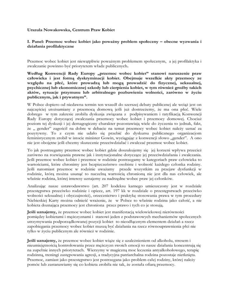 Urszula Nowakowska, Centrum Praw Kobiet I. Panel: Przemoc wobec kobiet jako poważny problem społeczny – obecne wyzwania i działania profilaktyczne Przemoc wobec kobiet jest niewątpliwie poważnym problemem społecznym, a jej profilaktyka i zwalczanie powinno być priorytetem władz publicznych. Według Konwencji Rady Europy „przemoc wobec kobiet” stanowi naruszenie praw człowieka i jest formą dyskryminacji kobiet. Obejmuje wszelkie akty przemocy ze względu na płeć, które prowadzą lub mogą prowadzić do fizycznej, seksualnej, psychicznej lub ekonomicznej szkody lub cierpienia kobiet, w tym również groźby takich aktów, sytuacje przymusu lub arbitralnego pozbawienia wolności, zarówno w życiu publicznym, jak i prywatnym”. W Polsce dopiero od niedawna termin ten wszedł do szerszej debaty publicznej ale wciąż jest on najczęściej utożsamiany z przemocą domową jeśli już dostrzeżemy, że ma ona płeć. Wiele dobrego w tym zakresie zrobiła dyskusja związana z podpisywaniem i ratyfikacją Konwencji Rady Europy dotyczącej zwalczania przemocy wobec kobiet i przemocy domowej. Chociaż poziom tej dyskusji i jej demagogiczny charakter pozostawiają wiele do życzenia to jednak, fakt, że „ gender” zagościł na dobre w debacie na temat przemocy wobec kobiet należy uznać za pozytywny. To z czym nie udało się przebić do dyskursu publicznego organizacjom feministycznym zrobił w istocie minister Gowin, wyciągając z konwencji słowo „gender”. A ono nie jest obojętne jeśli chcemy skutecznie przeciwdziałać i zwalczać przemoc wobec kobiet. To jak postrzegamy przemoc wobec kobiet gdzie doszukujemy się jej korzeni wpływa przecież zarówno na rozwiązania prawne jak i instytucjonalne dotyczące jej przeciwdziałania i zwalczania. Jeśli przemoc wobec kobiet i przemoc w rodzinie postrzegamy w kategoriach praw człowieka to wartościami, które chronimy jest bezpieczeństwo osobiste i wolność każdego członka rodziny. Jeśli natomiast przemoc w rodzinie uważamy przede wszystkim za przejaw dysfunkcji w rodzinie, którą można usunąć to naczelną wartością chronioną nie jest dla nas człowiek, ale właśnie rodzina, której interesy uznajemy za nadrzędne wobec praw jej członków. Analizując nasze ustawodawstwo (art. 207 kodeksu karnego umieszczony jest w rozdziale przestępstwa przeciwko rodzinie i opiece, art. 197 kk w rozdziale o przestępstwach przeciwko wolności seksualnej i obyczajności), orzecznictwo i praktykę stosowania prawa w tym procedury Niebieskiej Karty można odnieść wrażenie, że w Polsce to właśnie rodzina jako całość, a nie kobieta doznająca przemocy jest chroniona przez prawo i tych co je stosują. Jeśli uznajemy, że przemoc wobec kobiet jest manifestacją wielowiekowej nierówności pomiędzy kobietami i mężczyznami i stanowi jeden z podstawowych mechanizmów społecznych utrzymywania podporządkowanej pozycji kobiet to nieodłącznym elementem działań a rzecz zapobiegania przemocy wobec kobiet muszą być działania na rzecz równouprawnienia płci nie tylko w życiu publicznym ale również w rodzinie. Jeśli uznajemy, że przemoc wobec kobiet wiąże się z uzależnieniem od alkoholu, stresem i nieumiejętnością kontrolowania przez mężczyzn swoich emocji to nasze działania koncentrują się na zupełnie innych priorytetach. Wierzymy w magiczną moc leczenia antyalkoholowego, terapię rodzinną, treningi zastępowania agresji, a tradycyjna patriarchalna rodzina pozostaje nietknięta. Przemoc, zamiast jako przestępstwo jest postrzegana jako problem całej rodziny, której należy pomóc lub zastanawiamy się co kobieta zrobiła nie tak, że została ofiarą przemocy. Skuteczna profilaktyka przemocy wobec kobiet musi opierać się na promowaniu wzorców społecznych i kulturowych zachowań kobiet i mężczyzn, które są wolne od uprzedzeń, zwyczajów, tradycji oraz innych praktyk opartych na idei niższości kobiet lub na stereotypowym modelu roli kobiet i mężczyzn. Kultura, zwyczaje, religia, tradycja nie mogą jak to jest dotychczas być uznawane za usprawiedliwienie dla aktów przemocy. Skuteczna profilaktyka to również programy zachęcające całe społeczeństwo, w tym w szczególności mężczyzn i chłopców, do aktywnego udziału w działaniach na rzecz przeciwdziałania przemocy wobec kobiet. Działania profilaktyczne muszą być prowadzone na wszystkich szczeblach edukacji i nie mogą pomijać problematyki równouprawnienia kobiet i mężczyzn, ról przypisanych płciom ograniczając się do rozwiązywania konfliktów bez użycia przemocy. Przed nami wiele wyzwań jeśli chodzi o profilaktykę i działania na rzecz zwalczania przemocy wobec kobiet, ale najważniejsze z nich to przełamywanie stereotypów i powiązanie działań w tym obszarze z działaniami na rzecz równouprawnienia płci, a także doprowadzenie do tego aby polityka państwa była spójna i skoordynowana.