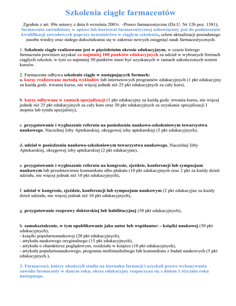 Szkolenia ciągłe farmaceutów Zgodnie z art. 89e ustawy z dnia 6 września 2001r. –Prawo farmaceutyczne (Dz.U. Nr 126 poz. 1381), farmaceuta zatrudniony w aptece lub hurtowni farmaceutycznej zobowiązany jest do podnoszenia kwalifikacji zawodowych poprzez uczestnictwo w ciągłym szkoleniu, celem aktualizacji posiadanego zasobu wiedzy oraz stałego dokształcania się w zakresie nowych osiągnięć nauk farmaceutycznych. 1. Szkolenie ciągłe realizowane jest w pięcioletnim okresie edukacyjnym, w czasie którego farmaceuta powinien uzyskać co najmniej 100 punktów edukacyjnych za udział w wybranych formach ciągłych szkoleń, w tym co najmniej 50 punktów musi być uzyskanych w ramach zakończonych testem kursów. 2. Farmaceuta odbywa szkolenie ciągłe w następujących formach: a. kursy realizowane metodą wykładów lub internetowych programów edukacyjnych (1 pkt edukacyjny za każdą godz. trwania kursu, nie więcej jednak niż 25 pkt edukacyjnych za cały kurs), b. kursy odbywane w ramach specjalizacji (1 pkt edukacyjny za każdą godz. trwania kursu, nie więcej jednak niż 25 pkt edukacyjnych za cały kurs oraz 30 pkt edukacyjnych za uzyskanie specjalizacji I stopnia lub tytułu specjalisty), c. przygotowanie i wygłoszenie referatu na posiedzeniu naukowo-szkoleniowym towarzystwa naukowego, Naczelnej Izby Aptekarskiej, okręgowej izby aptekarskiej (5 pkt edukacyjnych), d. udział w posiedzeniu naukowo-szkoleniowym towarzystwa naukowego, Naczelnej Izby Aptekarskiej, okręgowej izby aptekarskiej (2 pkt edukacyjne), e. przygotowanie i wygłoszenie referatu na kongresie, zjeździe, konferencji lub sympozjum naukowym lub przedstawienie komunikatu albo plakatu (10 pkt edukacyjnych oraz 2 pkt za każdy dzień udziału, nie więcej jednak niż 10 pkt edukacyjnych), f. udział w kongresie, zjeździe, konferencji lub sympozjum naukowym (2 pkt edukacyjne za każdy dzień udziału, nie więcej jednak niż 10 pkt edukacyjnych), g. przygotowanie rozprawy doktorskiej lub habilitacyjnej (50 pkt edukacyjnych), h. samokształcenie, w tym opublikowanie jako autor lub współautor: - książki naukowej (50 pkt edukacyjnych), - książki popularnonaukowej (20 pkt edukacyjnych), - artykułu naukowego oryginalnego (15 pkt edukacyjnych), - artykułu o charakterze poglądowym, rozdziału w książce (10 pkt edukacyjnych), - artykułu popularnonaukowego, programu multimedialnego lub komunikatu z badań naukowych (5 pkt edukacyjnych.), 3. Farmaceuci, którzy ukończyli studia na kierunku farmacji i uzyskali prawo wykonywania zawodu farmaceuty w danym roku, okres edukacyjny rozpoczyna się z dniem 1 stycznia roku następnego.