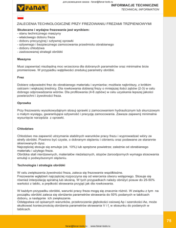 для размещения заказа - [email protected] INFORMACJE TECHNICZNE TECHNICAL INFORMATION ZALECENIA TECHNOLOGICZNE PRZY FREZOWANIU FREZAMI TRZPIENIOWYMI Skuteczne i wydajne frezowanie jest wynikiem: - stanu technicznego maszyny - właściwego doboru freza - doboru precyzyjnej i sztywnej oprawki - sztywnego i bezpiecznego zamocowania przedmiotu obrabianego - doboru chłodziwa - zastosowanej strategii obróbki Maszyna Musi zapewniać niezbędną moc wrzeciona dla dobranych parametrów oraz minimalne bicie promieniowe. W przypadku wątpliwości zredukuj parametry obróbki. Frez Dobierz odpowiedni frez do obrabianego materiału i wymiarów; możliwie najkrótszy, z krótkim ostrzem i większej średnicy. Dla rowkowania dobieraj frezy o mniejszej ilości zębów (2-3) w celu dobrego odprowadzania wiórów. Dla profilowania (4-6 zębów) w celu uzyskania lepszej jakości powierzchni i żywotności freza. Oprawka Przy frezowaniu wysokowydajnym stosuj oprawki z zamocowaniem hydraulicznym lub skurczowym o małym wysięgu, gwarantujące sztywność i precyzję zamocowania. Zawsze zapewnij minimalne wysunięcie narzędzia z oprawki. Chłodziwo Chłodziwo ma zapewnić utrzymanie stabilnych warunków pracy frezu i wyprowadzać wióry ze strefy obróbki. Powinno być czyste, o dobranym stężeniu i ciśnieniu oraz podawane ze starannie skierowanych dysz. Najczęściej stosuje się emulsje (ok. 10%) lub sprężone powietrze; zależnie od obrabianego materiału i użytego freza. Obróbka stali nierdzewnych, materiałów nieżelaznych, stopów żaroodpornych wymaga stosowania emulsji o podwyższonym stężeniu. Technologia i strategia obróbki W celu zwiększenia żywotności freza, zaleca się frezowanie współbieżne. Frezowanie wgłębień najczęściej rozpoczyna się od wiercenia otworu wstępnego. Stosuje się również interpolację spiralną lub skośną. W tych przypadkach należy obniżyć posuw do 25-50% wartości z tablic, a prędkość skrawania przyjąć jak dla rowkowania. W każdym przypadku obróbki, warunki pracy freza mogą się znacznie różnić. W związku z tym na początku obróbki zaleca się obniżenie parametrów skrawania do 50% podanych w tablicach doboru, a następnie ich zwiększanie. Odstępstwa od opisanych warunków, przekroczenie głębokości osiowej Ap i szerokości Ae, może skutkować koniecznością obniżenia parametrów skrawania V i fz w stosunku do podanych w tablicach. 75 [email protected] www.fanar-tools.ru