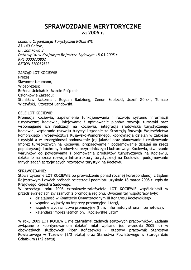 SPRAWOZDANIE MERYTORYCZNE za 2005 r. Lokalna Organizacja Turystyczna KOCIEWIE 83-140 Gniew, ul. Zamkowa 3 Data wpisu w Krajowym Rejestrze Sądowym 18.03.2005 r. KRS 0000230802 REGON 220039322 ZARZĄD LOT KOCIEWIE Prezes: Sławomir Neumann, Wiceprezesi: Bożena Uciekałek, Marcin Pośpiech Członkowie Zarządu: Stanisław Ackerman, Bogdan Badziong, Zenon Sobiecki, Józef Górski, Tomasz Wiczyński, Krzysztof Landowski, CELE LOT KOCIEWIE: Promocja Kociewia, zapewnienie funkcjonowania i rozwoju systemu informacji turystycznej Kociewia, inicjowanie i opiniowanie planów rozwoju turystyki oraz wspomaganie ich realizacji na Kociewiu, integracja środowiska turystycznego Kociewia, wspieranie rozwoju turystyki zgodnie ze Strategią Rozwoju Województwa Pomorskiego i Województwa Kujawsko-Pomorskiego, koordynacja działań w zakresie turystyki a w szczególności podnoszenie jej jakości oraz planowanie i realizowanie imprez turystycznych na Kociewiu, propagowanie i podejmowanie działań na rzecz popularyzacji i ochrony środowiska przyrodniczego i kulturowego Kociewia, stwarzanie warunków do powstawania i promowania produktów turystycznych na Kociewiu, działanie na rzecz rozwoju infrastruktury turystycznej na Kociewiu, podejmowanie innych zadań sprzyjających rozwojowi turystyki na Kociewiu. SPRAWOZDANIE: Stowarzyszenie LOT KOCIEWIE po prowadzeniu ponad rocznej korespondencji z Sądem Rejestrowym i dwóch próbach rejestracji podmiotu uzyskało 18 marca 2005 r. wpis do Krajowego Rejestru Sądowego. W przeciągu roku 2005 członkowie-założyciele LOT KOCIEWIE współdziałali w przedsięwzięciach związanych z promocją regionu. Owocem tej współpracy byly: • działalność w Komitecie Organizacyjnym III Kongresu Kociewskiego • wspólne wyjazdy na imprezy promocyjne i targi, • wspólne wydawnictwa promocyjne (film, informator, strona internetowa), • kalendarz imprez letnich pn. „Kociewskie Lato” W roku 2005 LOT KOCIEWIE nie zatrudniał żadnych etatowych pracowników. Zadania związane z koordynowaniem działań miał wpisane (od września 2005 r.) w obowiązkach służbowych Piotr Kończewski – etatowy pracownik Starostwa Powiatowego w Tczewie (1/2 etatu) oraz Starostwa Powiatowego w Starogardzie Gdańskim (1/2 etatu). W dniu 28 września 2005 r została zawarta umowa zlecenia (nr 249/UM/DROWOŚ/2005) pomiędzy Samorządem Województwa Pomorskiego, reprezentowanym przez Jana Kozłowskiego, Marszałka Województwa Pomorskiego i Jacka Głowacza, Członka Zarządu Województwa Pomorskiego a Lokalną Organizacją Turystyczną KOCIEWIE z siedzibą w Gniewie reprezentowaną przez Sławomira Neumanna, Prezesa i Bożenę Uciekałek, Wiceprezesa. Przedmiotem umowy była współorganizacja stoiska na Międzynarodowych Targach POLAGRA-FARM 2005 w dniach 6-9 października w Poznaniu. Szczegółowym przedmiotem umowy było: zapewnienie powierzchni wystawowej stoiska, przygotowanie stoiska oraz zapewnienie transportu zespołów folklorystycznych oraz materiałów promocyjnych na stoisko. Lokalna Organizacja Turystyczna KOCIEWIE wraz ze Starostwem Powiatowym w Starogardzie Gdańskim zapewniła miejsca wystawiennicze w postaci 4 modułów wraz z niezbędnym wyposażeniem oraz przygotowała wspólne stoisko WOJEWÓDZTWA POMORSKIEGO na targach "Polagra Farm 2005”. Na scenie podczas targów wystąpiły zespoły regionalne: NIEZABÓTCZI ze Stężycy oraz HAJDABANY i KAPELA KOCIEWSKA ze Starogardu Gdańskiego. Transport zespołów, zgodnie z umową, został zapewniony przez LOT KOCIEWIE. W przygotowaniu stoiska uczestniczyły również pomorskie firmy z branży przetwórstwa rolno-spożywczego: Spółdzielnia Mleczarska Maćkowy z Gdańska oraz Przetwórstwo Mięsne Lis z Sierakowic. Nasze wspólne stoisko otrzymało nagrodę za najlepsze stoisko promujące region: Hit Publiczności - Kryształowy Róg. W dniach 20-22 października odbył się w Starogardzie Gdańskim, Świeciu oraz Tczewie III Kongres Kociewski, którego jednym z organizatorów (w szczególności dnia trzeciego – Ekologia szansą rozwoju turystyki na Kociewiu) była LOT KOCIEWIE. Podczas sesji referatowej swoje wystąpienia mieli m.in. Wojciech Kodłubański – Wiceprezes Polskiej Organizacji turystycznej z Warszawy, Jacek Zdrojewski z Pomorskiej regionalnej Organizacji Turystycznej z Gdańska oraz Bożena Uciekałek Wiceprezes LOT KOCIEWIE. W dniu 14 listopada 2005 r została zawarta umowa (nr KS/40/2005) pomiędzy Powiatem Starogardzkim, reprezentowanym przez Kazimierza Chyłę, Wicestarostę Starogardzkiego i Krzysztofa Trawickiego, Członka Zarządu Powiatu Starogardzkiego a Lokalną Organizacją Turystyczną KOCIEWIE z siedzibą w Gniewie reprezentowaną przez Bożenę Uciekałek, Wiceprezesa i Tomasza Wiczyńskiego, Członka Zarządu. Przedmiotem umowy była prowadzenie Powiatowego Centrum Informacji Turystycznej w Starogardzie Gdańskim. W ramach umowy LOT KOCIEWIE zapewniała opiekę merytoryczną nad działalnością placówki oraz opłacała wynajem pomieszczeń, Starostwo Powiatowe w Starogardzie natomiast zobowiązało się do zapewnienia wyposażenia oraz personelu do obsługi. Umowę podpisano na okres do 31 grudnia 2006 r. LOT KOCIEWIE brała czynny udział w działaniach Lokalnych Grup Działania WSTĘGA KOCIEWIA (dla Powiatu Tczewskiego) i CHATA KOCIEWIA (dla Powiatu Starogardzkiego + Gmina Stara Kiszewa). Realizowany jest projekt „Pilotażowy Program LEADER+” Sektorowego Programu Operacyjnego „Restrukturyzacja i modernizacja sektora żywnościowego oraz rozwój obszarów wiejskich (2004-2006)”. Podstawowym celem lokalnych grup działania jest stworzenie zintegrowanej strategii rozwoju obszarów wiejskich. 16 grudnia 2005 r. w Starogardzie Gdańskim odbyło się Walne Zebranie Stowarzyszenia Lokalna Organizacja Turystyczna KOCIEWIE. Podjęto uchwały w sprawie: przyjęcia Regulaminu obrad Walnego Zebrania Członków Stowarzyszenia LOT KOCIEWIE, przyjęcia Regulaminu prac Zarządu Stowarzyszenia LO