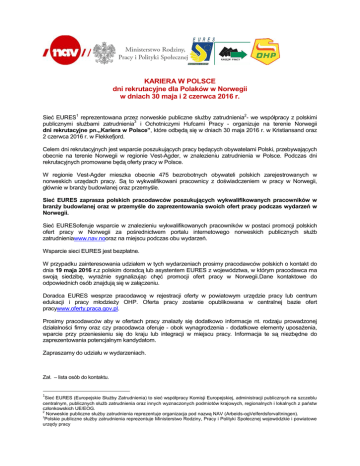 KARIERA W POLSCE dni rekrutacyjne dla Polaków w Norwegii w dniach 30 maja i 2 czerwca 2016 r. 1 2 Sieć EURES reprezentowana przez norweskie publiczne służby zatrudnienia - we współpracy z polskimi 3 publicznymi służbami zatrudnienia i Ochotniczymi Hufcami Pracy - organizuje na terenie Norwegii dni rekrutacyjne pn.„Kariera w Polsce”, które odbędą się w dniach 30 maja 2016 r. w Kristiansand oraz 2 czerwca 2016 r. w Flekkefjord. Celem dni rekrutacyjnych jest wsparcie poszukujących pracy będących obywatelami Polski, przebywających obecnie na terenie Norwegii w regionie Vest-Agder, w znalezieniu zatrudnienia w Polsce. Podczas dni rekrutacyjnych promowane będą oferty pracy w Polsce. W regionie Vest-Agder mieszka obecnie 475 bezrobotnych obywateli polskich zarejestrowanych w norweskich urzędach pracy. Są to wykwalifikowani pracownicy z doświadczeniem w pracy w Norwegii, głównie w branży budowlanej oraz przemyśle. Sieć EURES zaprasza polskich pracodawców poszukujących wykwalifikowanych pracowników w branży budowlanej oraz w przemyśle do zaprezentowania swoich ofert pracy podczas wydarzeń w Norwegii. Sieć EURESoferuje wsparcie w znalezieniu wykwalifikowanych pracowników w postaci promocji polskich ofert pracy w Norwegii za pośrednictwem portalu internetowego norweskich publicznych służb zatrudnieniawww.nav.nooraz na miejscu podczas obu wydarzeń. Wsparcie sieci EURES jest bezpłatne. W przypadku zainteresowania udziałem w tych wydarzeniach prosimy pracodawców polskich o kontakt do dnia 19 maja 2016 r.z polskim doradcą lub asystentem EURES z województwa, w którym pracodawca ma swoją siedzibę, wyraźnie sygnalizując chęć promocji ofert pracy w Norwegii.Dane kontaktowe do odpowiednich osób znajdują się w załączeniu. Doradca EURES wesprze pracodawcę w rejestracji oferty w powiatowym urzędzie pracy lub centrum edukacji i pracy młodzieży OHP. Oferta pracy zostanie opublikowana w centralnej bazie ofert pracywww.oferty.praca.gov.pl. Prosimy pracodawców aby w ofertach pracy znalazły się dodatkowo informacje nt. rodzaju prowadzonej działalności firmy oraz czy pracodawca oferuje - obok wynagrodzenia - dodatkowe elementy uposażenia, wparcie przy przeniesieniu się do kraju lub integracji w miejscu pracy. Informacja te są niezbędne do zaprezentowania potencjalnym kandydatom. Zapraszamy do udziału w wydarzeniach. Zał. – lista osób do kontaktu. 1 Sieć EURES (Europejskie Służby Zatrudnienia) to sieć współpracy Komisji Europejskiej, administracji publicznych na szczeblu centralnym, publicznych służb zatrudnienia oraz innych wyznaczonych podmiotów krajowych, regionalnych i lokalnych z państw członkowskich UE/EOG. 2 Norweskie publiczne służby zatrudnienia reprezentuje organizacja pod nazwą NAV (Arbeids-ogVelferdsforvaltningen). 3 Polskie publiczne służby zatrudnienia reprezentuje Ministerstwo Rodziny, Pracy i Polityki Społecznej wojewódzkie i powiatowe urzędy pracy