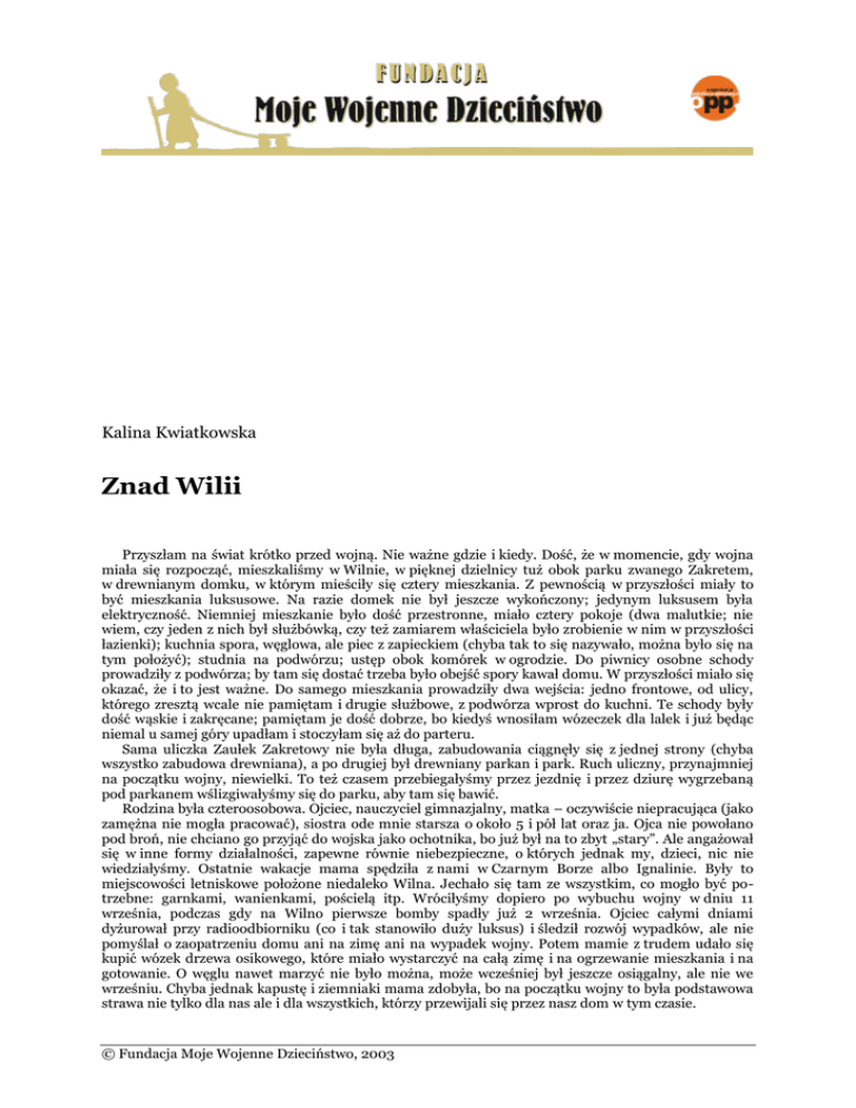 Kalina Kwiatkowska Znad Wilii Przyszłam na świat krótko przed wojną. Nie ważne gdzie i kiedy. Dość, że w momencie, gdy wojna miała się rozpocząć, mieszkaliśmy w Wilnie, w pięknej dzielnicy tuż obok parku zwanego Zakretem, w drewnianym domku, w którym mieściły się cztery mieszkania. Z pewnością w przyszłości miały to być mieszkania luksusowe. Na razie domek nie był jeszcze wykończony; jedynym luksusem była elektryczność. Niemniej mieszkanie było dość przestronne, miało cztery pokoje (dwa malutkie; nie wiem, czy jeden z nich był służbówką, czy też zamiarem właściciela było zrobienie w nim w przyszłości łazienki); kuchnia spora, węglowa, ale piec z zapieckiem (chyba tak to się nazywało, można było się na tym położyć); studnia na podwórzu; ustęp obok komórek w ogrodzie. Do piwnicy osobne schody prowadziły z podwórza; by tam się dostać trzeba było obejść spory kawał domu. W przyszłości miało się okazać, że i to jest ważne. Do samego mieszkania prowadziły dwa wejścia: jedno frontowe, od ulicy, którego zresztą wcale nie pamiętam i drugie służbowe, z podwórza wprost do kuchni. Te schody były dość wąskie i zakręcane; pamiętam je dość dobrze, bo kiedyś wnosiłam wózeczek dla lalek i już będąc niemal u samej góry upadłam i stoczyłam się aż do parteru. Sama uliczka Zaułek Zakretowy nie była długa, zabudowania ciągnęły się z jednej strony (chyba wszystko zabudowa drewniana), a po drugiej był drewniany parkan i park. Ruch uliczny, przynajmniej na początku wojny, niewielki. To też czasem przebiegałyśmy przez jezdnię i przez dziurę wygrzebaną pod parkanem wślizgiwałyśmy się do parku, aby tam się bawić. Rodzina była czteroosobowa. Ojciec, nauczyciel gimnazjalny, matka – oczywiście niepracująca (jako zamężna nie mogła pracować), siostra ode mnie starsza o około 5 i pół lat oraz ja. Ojca nie powołano pod broń, nie chciano go przyjąć do wojska jako ochotnika, bo już był na to zbyt „stary”. Ale angażował się w inne formy działalności, zapewne równie niebezpieczne, o których jednak my, dzieci, nic nie wiedziałyśmy. Ostatnie wakacje mama spędziła z nami w Czarnym Borze albo Ignalinie. Były to miejscowości letniskowe położone niedaleko Wilna. Jechało się tam ze wszystkim, co mogło być potrzebne: garnkami, wanienkami, pościelą itp. Wróciłyśmy dopiero po wybuchu wojny w dniu 11 września, podczas gdy na Wilno pierwsze bomby spadły już 2 września. Ojciec całymi dniami dyżurował przy radioodbiorniku (co i tak stanowiło duży luksus) i śledził rozwój wypadków, ale nie pomyślał o zaopatrzeniu domu ani na zimę ani na wypadek wojny. Potem mamie z trudem udało się kupić wózek drzewa osikowego, które miało wystarczyć na całą zimę i na ogrzewanie mieszkania i na gotowanie. O węglu nawet marzyć nie było można, może wcześniej był jeszcze osiągalny, ale nie we wrześniu. Chyba jednak kapustę i ziemniaki mama zdobyła, bo na początku wojny to była podstawowa strawa nie tylko dla nas ale i dla wszystkich, którzy przewijali się przez nasz dom w tym czasie. © Fundacja Moje Wojenne Dzieciństwo, 2003 Kalina Kwiatkowska, Znad Wilii 2 Pierwszy okres wojny można odtworzyć z notatek sporządzonych przez Ojca w kalendarzyku na 1939 roku. Po dwóch największych nalotach 15 i 16 września nad Wilnem pojawiły się 17 września samoloty sowieckie, a 19 września do Wilna weszli Rosjanie, którzy z kolei 28 października przekazali władzę Litwinom. Litwini wśród wielu innych posunięć zarządzili wprowadzenie języka litewskiego do szkół. Młodzież gimnazjalna (były dwa gimnazja państwowe męskie i dwa żeńskie) odpowiedziała strajkiem. Polegał na tym, że przestano chodzić do szkoły. Nie wszyscy wytrwali w tym postanowieniu. Ale rezultatem strajku było wypowiedzenie pracy nauczycielom – Polakom. Ojciec otrzymał wypowiedzenie w dniu 30 listopada. Ale zanim do tego doszło w domu nastąpiło zagęszczenie. W dniu 11 października dotarła do nas rodzina uciekająca z Warszawy. Nie wiem, czy całą drogę czy tylko jej część przebyli pieszo, niosąc na plecach swoje „skarby” – cały majątek, jaki im pozostał. Pozostawili w Warszawie umeblowane mieszkanie, dobrze zaopatrzoną na zimę spiżarnię. Kto inny z tego korzystał. A było ich tylko 5 osób. W dwa dni później znad granicy łotewskiej przybyła inna ciotka, nauczycielka, a zarazem kierowniczka szkoły 4-klasowej. Pomagała tym ludziom jak potrafiła. Była jedyną nauczycielką. Musiała, jak to często było na wsi, uczyć równocześnie dzieci z 4-ch klas. Opowiadała mi mama, że kiedyś pojechała odwiedzić ciocię Jankę – a nie było to najłatwiejsze, bo do najbliższej stacji kolejowej było, jeśli się nie mylę około 30 kilometrów, a do miasta powiatowego 50 kilometrów. (A może odwrotnie?) Oświetlano mieszkania lampkami naftowymi. Pierwszą we wsi lampkę zapalała pani nauczycielka. Do niej po światło przychodził gospodarz, u którego mieszkała. Gdy już u niego pojawiło się światło, przychodził ktoś z sąsiedniej chałupy i zapalał swoją lampę. I w ten sposób światło stopniowo przenosiło się dalej, aż cała wieś rozbłysła światełkami, zapalonymi od tej jednej jedynej zapałki pani nauczycielki. Dzieci były zabiedzone, niektóre nie miały ubrania. Zdarzało się, że zimą były bez butów, któreś matka przynosiła na ręku, aby nie szło boso po śniegu. W pierwszym roku pracy na tej zapadłej wsi ciocia napisała do Lublina do swych dawnych uczennic – bo tam przedtem uczyła w szkole prywatnej, zatrudniającej nauczycieli na 10 miesięcy w roku, od września do czerwca – z prośbą o używaną odzież. Przyszła paczka, ubrania rozdzielano na św. Mikołaja. Dzieci nie posiadały się z radości. Tak, ale to było czasu pokoju. A teraz była wojna. Zaraz na początku ktoś przyłożył cioci rew
