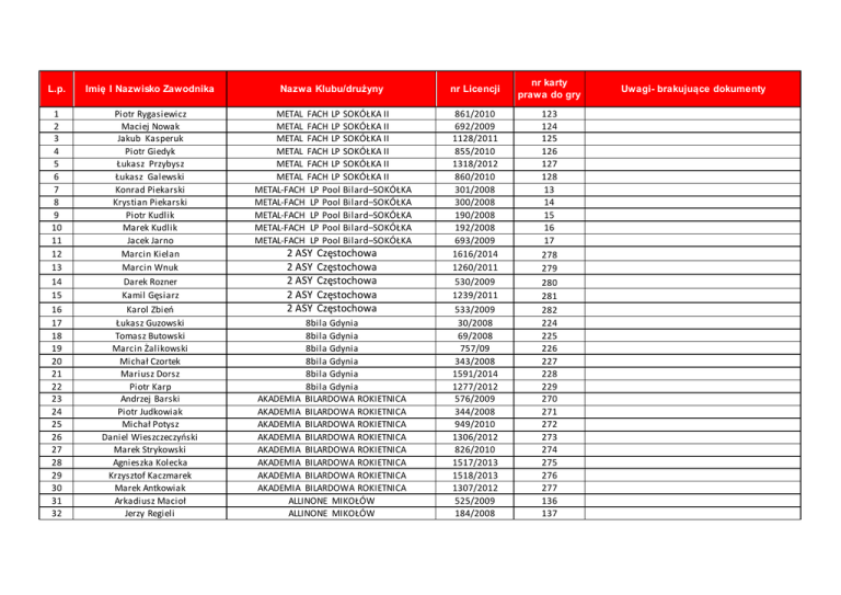 L.p. Imię I Nazwisko Zawodnika 1 2 3 4 5 6 7 8 9 10 11 12 13 14 15 16 17 18 19 20 21 22 23 24 25 26 27 28 29 30 31 32 Piotr Rygasiewicz Maciej Nowak Jakub Kasperuk Piotr Giedyk Łukasz Przybysz Łukasz Galewski Konrad Piekarski Krystian Piekarski Piotr Kudlik Marek Kudlik Jacek Jarno Marcin Kielan Marcin Wnuk Darek Rozner Kamil Gęsiarz Karol Zbień Łukasz Guzowski Tomasz Butowski Marcin Żalikowski Michał Czortek Mariusz Dorsz Piotr Karp Andrzej Barski Piotr Judkowiak Michał Potysz Daniel Wieszczeczyński Marek Strykowski Agnieszka Kolecka Krzysztof Kaczmarek Marek Antkowiak Arkadiusz Macioł Jerzy Regieli Nazwa Klubu/drużyny METAL FACH LP METAL FACH LP METAL FACH LP METAL FACH LP METAL FACH LP METAL FACH LP METAL-FACH LP Pool METAL-FACH LP Pool METAL-FACH LP Pool METAL-FACH LP Pool METAL-FACH LP Pool 2 ASY 2 ASY 2 ASY 2 ASY 2 ASY SOKÓŁKA II SOKÓŁKA II SOKÓŁKA II SOKÓŁKA II SOKÓŁKA II SOKÓŁKA II Bilard–SOKÓŁKA Bilard–SOKÓŁKA Bilard–SOKÓŁKA Bilard–SOKÓŁKA Bilard–SOKÓŁKA Częstochowa Częstochowa Częstochowa Częstochowa Częstochowa 8bila Gdynia 8bila Gdynia 8bila Gdynia 8bila Gdynia 8bila Gdynia 8bila Gdynia AKADEMIA BILARDOWA ROKIETNICA AKADEMIA BILARDOWA ROKIETNICA AKADEMIA BILARDOWA ROKIETNICA AKADEMIA BILARDOWA ROKIETNICA AKADEMIA BILARDOWA ROKIETNICA AKADEMIA BILARDOWA ROKIETNICA AKADEMIA BILARDOWA ROKIETNICA AKADEMIA BILARDOWA ROKIETNICA ALLINONE MIKOŁÓW ALLINONE MIKOŁÓW nr Licencji nr karty prawa do gry 861/2010 692/2009 1128/2011 855/2010 1318/2012 860/2010 301/2008 300/2008 190/2008 192/2008 693/2009 1616/2014 1260/2011 530/2009 1239/2011 533/2009 30/2008 69/2008 757/09 343/2008 1591/2014 1277/2012 576/2009 344/2008 949/2010 1306/2012 826/2010 1517/2013 1518/2013 1307/2012 525/2009 184/2008 123 124 125 126 127 128 13 14 15 16 17 278 279 280 281 282 224 225 226 227 228 229 270 271 272 273 274 275 276 277 136 137 Uwagi- brakujuące dokumenty 33 34 35 36 37 38 39 40 41 42 43 44 45 46 47 48 49 50 51 52 53 54 55 56 57 58 59 60 61 62 63 64 65 66 67 Wojciech Janosz Michał Szwed Mateusz Duda Daniel Macioł Damian Wędzonka Tomasz Kalinowski Adam Polak Patryk Bryll Arkadiusz Giernalczyk Jacek Walter Stanisław Trzęsała Bartlomiej Wiatrowski Sławomir Sawicki Karol Chleboś Jacek Kaczmarek Andrzej Nowak Marek Królak Wojciech Kaźmierczek Waldemar Matuszkiewicz Jakub Zduńczyk Paweł Grenz Marcin Ormianin Krzysztof Kusa Łukasz Borys Marcin Lech Mateusz Sząszor Kamil Sząszor Krzysztof Szczepański Michał Stojałowski Norbert Żelasko Robert Burzec Robert Kurpanik Andrzej Dziobkowski Daniel Koman Rafał Kubiak ALLINONE MIKOŁÓW ALLINONE MIKOŁÓW ALLINONE MIKOŁÓW ALLINONE MIKOŁÓW ALLINONE MIKOŁÓW ALLINONE MIKOŁÓW ALLINONE MIKOŁÓW Amnezja Kalisz Amnezja Kalisz Amnezja Kalisz Amnezja Kalisz Amnezja Kalisz Amnezja Kalisz Amnezja Kalisz II Amnezja Kalisz II Amnezja Kalisz II Amnezja Kalisz II Amnezja Kalisz II Amnezja Kalisz II Arkadia II Tczew Arkadia II Tczew Arkadia II Tczew Arkadia II Tczew Arkadia II Tczew Arkadia II Tczew Arkadia Tczew Arkadia Tczew Arkadia Tczew Arkadia Tczew Arkadia Tczew Ballabushka Break Ball Wodzisław Śląski Ballabushka Break Ball Wodzisław Śląski Ballabushka Break Ball Wodzisław Śląski Ballabushka Break Ball Wodzisław Śląski Ballabushka Break Ball Wodzisław Śląski 558/2009 335/2008 445/2008 559/2009 178/2008 561/2009 330/2008 516/2009 519/2009 844/2010 1472/2013 1467/2013 w trakcie 1108/2011 1473/2013 224/2008 1523/2013 1599/2014 1612/2014 1445/2013 1447/2013 1444/2013 342/2008 417/2008 1622/2014 339/2008 338/2008 340/2008 552/2009 1184/2011 1386/2012 1474/2013 1475/2013 1589/2014 1593/2014 138 139 140 141 142 143 144 18 19 20 21 22 23 283 284 285 286 287 288 112 113 114 115 116 117 107 108 109 110 111 200 201 202 203 204 nowy wniosek o nadanie licencji wniosek o licencję 68 69 70 71 72 73 74 75 76 77 78 79 80 81 82 83 84 85 86 87 88 89 90 91 92 93 94 95 96 97 98 99 100 101 Oskar Jasiak Tomasz Żokowski Robert Zachar Michał Lichodziejewski Tomasz Osman Damian Adamus Bartosz Migdałek Mirosław Kopiński Mirosław Grzywa Marcin Okowiński Karol Nowacki Mateusz Mazur Wiktor Fortuński Bartosz Bielec Jarosław Kowalski Hubert Kaczmarek Paweł Kaczmarek Wojciech Sroczyński Ballabushka Break Ball Wodzisław Śląski Ballabushka Break Ball Wodzisław Śląski BIEG WULKANÓW LOFT ZŁOTORYJA BIEG WULKANÓW LOFT ZŁOTORYJA BIEG WULKANÓW LOFT ZŁOTORYJA BIEG WULKANÓW LOFT ZŁOTORYJA BIEG WULKANÓW LOFT ZŁOTORYJA BIEG WULKANÓW LOFT ZŁOTORYJA 2 BIEG WULKANÓW LOFT ZŁOTORYJA 2 BIEG WULKANÓW LOFT ZŁOTORYJA 2 BIEG WULKANÓW LOFT ZŁOTORYJA 2 BIEG WULKANÓW LOFT ZŁOTORYJA 2 BIEG WULKANÓW LOFT ZŁOTORYJA 2 Bilard Studio Warszawa Bilard Studio Warszawa Bilard Studio Warszawa Bilard Studio Warszawa Bilard Studio Warszawa Wojciech Banek Jakub Kościelniak Łukasz Królikowski Dawid Cieślak Krzysztof Delinowski Tomasz Delinowski Tomasz Kramarczuk Dawid Sobiech Sebastian Ryłko Piotr Grygierczyk Damian Koska Mateusz Piotrowski Marcin Madej Gabriel Muzolf Tomasz Bąk Piotr Dutkiewicz Bilard Studio Warszawa Bilard Studio Warszawa Bilardo.pl Zebra Opole Bilardo.pl Zebra Opole Bilardo.pl Zebra Opole Bilardo.pl Zebra Opole Bilardo.pl Zebra Opole Bilardo.pl Zebra Opole Break Ball Bielsko-Biała Break Ball Bielsko-Biała Break Ball Bielsko-Biała Break Ball Bielsko-Biała Break Ball Bielsko-Biała Break Ball Bielsko-Biała Break Bilard Club Kraków Break Bilard Club Kraków 1596/2014 1597/2014 706/2009 702/2009 744/2009 1036/2010 1514/2013 1463/2013 1526/2013 1623/2014 1498/2013 1624/2014 1625/2014 556/2009 w trakcie 289/2008 663/2009 707/2009 1356/2012 650/2009 1613/2014 177/2008 1615/2014 1614/2014 w trakcie 502/2009 237/2008 521/2009 1342/2012 903/2010 163/2008 1549/2013 829/2010 832/2010 205 206 254 255 256 257 258 249 250 251 252 253 307 28 29 30 31 32 33 34 51 52 53 54 55 295 259 260 261 262 263 264 289 290 nowy wniosek o nadanie licencji nowy wniosek o nadanie licencji zaświadczenie lekarskie zaśw
