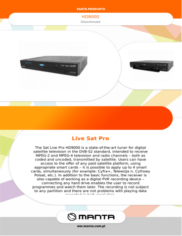 HD9000 Discontinued LiveSatPro TheSatLiveProHD9000isastate-of-the-arttunerfordigital satellitetelevisionintheDVB-S2standard,intendedtoreceive MPEG-2andMPEG-4televisionandradiochannels–bothas codedanduncoded,transmittedbysatellite.Userscanhave accesstotheofferofanypaidsatelliteplatform,using appropriatesmartcards–itispossibletoapplyupto4smart cards,simultaneously(forexample:Cyfra+,Telewizjan,Cyfrowy Polsat,etc.).Inadditiontothebasicfunctions,thereceiveris alsocapableofworkingasadigitalPVRrecordingdevice– connectinganyharddriveenablestheusertorecord programmesandwatchthemlater.Therecordingisnotsubject toanypartitionandtherearenotproblemswithplayingdata recordedinhighresolution. HD9000 Discontinued Specification Thereceiverprovidesresolutionof1080p.The devicehasaHDMIoutputinthe1.3standard;2CI socketstoconnectConditionalAccessModules and2cardreaders;2USBconnectorstoconnect drivesandaneSATAsockettoconnectanexternal drive.Therearpanelcontainsasetofoutlets:2x SCART(onlyintheHD9000model),Component (resolutionupto1080p),Composite,stereosound outputsandanopticaloutputfortheSPDIFdigital sound. http://www.manta.com.pl/en/hd9000 EAN:5907642616796