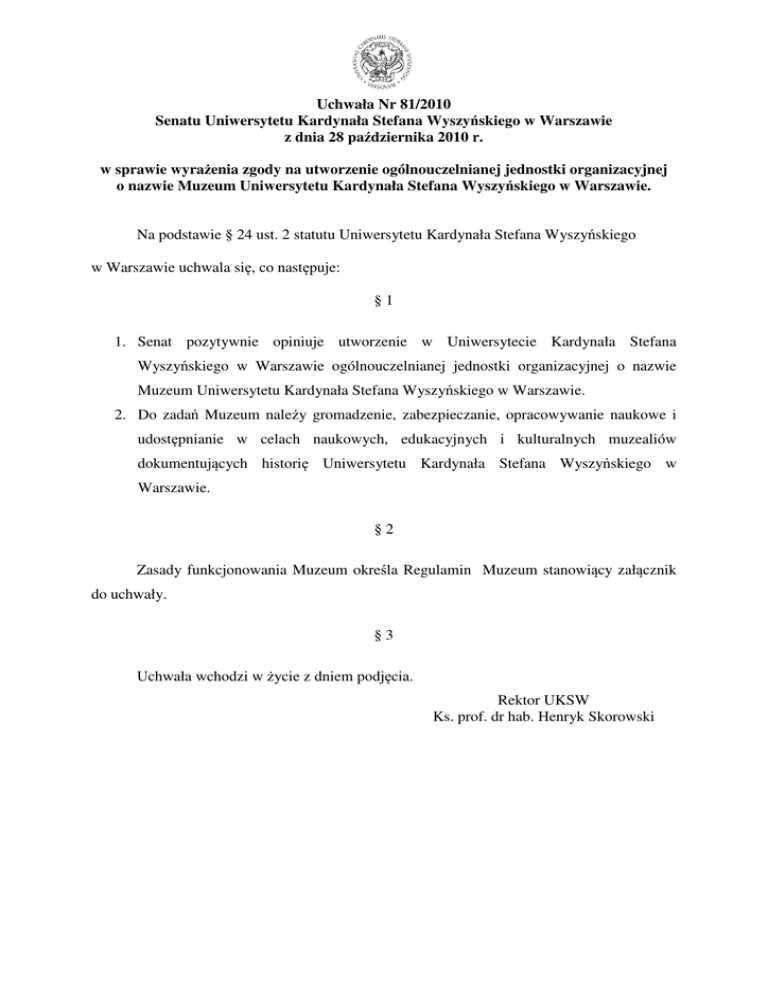 Uchwała Nr 81/2010 Senatu Uniwersytetu Kardynała Stefana Wyszyńskiego w Warszawie z dnia 28 października 2010 r. w sprawie wyrażenia zgody na utworzenie ogólnouczelnianej jednostki organizacyjnej o nazwie Muzeum Uniwersytetu Kardynała Stefana Wyszyńskiego w Warszawie. Na podstawie § 24 ust. 2 statutu Uniwersytetu Kardynała Stefana Wyszyńskiego w Warszawie uchwala się, co następuje: §1 1. Senat pozytywnie opiniuje utworzenie w Uniwersytecie Kardynała Stefana Wyszyńskiego w Warszawie ogólnouczelnianej jednostki organizacyjnej o nazwie Muzeum Uniwersytetu Kardynała Stefana Wyszyńskiego w Warszawie. 2. Do zadań Muzeum należy gromadzenie, zabezpieczanie, opracowywanie naukowe i udostępnianie w celach naukowych, edukacyjnych i kulturalnych muzealiów dokumentujących historię Uniwersytetu Kardynała Stefana Wyszyńskiego w Warszawie. §2 Zasady funkcjonowania Muzeum określa Regulamin Muzeum stanowiący załącznik do uchwały. §3 Uchwała wchodzi w życie z dniem podjęcia. Rektor UKSW Ks. prof. dr hab. Henryk Skorowski
