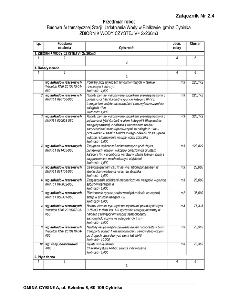 Załącznik Nr 2.4 Przedmiar robót Budowa Automatycznej Stacji Uzdatniania Wody w Białkowie, gmina Cybinka ZBIORNIK WODY CZYSTEJ V= 2x260m3 Lp. Podstawa ustalenia Opis robót 1. ZBIORNIK WODY CZYSTEJ V= 2x 260m3 1 2 Jedn. miary Obmiar 4 5 4 5 3 1. Roboty ziemne 1 2 1 wg nakładów rzeczowych Wacetob KNR 2010115-01060 2 wg nakładów rzeczowych KNNR 1 020106-060 3 wg nakładów rzeczowych KNNR 1 020503-060 4 wg nakładów rzeczowych KNNR 1 021405-060 5 wg nakładów rzeczowych KNNR 1 031104-060 6 wg nakładów rzeczowych KNNR 1 040802-060 7 wg nakładów rzeczowych KNNR 1 050301-050 8 wg nakładów rzeczowych Wacetob KNR 2010207-03060 9 wg nakładów rzeczowych Wacetob KNR 2010210-04060 10 wg ceny jednostkowej -060 2. Płyta denna 1 3 Pomiary przy wykopach fundamentowych w terenie równinnym i nizinnym krotność= 1,000 Roboty ziemne wykonywane koparkami przedsiębiernymi o pojemności łyŜki 0,40m3 w gruncie kategorii III-IV z transportem urobku samochodami samowyładowczymi na odległość 1km krotność= 1,000 Roboty ziemne wykonywane koparkami przedsiębiernymi o pojemności łyŜki 0,40m3 w ziemi kategorii I-III uprzednio zmagazynowanej w hałdach z transportem urobku samochodami samowyładowczymi na odległość 1km przewiezienie ziemi z tymczasowego odkladu do zasypania wykopu i sformowania nasypu wokól zbiornika krotność= 1,000 Zasypanie wykopów fundamentowych podłuŜnych, punktowych, rowów, wykopów obiektowych gruntem kategorii III-IV o grubości warstwy w stanie luźnym 25cm z zagęszczeniem mechanicznym ubijakami krotność= 1,000 Obsypka gruntem kat. III na wys. 80cm ponad teren w strefie doprowadzenia ruroc. do zbornika krotność= 1,000 Zagęszczanie ubijakami mechanicznymi nasypów w gruncie spoistym kategorii III krotność= 1,000 Plantowanie ręczne powierzchni (obrobienie na czysto) skarp w gruncie kategorii I-III krotność= 1,000 Roboty ziemne wykonywane koparkami przedsiębiernymi 0.25 m3 w ziemi kat. I-III uprzednio zmagazynowanej w hałdach z transportem urobku samochodami samowyładowczymi na odległość do 1 km krotność= 1,000 Nakłady uzupełniające za kaŜde dalsze rozpoczęte 0.5 km transportu ponad 1 km samochodami samowyładowczymi po drogach utwardzonych ziemi kat. III-IV krotność= 10,000 Opłata wysypiskowa Charakterystyka Robót: analiza indywidualna krotność= 1,000 2 4 3 GMINA CYBINKA, ul. Szkolna 5, 69-108 Cybinka m3 225,142 m3 225,142 m3 225,142 m3 123,829 m3 28,000 m3 28,000 m2 35,000 m3 73,313 m3 73,313 m3 73,313 5 Załącznik Nr 2.4 Lp. Podstawa ustalenia 11 wg nakładów rzeczowych Wacetob KNR 2010506-04050 12 wg nakładów rzeczowych KNNR 2 120101-060 13 wg nakładów rzeczowych KNR 2-021914-04-050 14 wg nakładów rzeczowych KNNR 2 060104-050 15 wg nakładów rzeczowych KNNR 2 060108-050 16 wg nakładów rzeczowych KNNR 2 010202-050 17 wg nakładów rzeczowych KNNR 2 010202-050 18 wg nakładów rzeczowych KNNR 2 010404-034 19 wg nakładów rzeczowych KNNR 2 010404-034 20 wg nakładów rzeczowych KNNR 2 010405-034 21 wg nakładów rzeczowych KNNR 2 010904-060 22 wg nakładów rzeczowych -148 23 wg nakładów rzeczowych -148 24 wg nakładów rzeczowych KNNR 2 120202-050 25 wg nakładów rzeczowych KNNR 2 120203-050 26 wg nakładów rzeczowych KNNR 4 142701-020 27 wg nakładów rzeczowych KNNR 4 142702-020 Opis robót Plantowanie dna wykopów wykonywanych mechanicznie w gruncie kat. I-III krotność= 1,000 Podkłady betonowe - podloŜe betonowe grub. 10cm, beton C 8/10 krotność= 1,000 Zatarcie powierzchni betonu na gładko krotność= 1,000 Izolacje przeciwwilgociowe dwuwarstwowe z papy na lepiku powierzchni poziomych krotność= 1,000 Izolacje przeciwwilgociowe dwuwarstwowe z papy na lepiku powierzchni pionowych krotność= 1,000 Deskowanie systemowe drobnowymiarowe konstrukcji Ŝelbetowych płyt fundamentowych krotność= 1,000 Deskowanie systemowe drobnowymiarowe płyt fundamentowych Ŝelbetowych krotność= 1,000 Zbrojenie konstrukcji monolitycznych prętami stalowymi okrągłymi Ŝebrowanymi A IIIN śr. 8 mm krotność= 1,000 Zbrojenie konstrukcji monolitycznych prętami stalowymi okrągłymi Ŝebrowanymi A IIIN śr.12 mm krotność= 1,000 Zbrojenie konstrukcji monolitycznych prętami stalowymi okrągłymi Ŝebrowanymi A IIIN śr. 16 mm krotność= 1,000 Betonowanie zbrojonych płyt fundamentowych w deskowaniu systemowym drobnowymiarowym z transportem betonu pompą - beton C 20/25 (B-25) XC2 krotność= 1,000 Praca deskowania ścian prostych podczas zbrojenia plyty fundamentowej i dojrzewania betonu - 0,16kpl/100m2 deskowania krotność= 0,160 Praca deskowania ścian łukowych podczas zbrojenia plyty fundamentowej i dojrzewania betonu - 0,16kpl/100m2 deskowania krotność= 0,160 Warstwy wyrównawcze z zaprawy cementowej pod posadzki grubości 20mm zatarte na gładko - zaprawa cem. M12 krotność= 1,000 Warstwy wyrównawcze z zaprawy cementowej pod posadzki - zmiana grubości o 10 mm krotność= 5,000 Przejścia szczelne rurami PE d 160 owiniętych w połowie dług. taśmą Waterstop + rura PE d 160 z tulejami kołnierzowymi i kołnierzami ruchomymi krotność= 1,000 Przejście szczelne rurami PE w połowie dług. taśmą Waterstop + rura PE d 225 tulejami kołnierzowymi i kołnierzami ruchomymi krotność= 1,000 GMINA CYBINKA, ul. Szkolna 5, 69-108 Cybinka Jedn. miary Obmiar m2 126,613 m3 12,661 m2 126,613 m2 126,613 m2 3,120 m2 15,940 m2 15,951 t 0,021 t 2,279 t 2,444 m3 50,275 m-g 80,000 m-g 80,000 m2 96,879 m2 96,879 szt 2,000 szt 4,000 Załącznik Nr 2.4 Lp. Podstawa ustalenia 28 wg nakładów rzeczowych KNNR 4 142703-020 Opis robót Przejście szczelne rurami PE d 315 owiniętymi w połowie długosci taśmą Waterstop z tulejami kołnierzowymi i kołnierzami ruchomymi Charakterystyka Robót: analogia krotność= 1,000 3. Ściany Ŝelbetowe zbiornika 1 2 Jedn. miary Obmiar szt 4 2,000 5 3 29 wg nakładów rzeczowych KNR 2-021907-03-050 30 wg nakładów rzeczowych KNR 2-021907-04-050 31 wg nakładów rzeczowych KNR 2-02190