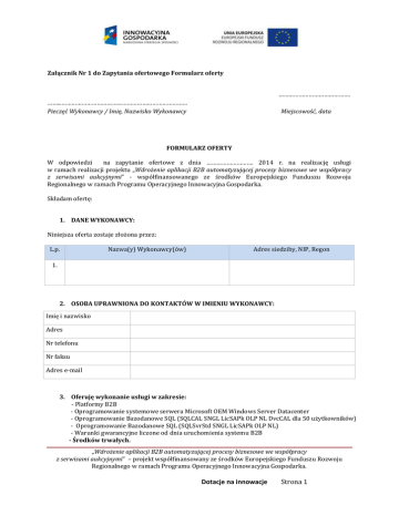 Załącznik Nr 1 do Zapytania ofertowego Formularz oferty ……………………………………. ……...………………………………………………………………… Pieczęć Wykonawcy / Imię, Nazwisko Wykonawcy Miejscowość, data FORMULARZ OFERTY W odpowiedzi na zapytanie ofertowe z dnia ………………………. 2014 r. na realizację usługi w ramach realizacji projektu „Wdrożenie aplikacji B2B automatyzującej procesy biznesowe we współpracy z serwisami aukcyjnymi” - współfinansowanego ze środków Europejskiego Funduszu Rozwoju Regionalnego w ramach Programu Operacyjnego Innowacyjna Gospodarka. Składam ofertę: 1. DANE WYKONAWCY: Niniejsza oferta zostaje złożona przez: L.p. Nazwa(y) Wykonawcy(ów) Adres siedziby, NIP, Regon 1. 2. OSOBA UPRAWNIONA DO KONTAKTÓW W IMIENIU WYKONAWCY: Imię i nazwisko Adres Nr telefonu Nr faksu Adres e-mail 3. Oferuję wykonanie usługi w zakresie: - Platformy B2B - Oprogramowanie systemowe serwera Microsoft OEM Windows Server Datacenter - Oprogramowanie Bazodanowe SQL (SQLCAL SNGL LicSAPk OLP NL DvcCAL dla 50 użytkowników) - Oprogramowanie Bazodanowe SQL (SQLSvrStd SNGL LicSAPk OLP NL) - Warunki gwarancyjne liczone od dnia uruchomienia systemu B2B - Środków trwałych. „Wdrożenie aplikacji B2B automatyzującej procesy biznesowe we współpracy z serwisami aukcyjnymi” – projekt współfinansowany ze środków Europejskiego Funduszu Rozwoju Regionalnego w ramach Programu Operacyjnego Innowacyjna Gospodarka. Dotacje na innowacje Strona 1 * Serwer * UPS * Macierz dyskowa * Biblioteka taśmowa * Przełącznik sieciowy – 5 szt. * Upgrade Cena za całość usługi: tj. cena netto ………………………………………………..…………..……………………. PLN wraz z kosztami Wykonawcy. Słownie:…………………………………………………..…………………………………….…………………………..………………złotych. W rozbiciu na: 1etap dotyczy Ilość projektów IT (szt.) Udokumentowanie wiedzy i doświadczenia w projektach z dziedziny IT o wartości minimum 500 000 zł netto każdy 2 etap Oferta Wartości Niematerialne i Prawne a) platformy B2B b) oprogramowanie systemowe serwera Microsoft OEM Windows Server Datacenter c) Oprogramowanie Bazodanowe SQL (SQLCAL SNGL LicSAPk OLP NL DvcCAL dla 50 użytkowników) d) Oprogramowanie Bazodanowe SQL (SQLSvrStd SNGL LicSAPk OLP NL) e) Okres gwarancji liczony od dnia uruchomienia systemu B2B (liczba miesięcy) Środki trwałe f) Serwer g) UPS h) Macierz dyskowa i) Biblioteka taśmowa j) Przełącznik sieciowy – 5 szt. k) Upgrade „Wdrożenie aplikacji B2B automatyzującej procesy biznesowe we współpracy z serwisami aukcyjnymi” – projekt współfinansowany ze środków Europejskiego Funduszu Rozwoju Regionalnego w ramach Programu Operacyjnego Innowacyjna Gospodarka. Dotacje na innowacje Strona 2 Oświadczenia Wykonawcy Wykonawca oświadcza, że zna i akceptuje warunki realizacji zamówienia określone w zapytaniu ofertowym oraz nie wnosi żadnych zastrzeżeń i uwag w tym zakresie oraz posiada kwalifikację do wykonania zamówienia. Oferta ważna przez 30 dni licząc od daty upłynięcia terminu składania ofert. Miejscowość ……………………………….., dnia …………………… ……………………………………………. Podpis osoby upoważnionej do reprezentacji zgodnie z dokumentem rejestrowym. „Wdrożenie aplikacji B2B automatyzującej procesy biznesowe we współpracy z serwisami aukcyjnymi” – projekt współfinansowany ze środków Europejskiego Funduszu Rozwoju Regionalnego w ramach Programu Operacyjnego Innowacyjna Gospodarka. Dotacje na innowacje Strona 3 Załącznik nr 2 do Zapytania ofertowego Oświadczenie Firma ……………………………………………………………………………… oświadcza, że znajduje się w dobrej sytuacji ekonomicznej i finansowej zapewniającej wykonanie zamówienia, tzn.: a) wobec firmy nie jest prowadzone żadne postępowanie egzekucyjne i nie ogłoszono upadłości; b) nie zalega z opłaceniem podatków, opłat oraz składek na ubezpieczenie zdrowotne, społeczne. ……………………………………………. Podpis osoby upoważnionej do reprezentacji zgodnie z dokumentem rejestrowym. „Wdrożenie aplikacji B2B automatyzującej procesy biznesowe we współpracy z serwisami aukcyjnymi” – projekt współfinansowany ze środków Europejskiego Funduszu Rozwoju Regionalnego w ramach Programu Operacyjnego Innowacyjna Gospodarka. Dotacje na innowacje Strona 4 Załącznik nr 3 do Zapytania ofertowego Harmonogramem działań etap obejmujący okres od dnia podpisania umowy do 31-01-2014 - Oprogramowanie systemowe serwera Microsoft OEM Windows Server Datacenter. - Oprogramowanie Bazodanowe SQL (SQLCAL SNGL LicSAPk OLP NL DvcCAL dla 50 użytkowników) - Oprogramowanie Bazodanowe SQL (SQLSvrStd SNGL LicSAPk OLP NL) - Upgrade - Przełącznik sieciowy (5 sztuk) - Biblioteka taśmowa - Macierz dyskowa P2000 - UPS - Serwer etap obejmujący okres 01-02-2014 - 31-05-2014 - System B2B - płatność dla wykonawcy etap obejmujący okres 01-06-2014 - 30-09-2014 - System B2B - płatność dla wykonawcy etap obejmujący okres 01-10-2014 - 31-12-2014 - System B2B - płatność dla wykonawcy ……………………………………………. Podpis osoby upoważnionej do reprezentacji zgodnie z dokumentem rejestrowym. „Wdrożenie aplikacji B2B automatyzującej procesy biznesowe we współpracy z serwisami aukcyjnymi” – projekt współfinansowany ze środków Europejskiego Funduszu Rozwoju Regionalnego w ramach Programu Operacyjnego Innowacyjna Gospodarka. Dotacje na innowacje Strona 5