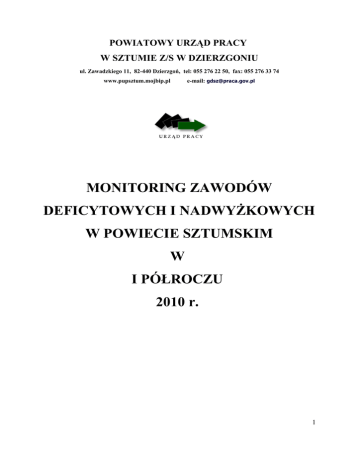 POWIATOWY URZĄD PRACY W SZTUMIE Z/S W DZIERZGONIU ul. Zawadzkiego 11, 82-440 Dzierzgoń, tel: 055 276 22 50, fax: 055 276 33 74 www.pupsztum.mojbip.pl e-mail: [email protected] MONITORING ZAWODÓW DEFICYTOWYCH I NADWYŻKOWYCH W POWIECIE SZTUMSKIM W I PÓŁROCZU 2010 r. 1 Dzierzgoń, październik 2010 SPIS TREŚCI 1. WSTĘP ..........................................................................................................................…. 3 2. ANALIZA BEZROBOCIA WG ZAWODÓW (grup zawodów) w I PÓŁROCZU 2010r....................................................................................................…. 5 2.1 Dane ogólne .....................................................................................................…. 5 2.2 Najliczniejsze grupy zawodowe ……………………………….……………….. 6 2.3 Najmniej liczne grupy zawodowe...................................................................…. 8 2.4 Napływ osób bezrobotnych wg zawodów i specjalności ..............................…. 9 3. ANALIZA OFERT PRACY ZGŁOSZONYCH W I PÓŁROCZU 2010 r…………. 13 3.1 Oferty pracy wg zawodów ……………………………………………………. 13 3.2 Oferty pracy wg rodzaju działalności ……………………………………….. 15 3.2 Bezrobotni wg rodzaju działalności, ostatniego miejsca pracy oraz oferty pracy ...................................................................................................... 15 4. ANALIZA ZAWODÓW DEFICYTOWYCH I NADWYŻKOWYCH w I PÓŁROCZU 2010 r. ………………………………………………………………….. 19 4.1 Zawody nadwyżkowe …………………………………………………………. 19 4.2 Zawody zrównoważone ……………………………………………………….. 20 4.3 Zawody deficytowe ……………………………………………………………. 21 4.4 Zawody max-deficytowe …………………………………………………….... 23 5. PODSUMOWANIE I WNIOSKI.................................................................................... 24 6. SPIS TABEL I WYKRESÓW ........................................................................................ 26 2 1. WSTĘP Celem niniejszego opracowania jest określenie kierunków i natężenia zmian zachodzących w strukturze zawodowo-kwalifikacyjnej na terenie powiatu sztumskiego. Opracowanie umożliwi stworzenie bazy informacyjnej dla wyznaczenia przyszłych struktur zawodowo – kwalifikacyjnych w układzie lokalnym. Przez monitoring zawodów deficytowych i nadwyżkowych należy rozumieć proces systematycznego obserwowania zjawisk zachodzących na rynku pracy, dotyczących kształtowania popytu na pracę i podaży zasobów pracy w przekroju terytorialno – zawodowym oraz formułowania na tej podstawie ocen, wniosków i krótkotrwałych prognoz niezbędnych dla prawidłowego funkcjonowania systemów: szkolenia osób bezrobotnych oraz kształcenia zawodowego. Zawód deficytowy to zawód, na który występuje na rynku pracy zapotrzebowanie wyższe niż liczba osób poszukujących pracy w tym zawodzie. Zawód nadwyżkowy to zawód, na który na rynku pracy występuje zapotrzebowanie mniejsze od liczby osób poszukujących pracy w tym zawodzie. Wdrożenie monitoringu zawodów deficytowych i nadwyżkowych pozwoli na: 1. podniesienie świadomości przedstawicieli instytucji rynku pracy oraz sfery edukacji w zakresie potrzeb rynku pracy, poprzez upowszechnienie wyników monitoringu zawodów nadwyżkowych i deficytowych - kompleksowych analiz pod kątem popytu na określone zawody i kwalifikacje oraz uwzględniających zmiany zachodzące na rynku; 2. stworzenie mechanizmu pozwalającego skoordynować politykę podmiotów rynku pracy i sektora edukacyjnego z potrzebami rynku pracy; 3. usprawnienie poradnictwa zawodowego poprzez wskazanie zawodów deficytowych i nadwyżkowych; 3 4. ułatwienie realizacji programów specjalnych dla aktywizacji osób długotrwale bezrobotnych w celu promowania ich ponownego zatrudnienia; 5. usprawnienie pośrednictwa pracy poprzez uzyskanie informacji o planowanych ofertach pracy na rok przyszły oraz przewidywanej liczbie absolwentów wg zawodów; 6. określenie odpowiednich kierunków szkolenia bezrobotnych, zapewniając większą efektywność organizowanych szkoleń. Źródłem informacji do opracowania niniejszego raportu są: Załącznik 2 do sprawozdania MPiPS-01 – „Bezrobotni według rodzaju działalności ostatniego miejsca pracy, poszukujący pracy oraz wolne miejsca pracy i miejsca aktywizacji zawodowej”. Stan za I półrocze 2010 roku. Załącznik 3 do sprawozdania MPiPS-01 - „Bezrobotni oraz wolne miejsca pracy i miejsca aktywizacji zawodowej według zawodów i specjalności” Stan za I półrocze 2010”. Monitoring dotyczy 30 dużych grup zawodowych (kod 2 cyfrowy), 392 grup elementarnych (kod 4 cyfrowy) oraz 1770 zawodów i specjalności określonych w „Klasyfikacji zawodów i specjalności” wprowadzonej do stosowania z dnia 8 grudnia 2004 r. (Dz. Rozporządzeniem U z 2004 r. Nr 265, poz. 2644 ) oraz Ministra Gospodarki i Pracy Rozporządzeniem Ministra Pracy i Polityki Społecznej z dnia 1 czerwca 2007 r. zmieniającym rozporządzenie w sprawie klasyfikacji zawodów i specjalności dla potrzeb rynku pracy oraz zakresu jej stosowania (Dz. U z 2007 r. Nr 106, poz. 728). Głównymi użytkownikami „Monitoringu zawodów deficytowych i nadwyżkowych” są m.in.: - władze oświatowe wszelkich szczebli, - instytucje szkoleniowe, - inne zainteresowane organy rządowe, samorządowe, organizacje pozarządowe. 4 2. ANALIZA BEZROBOCIA WG ZAWODÓW (grup zawodów) w I półroczu 2010r. 2.1 Dane ogólne. Wg stanu na dzień 30.06.2010r. w Powiatowym Urzędzie Pracy w Sztumie z/s w Dzierzgoniu zarejestrowanych było 2828 osób bezrobotnych, w tym 1601 kobiet. Stopa bezrobocia na koniec I półrocza 2010 r. wyniosła: - 21,3 % 