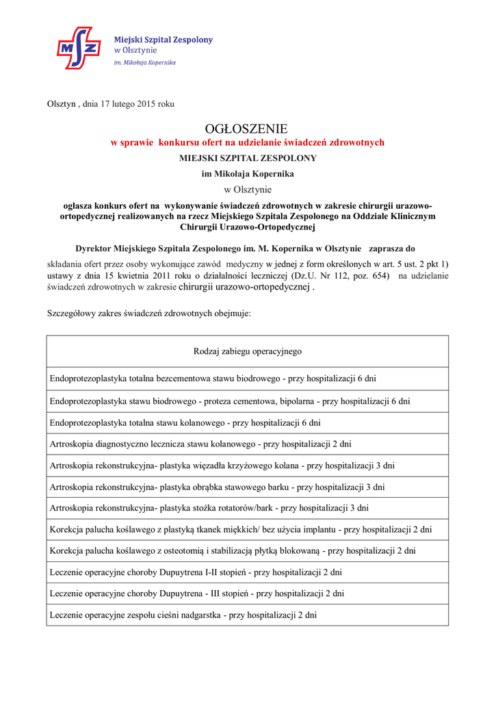 Olsztyn , dnia 17 lutego 2015 roku OGŁOSZENIE w sprawie konkursu ofert na udzielanie świadczeń zdrowotnych MIEJSKI SZPITAL ZESPOLONY im Mikołaja Kopernika w Olsztynie ogłasza konkurs ofert na wykonywanie świadczeń zdrowotnych w zakresie chirurgii urazowoortopedycznej realizowanych na rzecz Miejskiego Szpitala Zespolonego na Oddziale Klinicznym Chirurgii Urazowo-Ortopedycznej Dyrektor Miejskiego Szpitala Zespolonego im. M. Kopernika w Olsztynie zaprasza do składania ofert przez osoby wykonujące zawód medyczny w jednej z form określonych w art. 5 ust. 2 pkt 1) ustawy z dnia 15 kwietnia 2011 roku o działalności leczniczej (Dz.U. Nr 112, poz. 654) na udzielanie świadczeń zdrowotnych w zakresie chirurgii urazowo-ortopedycznej . Szczegółowy zakres świadczeń zdrowotnych obejmuje: Rodzaj zabiegu operacyjnego Endoprotezoplastyka totalna bezcementowa stawu biodrowego - przy hospitalizacji 6 dni Endoprotezoplastyka stawu biodrowego - proteza cementowa, bipolarna - przy hospitalizacji 6 dni Endoprotezoplastyka totalna stawu kolanowego - przy hospitalizacji 6 dni Artroskopia diagnostyczno lecznicza stawu kolanowego - przy hospitalizacji 2 dni Artroskopia rekonstrukcyjna- plastyka więzadła krzyżowego kolana - przy hospitalizacji 3 dni Artroskopia rekonstrukcyjna- plastyka obrąbka stawowego barku - przy hospitalizacji 3 dni Artroskopia rekonstrukcyjna- plastyka stożka rotatorów/bark - przy hospitalizacji 3 dni Korekcja palucha koślawego z plastyką tkanek miękkich/ bez użycia implantu - przy hospitalizacji 2 dni Korekcja palucha koślawego z osteotomią i stabilizacją płytką blokowaną - przy hospitalizacji 2 dni Leczenie operacyjne choroby Dupuytrena I-II stopień - przy hospitalizacji 2 dni Leczenie operacyjne choroby Dupuytrena - III stopień - przy hospitalizacji 2 dni Leczenie operacyjne zespołu cieśni nadgarstka - przy hospitalizacji 2 dni Kompleksowe zabiegi korekcyjne kręgosłupa piersiowego lub lędźwiowo-krzyżowego - przy hospitalizacji 6 dni Stabilizacja tylna odcinka szyjnego kręgosłupa z usztywnieniem potyliczno-szyjnym - przy hospitalizacji 6 dni Zabiegi operacyjne na kręgosłupie szyjnym z dostępu przedniego za 1 poziom - przy hospitalizacji 3 dni Zabiegi operacyjne na kręgosłupie piersiowo-lędźwiowo-krzyżowym techniką małoinwazyjną /MISS/ przy uwzględnieniu hospitalizacji do 4 dni, badań (lab.rtg), znieczulenia, operacji i implantu Szczegółowe warunki konkursu ofert, materiały informacyjne o przedmiocie konkursu oraz formularze ofertowe dostępne są w siedzibie Udzielającego zamówienie: Olsztyn, ul. Nieodległości 44 pokój nr 3oraz , nr tel.89 532 64 16 Miejsce i termin składania ofert : Oferty wraz oświadczeniem o zapoznaniu się z projektem Umowy i dokumentami potwierdzającymi kwalifikacje odpowiadające rodzajowi świadczeń objętych niniejszym konkursem składa się w formie pisemnej, w zamkniętej kopercie w nieprzekraczalnym terminie do dnia 23 lutego 2015 r. do godz. 14.00 na adres: Miejski Szpital Zespolony 10-045 Olsztyn ul. Niepodległości 44 w zaklejonych kopertach oznaczonych napisem: KONKURS OFERT NA UDZIELANIE ŚWIADCZEŃ ZDROWOTNYCH W ZAKRESIE CHIRURGII URAZOWO-ORTOPEDYCZNEJ O zachowaniu terminu decyduje potwierdzona data i godzina wpływu oferty do siedziby Zamawiającego. Otwarcie kopert z ofertami nastąpi w dniu 24 lutego 2015 o godz. 9.00 Termin rozstrzygnięcia konkursu nastąpi w dniu 24 lutego 2015r., Oferent jest związany ofertą w ciągu 30 dni od upływu składania ofert. Udzielający zamówienie zastrzega sobie prawo odwołania konkursu lub przesunięcia terminu składania ofert i rozstrzygnięcia konkursu bez podania przyczyn. W toku postępowania konkursowego, jednakże przed rozstrzygnięciem konkursu, oferent może złożyć komisji konkursowej umotywowaną skargę, natomiast w ciągu 7 dni od otrzymania na piśmie zawiadomienia o zakończeniu konkursu i jego wyniku – umotywowany protest do Udzielającego zamówienia. Oferty złożone po terminie składania ofert nie będą rozpatrywane.