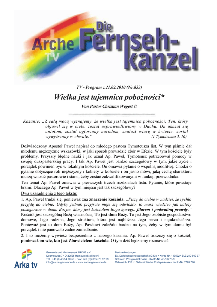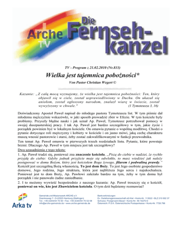 TV - Program z 21.02.2010 (Nr.833) Wielka jest tajemnica poboŜności* Von Pastor Christian Wegert © Kazanie: „Z całą mocą wyznajemy, Ŝe wielka jest tajemnica poboŜności: Ten, który objawił się w ciele, został usprawiedliwiony w Duchu. On ukazał się aniołom, został ogłoszony narodom, znalazł wiarę w świecie, został wywyŜszony w chwale." (1 Tymoteusza 3, 16) Doświadczony Apostoł Paweł napisał do młodego pastora Tymoteusza list. W tym piśmie dał młodemu męŜczyźnie wskazówki, w jaki sposób prowadzić zbór w Efezie. W tym kościele były problemy. Przyszły błędne nauki i jak uznał Ap. Paweł, Tymoteusz potrzebował pomocy w swojej duszpasterskiej pracy. I tak Ap. Paweł jest bardzo szczegółowy w tym, jakie Ŝycie i porządek powinien być w lokalnym kościele. On omawia pytanie o wspólną modlitwę. Chodzi o pytanie dotyczące roli męŜczyzny i kobiety w kościele i on jasno mówi, jaką cechę charakteru muszą wnosić pastorowie i starsi, Ŝeby zostać zakwalifikowanymi w funkcji przewodnika. Ten temat Ap. Paweł omawia w pierwszych trzech rozdziałach listu. Pytanie, które powstaje brzmi: Dlaczego Ap. Paweł w tym miejscu jest tak szczegółowy? Dwa uzasadnienia z tego tekstu: 1. Ap. Paweł trudzi się, poniewaŜ zna znaczenie kościoła. „Piszę do ciebie w nadziei, Ŝe rychło przyjdę do ciebie: Gdyby jednak przyjście moje się odwlokło, to masz wiedzieć jak naleŜy postępować w domu BoŜym, który jest kościołem Boga Ŝywego, filarem i podwaliną prawdy.” Kościół jest szczególną BoŜą własnością. To jest dom BoŜy. To jest Jego osobiste gospodarstwo domowe, Jego rodzina, Jego struktura, która jest najbliŜsza Jego sercu i najukochańsza. PoniewaŜ jest to dom BoŜy, Ap. Pawłowi zaleŜało bardzo na tym, Ŝeby w tym domu był porządek i nie panowało Ŝadne zaniedbanie. 2. I to moŜemy wywieść bezpośrednio z naszego kazania: Ap. Paweł troszczy się o kościół, poniewaŜ on wie, kto jest Zbawicielem kościoła. O tym dziś będziemy rozmawiać! Arka tv Gemeinde und Missionswerk ARCHE e.V. Doerriesweg 7 • D-22525 Hamburg (Stellingen) Tel.: +49 (0)40/54 70 50 • Fax: +49 (0)40/54 70 52 99 [email protected] • www.arche-gemeinde.de Bankverbindungen Ev. Darlehensgenossenschaft eG Kiel • Konto-Nr. 113522 • BLZ 210 602 37 Schweiz: Postgiroamt Basel • Konto-Nr. 40-10270-9 Österreich: P.S.K. Österreichische Postsparkasse • Konto-Nr. 7726.796 Strona 2 - TV-Program 833 / „Wielka jest tajemnica poboŜności“ Tajemnicą poboŜności jest osoba „Bo bezsprzecznie wielka jest tajemnica”, werset 16. Co jest tą tajemnicą, z którą zgadzają się wszyscy chrześcijanie? Tajemnicą chrześcijańskiego Ŝycia jest osoba. „On objawił się w ciele”. On, Jezus, jest tajemnicą chrześcijańskiego Ŝycia. Wiara chrześcijańska nie jest systemem obrzędów, tradycji lub ustalonych warunków. Ona nie jest podręcznikiem dla praktyki moralnie przyzwoitego Ŝycia. Jeśli wiarę mamy ograniczać w tych rzeczach, wtedy my nie poznaliśmy tej tajemnicy poboŜności. Nie, wiara chrześcijańska jest potwierdzeniem poprzez wspólne wyznanie, Ŝe Bóg przyszedł na ten świat i objawił się w Jego Synu Jezusie Chrystusie. Ap. Paweł cytuje do tego wczesnemu kościołowi hymny, które proklamują sześć obiektywnych prawd o tajemnicy wiary. Przypatrzmy się pierwszym trzem prawdom: Objawił się w ciele Jest to prawda numer 1. „Objawił się w ciele” oznacza, Ŝe Bóg niewątpliwie stał się człowiekiem. On osobiście okazał się nie tylko jako człowiek. Nie, on stał się człowiekiem. On wziął ludzką naturę, urodził się z dziewicy. śył całkowicie bezgrzesznym Ŝyciem, a Ŝe nie był zwykłym człowiekiem, było wyraźnie widoczne przez: -Jego Słowa. One były ponadczasowe. Były głęboko prawdziwe. One objawiały ludzkie serca. -Niezwykłą moc, którą On miał. Pomyślmy o licznych uzdrowieniach i cudach, które On czynił. On nawet wzbudzał martwych. -On wiedział, co było w sercu człowieka (Ew. Jana 2, 25). -Ludzie wokół Niego teŜ powiedzieli, Ŝe nikt wcześniej nigdy tak nie mówił jak On. Pismo, które dowodzi, Ŝe Bóg stał się ciałem: „Na początku było słowo, a słowo było u Boga, a Bogiem było słowo… A słowo ciałem się stało i zamieszkało wśród nas” (Ew. Jana 1, 1 i 14). „Lecz gdy nadeszło wypełnienie czasu, zesłał Bóg syna swego, który się narodził z niewiasty i podlegał zakonowi, aby wykupił tych, którzy byli pod zakonem, abyśmy usynowienia dostąpili” (Galacjan 4, 4-5). I podczas, gdy rzymski setnik stał pod krzyŜem i zobaczył jak Jezus umarł, zawołał: „Zaiste, ten był synem BoŜym” (Mateusz 27, 54). Oznacza to, Ŝe sam Bóg stał się człowiekiem. Bóg zostawił swoją chwałę i uniŜył samego siebie i przyjął postać sługi. Usprawiedliwiony w Duchu Prawda nr 2: „Usprawiedliwiony w Duchu” Co to znaczy? W tym musimy wiedzieć, Ŝe Jezus w czasie Jego posługi na ziemi wielokrotnie sam miał prawo roszczyć, Ŝe jest Bogiem. Był to równieŜ powód, tego, Ŝe doznał tak wiele oporu. Mówił na przykład: -„Kto mnie widział, widział Ojca” (Ew. Jana 14, 9). -„Ja i Ojciec jedno jesteśmy” (Ew. Jana 10, 30). Raz po raz Jezus mówił, Ŝe jest Bogiem. Innymi słowy: „Jezus wniósł potęŜne prawo. Twierdząc o sobie, Ŝe jest Bogiem, jest największym prawem, jakie moŜe rościć sobie człowiek. Jeśli umiera gwiazda, nagle pojawia się wielu domniemanych spadkobierców. Wszyscy twierdzą, Ŝe mają prawo do dziedziczenia, utrzymują, Ŝe mają związek pokrewieństwa ze zmarłym. Roszczenie prawa, stawiane przez tych ludzi, musi zostać potwierdzone, zanim stanie się prawomocnie nabyte.” Jezus przyszedł i postawił przed ludem wielkie wezwanie. On twierdził, Ŝe jest Bogiem. Jaki ziemski sąd na całej kuli ziemskiej moŜe sprawdzić tą wypowiedź i albo ją potwierdzić lub odrzucić? Nie moŜe tego