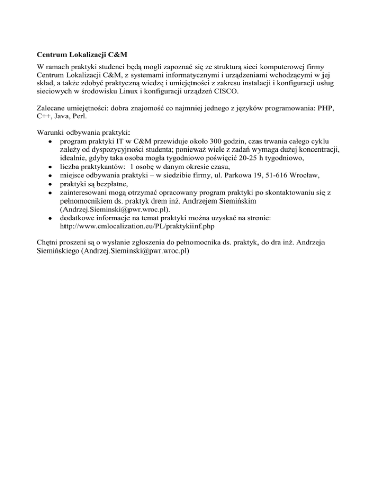 Centrum Lokalizacji C&M W ramach praktyki studenci będą mogli zapoznać się ze strukturą sieci komputerowej firmy Centrum Lokalizacji C&M, z systemami informatycznymi i urządzeniami wchodzącymi w jej skład, a także zdobyć praktyczną wiedzę i umiejętności z zakresu instalacji i konfiguracji usług sieciowych w środowisku Linux i konfiguracji urządzeń CISCO. Zalecane umiejętności: dobra znajomość co najmniej jednego z języków programowania: PHP, C++, Java, Perl. Warunki odbywania praktyki: program praktyki IT w C&M przewiduje około 300 godzin, czas trwania całego cyklu zależy od dyspozycyjności studenta; ponieważ wiele z zadań wymaga dużej koncentracji, idealnie, gdyby taka osoba mogła tygodniowo poświęcić 20-25 h tygodniowo, liczba praktykantów: 1 osobę w danym okresie czasu, miejsce odbywania praktyki – w siedzibie firmy, ul. Parkowa 19, 51-616 Wrocław, praktyki są bezpłatne, zainteresowani mogą otrzymać opracowany program praktyki po skontaktowaniu się z pełnomocnikiem ds. praktyk drem inż. Andrzejem Siemińskim ([email protected]). dodatkowe informacje na temat praktyki można uzyskać na stronie: http://www.cmlocalization.eu/PL/praktykiinf.php Chętni proszeni są o wysłanie zgłoszenia do pełnomocnika ds. praktyk, do dra inż. Andrzeja Siemińskiego ([email protected])