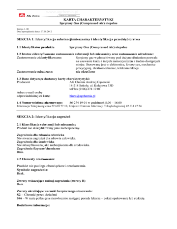 KARTA CHARAKTERYSTYKI Sprężony Gaz (Compressed Air) niepalne Wersja 1. 00 Data sporządzenia karty: 07.08.2012 SEKCJA 1: Identyfikacja substancji/mieszaniny i identyfikacja przedsiębiorstwa 1.1 Identyfikator produktu Sprężony Gaz (Compressed Air) niepalne 1.2 Istotne zidentyfikowane zastosowania substancji lub mieszaniny oraz zastosowania odradzane: Zastosowanie zidentyfikowane: Sprężony gaz wydmuchiwany pod dużym ciśnieniem pozwala na usuwanie kurzu i innych zanieczyszczeń z trudno dostępnych miejsc. Stosowany jest w elektronice, fotooptyce, mechanice precyzyjnej, elektromechanice, telekomunikacji. Zastosowanie odradzane: nie określono 1.3 Dane dotyczące dostawcy karty charakterystyki: Producent AG Chemia Andrzej Gąsowski 18-218 Sokoły, ul. Kolejowa 33D tel/fax (0 86) 274 19 01 Adres e-mail osoby odpowiedzialnej za kartę: [email protected] 1.4 Numer telefonu alarmowego: 86-274 19 01 w godzinach 8.00 – 16.00 Informacja Toksykologiczna 22 618 77 10, Krajowe Centrum Informacji Toksykologicznej 42 631 47 24 SEKCJA 2: Identyfikacja zagrożeń 2.1 Klasyfikacja substancji lub mieszaniny Produkt nie sklasyfikowany jako niebezpieczny. Zagrożenia dla zdrowia człowieka Nie stwarza zagrożeń dla zdrowia człowieka. Zagrożenia dla środowiska Nie sklasyfikowana jako niebezpieczna dla środowiska. Zagrożenia fizyczne/chemiczne Brak. 2.2 Elementy oznakowania: Produkt nie podlega obowiązkowi oznakowania. Symbole zagrożenia: Brak. Zwroty wskazujące rodzaj zagrożenia (zwroty R) Brak. Zwroty określające warunki bezpiecznego stosowania: S2 – Chronić przed dziećmi S46 – W razie połknięcia niezwłocznie zasięgnij porady lekarza – pokaż opakowanie lub etykietę. Dodatkowe informacje: KARTA CHARAKTERYSTYKI Sprężony Gaz (Compressed Air) niepalne Pojemnik pod ciśnieniem: chronić przed słońcem i nagrzaniem powyżej temperatury 50°C. Nie przekłuwać ani nie spalać także po zużyciu. 2.3 Inne zagrożenia: Gaz skroplony pod ciśnieniem. Unikać wdychania gazu. Bezpośredni kontakt z cieczą może powodować odmrożenia. Brak informacji na temat spełnienia kryteriów PBT lub vPvB zgodnie z załącznikiem XIII rozporządzenia REACH. Odpowiednie badania nie były przeprowadzone. SEKCJA 3: Skład/informacja o składnikach 3.1 Substancje: Nie dotyczy. 3.2 Mieszaniny: Niebezpieczne składniki: brak Zawiera: 1,1,1,2- tetra fluoroetan CAS: 811-97-2; WE: 212-377-0 SEKCJA 4: Środki pierwszej pomocy 4.1 Opis środków pierwszej pomocy W przypadku kontaktu ze skórą: Zanieczyszczoną skórę przemyć dużą ilością wody. Jeśli powstanie rana, założyć sterylny opatrunek, zapewnić opiekę medyczną. W przypadku kontaktu z oczami: Oczy płukać dużą ilością wody ok. 15 min., skonsultować się z lekarzem. Narażenie inhalacyjne: Przenieść na świeże powietrze. Jeżeli oddychanie zostało zatrzymane lub jest utrudnione, zastosować oddychanie wspomagane. Może być wskazane podanie tlenu. W przypadku połknięcia: Narażenie tą drogą jest bardzo mało prawdopodobne – produkt w postaci aerozolu. 4.2 Najważniejsze ostre i opóźnione objawy oraz skutki narażenia: Narażenie na atmosferę z niedoborem tlenu może powodować następujące objawy: zawroty głowy, ślinotok, mdłości, wymioty, utrata zdolności ruchowych / przytomności. 4.3 Wskazania dotyczące wszelkiej natychmiastowej pomocy lekarskiej i szczególnego postępowania z poszkodowanym: Decyzję o sposobie postępowania podejmuje lekarz po ocenie stanu poszkodowanego. SEKCJA 5: Postępowanie w przypadku pożaru 5.1 Środki gaśnicze Odpowiednie środki gaśnicze Woda – rozproszone prądy wodne, piana odporna na alkohol, dwutlenek węgla, proszki gaśnicze. Niewłaściwe środki gaśnicze: Brak. KARTA CHARAKTERYSTYKI Sprężony Gaz (Compressed Air) niepalne 5.2 Szczególne zagrożenia związane z substancją lub mieszaniną: W wyniku narażenia na działanie intensywnego ciepła lub płomienia, butla ulegnie szybkiemu opróżnieniu i/lub gwałtownemu rozerwaniu. Produkt jest niepalny i nie podtrzymuje palenia. 5.3 Informacje dla straży pożarnej Nie dopuścić do przedostania się środków gaśniczych do kanalizacji i cieków wodnych. Zawiadomić otoczenie o pożarze. Usunąć z obszaru zagrożenia wszystkie osoby niebiorące udziału w likwidowaniu pożaru. Powiadomić Państwową Straż Pożarną, a w razie konieczności także Policję Państwową, najbliższe władze terenowe i najbliższą jednostkę Ratownictwa Chemicznego. Nałożyć odzież ochronną gazoszczelną i aparat izolujący drogi oddechowe (aparat tlenowy skompletowany z maską). SEKCJA 6: Postępowanie w przypadku niezamierzonego uwolnienia do środowiska 6.1 Indywidualne środki ostrożności, wyposażenie ochronne i procedury w sytuacjach awaryjnych: Dla osób nienależących do personelu udzielającego pomocy: zawiadomić o awarii odpowiednie służby. Usunąć z obszaru zagrożenia osoby niebiorące udziału w likwidacji awarii. Dla osób udzielających pomocy: zadbać o odpowiednie wietrzenie, monitorować stężenie tlenu w środowisku. W przypadku obniżonej zawartości tlenu stosować izolujący aparat oddechowy. 6.2 Środki ostrożności w zakresie ochrony środowiska W razie awarii nie dopuszczać do zrzutów do środowiska. Zapobiegać przedostawaniu się do kanalizacji, piwnic, zagłębień terenu oraz innych miejsc, gdzie jego gromadzenie się może być niebezpieczne. 6.3 Metody i materiały zapobiegające rozprzestrzenianiu się skażenia i służące do usuwania skażenia: Jeśli jest to możliwe, zatrzymać wypływ produktu. Zwiększyć wentylację w obszarze uwolnienia i monitorować poziom tlenu. 6.4 Odniesienia do innych sekcji: Postępowanie z odpadami produktu – patrz sekcja 13 karty. Środki ochrony indywidualnej – patrz sekcja 8 karty. SEKCJA 7: Postępowanie z substancjami i mieszaninami oraz ich magazynowanie 7.1 Środki ostrożności dotyczące bezpiecznego postępowania: Stosować właściwą wen