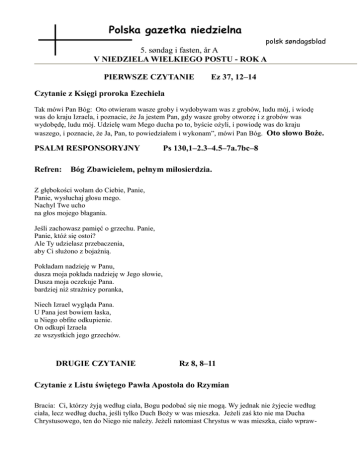 Polska gazetka niedzielna polsk søndagsblad 5. søndag i fasten, år A V NIEDZIELA WIELKIEGO POSTU - ROK A PIERWSZE CZYTANIE Ez 37, 12–14 Czytanie z Księgi proroka Ezechiela Tak mówi Pan Bóg: Oto otwieram wasze groby i wydobywam was z grobów, ludu mój, i wiodę was do kraju Izraela, i poznacie, że Ja jestem Pan, gdy wasze groby otworzę i z grobów was wydobędę, ludu mój. Udzielę wam Mego ducha po to, byście ożyli, i powiodę was do kraju waszego, i poznacie, że Ja, Pan, to powiedziałem i wykonam”, mówi Pan Bóg. Oto słowo Boże. PSALM RESPONSORYJNY Refren: Ps 130,1–2.3–4.5–7a.7bc–8 Bóg Zbawicielem, pełnym miłosierdzia. Z głębokości wołam do Ciebie, Panie, Panie, wysłuchaj głosu mego. Nachyl Twe ucho na głos mojego błagania. Jeśli zachowasz pamięć o grzechu. Panie, Panie, któż się ostoi? Ale Ty udzielasz przebaczenia, aby Ci służono z bojaźnią. Pokładam nadzieję w Panu, dusza moja pokłada nadzieję w Jego słowie, Dusza moja oczekuje Pana. bardziej niż strażnicy poranka, Niech Izrael wygląda Pana. U Pana jest bowiem łaska, u Niego obfite odkupienie. On odkupi Izraela ze wszystkich jego grzechów. DRUGIE CZYTANIE Rz 8, 8–11 Czytanie z Listu świętego Pawła Apostoła do Rzymian Bracia: Ci, którzy żyją według ciała, Bogu podobać się nie mogą. Wy jednak nie żyjecie według ciała, lecz według ducha, jeśli tylko Duch Boży w was mieszka. Jeżeli zaś kto nie ma Ducha Chrystusowego, ten do Niego nie należy. Jeżeli natomiast Chrystus w was mieszka, ciało wpraw- dzie podlega śmierci ze względu na skutki grzechu, duch jednak posiada życie na skutek usprawiedliwienia. A jeżeli mieszka w was Duch Tego, który Jezusa wskrzesił z martwych, to Ten, co wskrzesił Jezusa Chrystusa z martwych, przywróci do życia wasze śmiertelne ciała mocą mieszkającego w was Ducha. Oto słowo Boże. ŚPIEW PRZED EWANGELIĄ J 11, 25a.26 Chwała Tobie, Słowo Boże Ja jestem zmartwychwstanie i życie, Kto we mnie wierzy, nie umrze na wieki. Chwała Tobie, Słowo Boże EWANGELIA KRÓTSZA J 11,3–7.17.20–27.33b–45 Słowa Ewangelii według świętego Jana Siostry Łazarza posłały do Jezusa wiadomość: „Panie, oto choruje ten, którego Ty kochasz”. Jezus usłyszawszy to rzekł: „Choroba ta nie zmierza ku śmierci, ale ku chwale Bożej, aby dzięki niej Syn Boży został otoczony chwałą”. A Jezus miłował Martę i jej siostrę,i Łazarza. Mimo jednak że słyszał o jego chorobie, zatrzymał się przez dwa dni w miejscu pobytu. Dopiero potem powiedział do swoich uczniów: „Chodźmy znów do Judei”. Kiedy Jezus tam przybył, zastał Łazarza już od czterech dni spoczywającego w grobie. Kiedy zaś Marta dowiedziała się, że Jezus nadchodzi, wyszła Mu na spotkanie. Maria zaś siedziała w domu. Marta rzekła do Jezusa: „Panie, gdybyś tu był, mój brat by nie umarł. Lecz i teraz wiem, że Bóg da Ci wszystko, o cokolwiek byś prosił Boga”. Rzekł do niej Jezus: „Brat twój zmartwychwstanie”. Rzekła Marta do Niego: „Wiem, że zmartwychwstanie w czasie zmartwychwstania w dniu ostatecznym”. Rzekł do niej Jezus: „Ja jestem zmartwychwstaniem i życiem.Kto we Mnie wierzy, choćby i umarł, żyć będzie. Każdy, kto żyje i wierzy we Mnie, nie umrze na wieki. Wierzysz w to?” Odpowiedziała Mu: „Tak, Panie! Ja wciąż wierzę, żeś Ty jest Mesjasz, Syn Boży, który miał przyjść na świat”. Jezus wzruszył się w duchu, rozrzewnił i zapytał: „Gdzieście go położyli?”. Odpowiedzieli Mu: „Panie, chodź i zobacz”. Jezus zapłakał. A Żydzi rzekli: „Oto jak go miłował”. Niektórzy z nich powiedzieli: „Czy Ten, który otworzył oczy niewidomemu, nie mógł sprawić, by on nie umarł?”. A Jezus ponownie okazując wzruszenie głębokie przyszedł do grobu. Była to pieczara, a na niej spoczywał kamień. Jezus rzekł: „Usuńcie kamień”. Siostra zmarłego, Marta, rzekła do Niego: „Panie, już cuchnie. Leży bowiem od czterech dni w grobie”. Jezus rzekł do niej: „Czyż nie powiedziałem ci, że jeśli uwierzysz, ujrzysz chwałę Bożą?”. Usunięto więc kamień. Jezus wzniósł oczy do góry i rzekł: „Ojcze, dziękuję Ci, żeś Mnie wysłuchał. Ja wiedziałem, że Mnie zawsze wysłuchujesz. Ale ze względu na otaczający Mnie lud to powiedziałem, aby uwierzyli, żeś Ty Mnie posłał”. To powiedziawszy, zawołał donośnym głosem: „Łazarzu, wyjdź na zewnątrz!”. I wyszedł zmarły, mając nogi i ręce powiązane opaskami, a twarz jego była zawinięta chustą. Rzekł do nich Jezus: „Rozwiążcie go i pozwólcie mu chodzić”. Wielu więc spośród Żydów przybyłych do Marii ujrzawszy to, czego Jezus dokonał, uwierzyło w Niego. Oto słowo Pańskie. Zapraszamy na parafialną stronę internetową: http://fredrikstad.katolsk.no