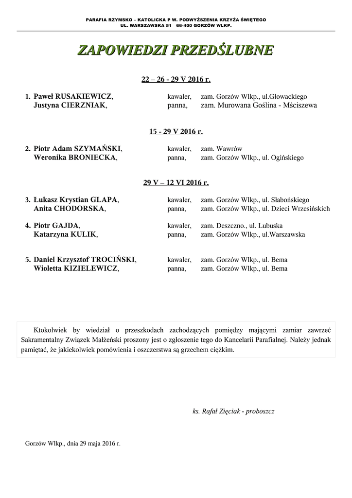 PARAFIA RZYMSKO – KATOLICKA P W. PODWYŻSZENIA KRZYŻA ŚWIĘTEGO UL. WARSZAWSKA 51 66-400 GORZÓW WLKP. ZAPOWIEDZI PRZEDŚLUBNE 22 – 26 - 29 V 2016 r. 1. Paweł RUSAKIEWICZ, kawaler, zam. Gorzów Wlkp., ul.Głowackiego Justyna CIERZNIAK, panna, zam. Murowana Goślina - Mściszewa 15 - 29 V 2016 r. 2. Piotr Adam SZYMAŃSKI, Weronika BRONIECKA, kawaler, panna, zam. Wawrów zam. Gorzów Wlkp., ul. Ogińskiego 29 V – 12 VI 2016 r. 3. Łukasz Krystian GLAPA, kawaler, panna, zam. Gorzów Wlkp., ul. Słabońskiego zam. Gorzów Wlkp., ul. Dzieci Wrzesińskich 4. Piotr GAJDA, Katarzyna KULIK, kawaler, panna, zam. Deszczno., ul. Lubuska zam. Gorzów Wlkp., ul.Warszawska 5. Daniel Krzysztof TROCIŃSKI, Wioletta KIZIELEWICZ, kawaler, panna, zam. Gorzów Wlkp., ul. Bema zam. Gorzów Wlkp., ul. Bema Anita CHODORSKA, Ktokolwiek by wiedział o przeszkodach zachodzących pomiędzy mającymi zamiar zawrzeć Sakramentalny Związek Małżeński proszony jest o zgłoszenie tego do Kancelarii Parafialnej. Należy jednak pamiętać, że jakiekolwiek pomówienia i oszczerstwa są grzechem ciężkim. ks. Rafał Zięciak - proboszcz Gorzów Wlkp., dnia 29 maja 2016 r.