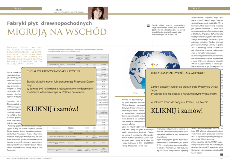 TRENDY TRENDY TEKST: dr MAŁGORZATA WNOROWSKA zakład w Polsce - Sklejka Pisz Paged - produkuje rocznie 60 000 m3 sklejek. Takiej też Fabryki płyt drewnopochodnych Tomsk, dzięki nowym inwestycjom, staje się światową stolicą płyt drewnopochodnych. Zlokalizowano tu nowe fabryki forniru, płyt wiórowych, płyt laminowanych, MDF oraz OSB. migrują na wschód wielkości fabrykę sklejki buduje ZSA AFK w Kemerowie, której prezesem rady nadzorczej jest Zygmunt Kwiatkowski, a środki na finansowanie projektu w Rosji spółka uzyskała z BRE Banku. W projekcie ZSA AFK sklejka będzie produkowana wyłącznie z drewna brzozowego pozyskiwanego na terenach Syberii południowo-zachodniej. Według informacji jakie uzyskał „Przemysł Drzewny w grudniu Pogranicze Europy i Azji staje się potęgą w produkcji płyt drewnopochodnych. W ostatnim czasie otwarto nowe inwestycje w Rosji i na Ukrainie. Już wkrótce uruchomione zostaną kolejne ciągi produkcyjne. Co przyciąga inwestorów? Jeszcze dekadę temu to Zakład/firma Wydajność Wzrost wyjściowa produkcji [w tys. m³/ [w tys. rok] m³/rok.] Region rok 350 2011 sklejka Seletsky DOK Briańsk 11.2 40 2011 sklejka dukująca obecnie 24 tys. m3 sklejki w 2015 Angers Zakłady Sklejek Kemerowo - 60 2013 sklejka r. ma zwiększyć swoje moce produkcyjne aż 40 2012 sklejka 96 2015 sklejka Fabryka Sklejek Tyumen Tiumeń 24 Omsk 3.3 7.0 2011 sklejka, fornir w fabrykę fornirów realizowanej w Tomsku AVIC Forestry Tomsk 110 250 2012 fornir przez chińską spółkę AVIC Forestry. Obecnie Tomsk - 250-300 2015 MDF MDF MDF 2011 płyty wiórowe Elektrogorskmebel Moskwa 250 250 2012 Płyty wiórowe Altayles (Rubtsovskiy LDK) Altai - 250 2014 płyty wiórowe Rosplit Niżny Nowgorod 24 86 2012 płyty wiórowe Altai na wschód na teren Białorusi. Nowa inwestycja - 200-250 2012-13 płyty pilśniowe metoda mokra o wartości przekraczającej 150 mln dolarów ma Inter-drev Twer brak danych 9.6 2011 Płyty meblowe zostać zrealizowana do 2016 roku. Produkowane Novowyatsk ski-complex Kirow - 130 2012 OSB LPK „Partner-Tomsk” Tomsk - na 2014 OSB - Należy się spodziewać kolejnych decyzji inwesty- DOK „Kalevala” Karelia - 300 2012 OSB cyjnych w Rosji, na Ukrainie i Białorusi – uważa Kronospan okolice Moskwy - 250-300 2012 OSB Tomasz Jańczak, dyrektor zarządzający przedsię- Oris Perm - 500 2013 OSB 350 brak danych biorstw Grupy Kronospan w Polsce. - Duży wpływ Kazachstan Zakład płyt wiórowych N. Kazachstan tempo rozwoju tych rynków, ale także niekorzystne zjawiska w przemyśle drzewnym, spowodowane przez wykorzystywanie w coraz większym stopniu drewna do produkcji tzw. zielonej energii w Unii Europejskiej. - płyty wiórowe Ukraina Korosten MDF manufacture Korosten - 46 | PRZEMYSŁ DRZEWNY. RESEARCH & DEVELOPMENT Smarhoń brak danych MDF płyt drewnopochodnych. W 2011 r. LPK Krokiem w zapowiedzianym przed kilku 900 2011 MDF 2014-2016 Płyty wiórowe, MDF, OSB Tomlesdrev zwiększyło do 250 tys. m3 wy- KLIKNIJ i zamów! dukcyjnych branży w kierunku wschodnim była inwestycja w Rosji. Twierdził on wówczas, że wprowadzenie internetowych aukcji na drewno, brak wieloletnich umów oraz ceny surowca zbliżone do cen zachodnioeuropejskich będą zniechęcać inwestorów do lokalizowania produkcji w Polsce. Gdyby nie kłopoty spółki matki, Pfleiderer MDF OOO byłaby dziś jedną z kluczowych spółek produkcyjnych korporacji. Fabryka płyt wiórowych wybudowana w Nowgorodzie Wielkim została w październiku 2012 r. przeHolding Subholding I B.V. i SWEDSPAN Holding B.V) za około 142 mln euro. brak danych 25 inwestycji dajność fabryce płyt wiórowych w W latach 2011-2015 tylko na tereniewRosji w sektorze leśno-drzewnym Polsce i naw swojej świecie. laty przez Wojciecha Gątkiewicza, prezesa Tomsku i jednocześnie rozpoczęło budowę powstało, powstanie lub zwiększy swoje Pfleiderer Grajewo - przesuwaniu mocy pro- jęta przez spółki z grupy IKEA (Ingka Pro Białoruś Kronospan Holdings East Ltd sklejki płyty laminowane 10.4 Altayles Zamów aktualny numer lub prenumeratę Przemysłu Drzewmoce wzrosną aż o 200% do 360 000 m nego, na rok. płyty pilśniowe płyty wiórowe OSB Tomsk staje wydarzeniami się powoli światową stolicą (metodana mokra)bieżąco z najważniejszymi by zawsze być 3 MDF 249.6 Lokalizację zakładu przeniósł kilkaset kilometrów nych rocznie, natomiast dzięki modernizacji jej MDF Tomsk KLIKNIJ i zamów! fabryka produkuje 110 tys. m3 oklein natural- MDF LPK „Tomlesdrev” w planach miał inwestycję w Strzelcach Opolskich. o 300%. Chciałbyś przeczytać cały artykuł? Warto także wspomnieć o ogromnej inwestycji Siberian forest LPK „Tomlesdrev” w Polsce zrezygnował Kronospan Szczecinek, który na decyzje inwestycyjne Kronospan mają nie tylko 300 km na wschód fabryka w Tumenie pro- - ubiegłym roku, będzie prawdopodobnie ostatnią będą tam płyty wiórowe i laminowane oraz MDF. koło Jekaterynburga powstaje fabryka sklejek o mocy 40 tys. m3, natomiast w odległości Rimbunan Chabarowsk 150-200 Zamów aktualny numer lub Hijau prenumeratę Przemysłu Drzew-2011 i w końcu niewielka przygraniczna Orla uruchomiły Igorevskiy DOK Smoleńsk 400 2013 nego, ciągi produkcyjne z najnowocześniejszymi techApsheronsk Krasnodar 300 2012 nologiami na skalę światową. fabryka Pfleiderer Nowgorod 500 na by Niestety zawsze być na bieżąco z najważniejszymi wydarzeniami Kraslesinvest Krasnojarsk 250 2015 cienkich płyt HDF Swedspanu, uruchomiona w w sektorze leśno-drzewnym w Polsce i na świecie. Dallesprom Chabarowsk 300 2015 Z budowy zakładu płyt drewnopochodnych Na terenach Syberii zachodniej w Sverdlowsku produkty Krasnojarsk na wschód: Żary, Szczecinek, Karlino, Grajewo, Do Rosji i na Białoruś miast na montaż linii produkcyjnych. Eniseiska Faryka Sklejek cje w branży płyt drewnopochodnych. Od zachodu tego typu inwestycją w Polsce. cała infrastruktura techniczna, czekano nato- Rosja cały art