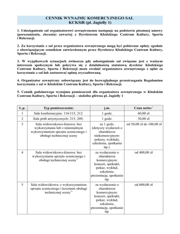 CENNIK WYNAJMU KOMERCYJNEGO SAL KCKSiR (pl. Jagiełły 1)