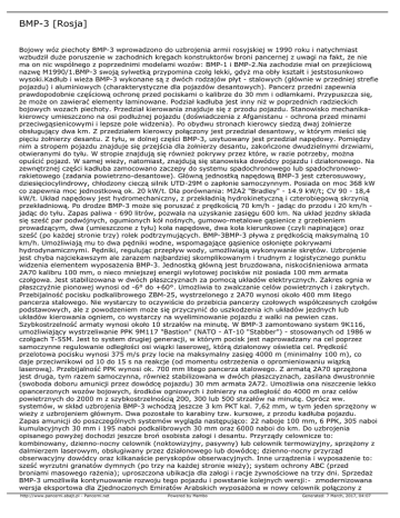BMP-3 [Rosja] Bojowy wóz piechoty BMP-3 wprowadzono do uzbrojenia armii rosyjskiej w 1990 roku i natychmiast wzbudził duże poruszenie w zachodnich kręgach konstruktorów broni pancernej z uwagi na fakt, że nie ma on nic wspólnego z poprzednimi modelami wozów: BMP-1 i BMP-2.Na zachodzie miał on przejściową nazwę M1990/1.BMP-3 swoją sylwetką przypomina czołg lekki, gdyż ma obły kształt i jeststosunkowo wysoki.Kadłub i wieża BMP-3 wykonane są z dwóch rodzajów płyt - stalowych (głównie w przedniej strefie pojazdu) i aluminiowych (charakterystyczne dla pojazdów desantowych). Pancerz przedni zapewnia prawdopodobnie częściową ochronę przed pociskami o kalibrze do 30 mm i odłamkami. Przypuszcza się, że może on zawierać elementy laminowane. Podział kadłuba jest inny niż w poprzednich radzieckich bojowych wozach piechoty. Przedział kierowania znajduje się z przodu pojazdu. Stanowisko mechanikakierowcy umieszczono na osi podłużnej pojazdu (doświadczenia z Afganistanu - ochrona przed minami przeciwgąsienicowymi i lepsze pole widzenia). Po obydwu stronach kierowcy siedzą dwaj żołnierze obsługujący dwa km. Z przedziałem kierowcy połączony jest przedział desantowy, w którym mieści się pięciu żołnierzy desantu. Z tyłu, w dolnej części BMP-3, usytuowany jest przedział napędowy. Pomiędzy nim a stropem pojazdu znajduje się przejścia dla żołnierzy desantu, zakończone dwudzielnymi drzwiami, otwieranymi do tyłu. W stropie znajdują się również pokrywy przez które, w razie potrzeby, można opuścić pojazd. W samej wieży, natomiast, znajdują się stanowiska dowódcy pojazdu i działonowego. Na zewnętrznej części kadłuba zamocowano zaczepy do systemu spadochronowego lub spadochronoworakietowego (zadania powietrzno-desantowe). Główną jednostką napędową BMP-3 jest czterosuwowy, dziesięciocylindrowy, chłodzony cieczą silnik UTD-29M o zapłonie samoczynnym. Posiada on moc 368 kW co zapewnia moc jednostkową ok. 20 kW/t. Dla porównania: M2A2 "Bradley" - 14.9 kW/t; CV 90 - 18,4 kW/t. Układ napędowy jest hydromechaniczny, z przekładnią hydrokinetyczną i czterobiegową skrzynią przekładniową. Po drodze BMP-3 może się poruszać z prędkością 70 km/h - jadąc do przodu i 20 km/h jadąc do tyłu. Zapas paliwa - 690 litrów, pozwala na uzyskanie zasięgu 600 km. Na układ jezdny składa się sześć par podwójnych, ogumionych kół nośnych, gumowo-metalowe gąsienice z grzebieniem prowadzącym, dwa (umieszczone z tyłu) koła napędowe, dwa koła kierunkowe (czyli napinające) oraz sześć (po każdej stronie trzy) rolek podtrzymujących. BMP-3BMP-3 pływa z prędkością maksymalną 10 km/h. Umożliwiają mu to dwa pędniki wodne, wspomagające gąsienice osłonięte pokrywami hydrodynamicznymi. Pędniki, regulując przepływ wody, umożliwiają wykonywanie skrętów. Uzbrojenie jest chyba najciekawszym ale zarazem najbardziej skomplikowanym i trudnym z logistycznego punktu widzenia elementem wyposażenia BMP-3. Jednostką główną jest bruzdowana, niskociśnieniowa armata 2A70 kalibru 100 mm, o nieco mniejszej energii wylotowej pocisków niż posiada 100 mm armata czołgowa. Jest stabilizowana w dwóch płaszczyznach za pomocą układów elektrycznych. Zakres ognia w płaszczyźnie pionowej wynosi od -6° do +60°. Umożliwia to zwalczanie celów powietrznych i zakrytych. Przebijalność pocisku podkalibrowego ZBM-25, wystrzelonego z 2A70 wynosi około 400 mm litego pancerza stalowego. Nie wystarczy to oczywiście do przebicia pancerzy czołowych współczesnych czołgów podstawowych, ale z powodzeniem może się przyczynić do uszkodzenia ich układów jezdnych lub układów kierowania ogniem, co wystarczy na wyeliminowanie pojazdu z walki na pewien czas. Szybkostrzelność armaty wynosi około 10 strzałów na minutę. W BMP-3 zamontowano system 9K116, umożliwiający wystrzeliwanie PPK 9M117 "Bastion" (NATO - AT-10 "Stabber") - stosowanych od 1986 w czołgach T-55M. Jest to system drugiej generacji, w którym pocisk jest naprowadzany na cel poprzez samoczynne regulowanie odległości osi wiązki laserowej, którą działonowy oświetla cel. Prędkość przelotowa pocisku wynosi 375 m/s przy locie na maksymalny zasięg 4000 m (minimalny 100 m), co daje przeciwnikowi od 10 do 15 s na reakcje (od momentu ostrzeżenia o opromieniowaniu wiązką laserową). Przebijalność PPK wynosi ok. 700 mm litego pancerza stalowego. Z armatą 2A70 sprzężona jest druga, tym razem samoczynna, również stabilizowana w dwóch płaszczyznach, zasilana dwustronnie (swoboda doboru amunicji przez dowódcę pojazdu) 30 mm armata 2A72. Umożliwia ona niszczenie lekko opancerzonych wozów bojowych, środków ogniowych i żołnierzy na odległość do 4000 m oraz celów powietrznych do 2000 m z szybkostrzelnością 200, 300 lub 500 strzałów na minutę. Oprócz ww. systemów, w skład uzbrojenia BMP-3 wchodzą jeszcze 3 km PKT kal. 7,62 mm, w tym jeden sprzężony w wieży z uzbrojeniem głównym. Dwa pozostałe to karabiny tzw. kursowe, z przodu kadłuba pojazdu. Zapas amunicji do poszczególnych systemów wygląda następująco: 22 naboje 100 mm, 6 PPK, 305 naboi kumulacyjnych 30 mm i 195 naboi podkalibrowych 30 mm oraz 6000 naboi do km. Do uzbrojenia opisanego powyżej dochodzi jeszcze broń osobista załogi i desantu. Przyrządy celownicze to: kombinowany, dzienno-nocny celownik (noktowizyjny, pasywny) lub celownik termowizyjny, sprzężony z dalmierzem laserowym, obsługiwany przez działonowego lub dowódcę; dzienno-nocny przyrząd obserwacyjny dowódcy oraz kilkanaście peryskopów obserwacyjnych. Inne urządzenia i wyposażenie to: sześć wyrzutni granatów dymnych (po trzy na każdej stronie wieży); system ochrony ABC (przed broniami masowego rażenia); uproszczona ubikacja dla załogi i racje żywnościowe na trzy dni. Sprzedaż BMP-3 umożliwiła kontynuowanie rozwoju tego pojazdu i powstanie kolejnych wersji:- zmodernizowa