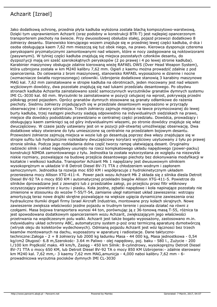 Achzarit [Izrael] Jako dodatkową ochronę, przednia płyta kadłuba wyłożona została blachą kompozytowo-warstwową. Dzięki tym usprawnieniom Achzarit (oraz podobny w konstrukcji BTR-T) jest najlepiej opancerzonym transporterem piechoty na świecie. Przy dwuosobowej obsłudze stałej, pojazd przewozi dodatkowo 8 żołnierzy desantu. Stanowisko kierującego wozem znajduje się w przedniej lewej części kadłuba, d-dca i osoba obsługująca kaem 7,62 mm mieszczą się tuż obok niego, na prawo. Kierowca dysponuje czterema peryskopami pryzmatycznymi zamontowanymi nad włazem, które w nocy zastępowane są noktowizorami (pasywnymi). W tylniej części kadłuba znajdują się miejsca pozostałych członków desantu, do dyzpozi\ycji mają oni sześć szerokokątnych peryskopów (2 po prawej i 4 po lewej stronie kadłuba). Karabinier maszynowy obsługuje zdalnie kierowaną wieżę RAFAEL OWS (Over Head Weapon System), która uzbrojona została w km M240 kalibru 7,62 mm. Ogień z kaemu można prowadzić zdalnie z pod opancerzenia. Do celowania z broni maszynowej, stanowisko RAFAEL wyposażono w dzienne i nocne (wzmacniacze światła rozproszonego) celowniki. Uzbrojenie dodatkowe stanowią 3 karabiny maszynowe MAG kal. 7,62 mm zainstalowane w stropie kadłuba na obrotnicach, jeden mocowany jest nad włazem wyjściowym dowódcy, dwa pozostałe znajdują się nad lukami przedziału desantowego. Po obydwu stronach kadłuba Achzarita zainstalowano sześć samoczynnych wyrzutników granatów dymnych systemu IMI CL-3030 kal. 60 mm. Wyrzutniki te zainstalowane w pozycji celujacej na wprost, pokrywają przedni półokrąg przed pojazdem. Oprócz granatów dymnych stosowane są granaty odłamkowe do rażenia piechoty. Siedmiu żołnierzy znjadujących się w przedziale desantowym wyposażono w przyrządy obserwacyjne i otwory sztrelnicze. Trzech żołnierzy zajmuje miejsce na ławce przymocowanej do lewej burty kadłuba, trzej następni piechurzy siadają odpowiednio na indywidualnych siedziskach na prawo, miejsce dla dowódcy pododdziału przewidziano w centralnej części przedziału. Dowódca, prowadzący i obsługujący kaem zamknięci są od góry indywidualnymi włazami, po stronie dowódcy znajduje się właz dwuczęściowy. W czasie jazdy ustawiany jest on w pozycji pół-otwartej umożliwiając obserwację. Dwa dodatkowe włazy otwierane do tyłu umieszczone są centralnie na przedziałem bojowym desantu. Przewożeni żołnierze zajmują miejsca w wozie lub go desantują poprzez dwa włazy znajdujące się w stropie sufitu lub hydraulicznie rozkładany dwuczęściowy korytarz wyjściowy usytuowany z tyłu po prawej stronie silnika. Podcza jego rozkładania dolna część tworzy rampę ułatwiającą desant. Oryginalny radziecki silnik i układ napędowy usunięto na rzecz kompkatowego układu napędowego (power-packu) konstrukcji NIMDA zamontowanego z tyłu. Jednostka ta została wykorzystana ze względu na niezwykle niskie rozmiary, pozwalające na budowę przejścia desantowego piechoty bez dokonywania modyfikacji w kształcie i wielkosci kadłuba. Transporter Achzarit Mk 1 napędzany jest dwusuwowym silnikiem wysokoprężnym w układzie V-8 Detroit Diesel 8V-71 TTA z chłodzeniem wodnym i zapłonem samoczynnym. Jednostka ta rozwija moc 650 KM i współpracuje z hydrokinetycznym układem przeniesiena mocy Allison XTG-411-4. Power pack wozu Achzarit Mk 2 składa się z silnika diesla Detroit Diesel 8V-92 TA o mocy 850 KM i automatycznej przekładni biegów Allison XTG-411-5. Powietrze do silników dprowadzane jest z zewnątrz lub z przedziałów załogi, po przejściu przez filtr włóknowy oczyszczający powietrze z kurzu i piasku. Koła jezdne, zębatki napędowe i koła napinające pozostały nie zmienione w stosounku do wozów T-55/T-54, zamianie uległ natomiast układ zawieszenia: wstrząsy amortyzują teraz nowe drążki skrętne pozwalające na większe ugięcia dynamiczne zawieszenia oraz hydrauliczne tłumiki drgań firmy Israel Aircraft Industries, montowane przy kołach skrajnych. Nowe zawieszenie zwiększa właściwości jezdne pojazdu w trudnym terenie i pozwala działać na równi z czołgami. Masa bojowa transportera wynosi 44 ton, porównując ją z 36-tonową masą T-55, różnica ta jest spowodowana dodatkowym opancerzeniem wozu Achzarit, zwiększającym jego właściwości przetrwania na współczesnym polu walki. Achzarit jest także bogato wyposażony, zastosowano m.in. indywidualny układ ochronny ABC, automatyczny system p-poż oraz termiczną aparaturę dymotwórczą (wtrysk oleju do kolektorów wydechowych). Odmianą pojazdu Achzarit jest wóz łącznosci bez trzech keamów montowanych na dachu, wyposażony w aparaturę i radiostacje. Dane taktycznotechniczne:Załoga - 2 + 8 żołnierzy lub 2000 kg ładunku Masa - 44 000 kg, Masa jednostkowa - 0,54 kg/cm2 Długosć- 6.8 m,Szerokośc- 3.64 m Paliwo - olej napędowy, poj. baku - 580 l., Zużycie - 200 l./100 km Prędkość maks. 49 km/h, Zasięg - 450 km Silnik: 8-cylindrowy, wysokoprężny Detroit Diesel 8V-71 TTA o mocy 650 KM, lub Detroit Diesel 8V-92 TA o mocy 850 KM Uzbrojenie:- zdalnie sterowany km M240 kal. 7,62 mm,- 3 kaemy 7,62 mm MAG,amunicja - 4,000 naboi kalibru 7,62 mm - 6prowadnicowa wyrzutnia pocisków dymnych IMI CL-3030 http://www.pancerni.abajt.pl - Pancerni.net Powered by Mambo Generated: 7 March, 2017, 04:07