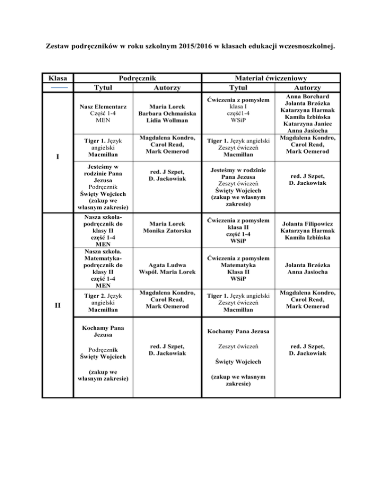Zestaw podręczników w roku szkolnym 2015/2016 w klasach edukacji wczesnoszkolnej. Klasa Podręcznik Tytuł Autorzy Nasz Elementarz Część 1-4 MEN I Tiger 1. Język angielski Macmillan Jesteśmy w rodzinie Pana Jezusa Podręcznik Święty Wojciech (zakup we własnym zakresie) Nasza szkołapodręcznik do klasy II część 1-4 MEN Nasza szkoła. Matematykapodręcznik do klasy II część 1-4 MEN II Tiger 2. Język angielski Macmillan Maria Lorek Barbara Ochmańska Lidia Wollman Magdalena Kondro, Carol Read, Mark Oemerod red. J Szpet, D. Jackowiak Maria Lorek Monika Zatorska Agata Ludwa Współ. Maria Lorek Magdalena Kondro, Carol Read, Mark Oemerod Kochamy Pana Jezusa Podręcznik Święty Wojciech (zakup we własnym zakresie) Materiał ćwiczeniowy Tytuł Autorzy Ćwiczenia z pomysłem klasa I część1-4 WSiP Tiger 1. Język angielski Zeszyt ćwiczeń Macmillan Jesteśmy w rodzinie Pana Jezusa Zeszyt ćwiczeń Święty Wojciech (zakup we własnym zakresie) Anna Borchard Jolanta Brzózka Katarzyna Harmak Kamila Izbińska Katarzyna Janiec Anna Jasiocha Magdalena Kondro, Carol Read, Mark Oemerod red. J Szpet, D. Jackowiak Ćwiczenia z pomysłem klasa II część 1-4 WSiP Jolanta Filipowicz Katarzyna Harmak Kamila Izbińska Ćwiczenia z pomysłem Matematyka Klasa II WSiP Jolanta Brzózka Anna Jasiocha Tiger 1. Język angielski Zeszyt ćwiczeń Macmillan Magdalena Kondro, Carol Read, Mark Oemerod Kochamy Pana Jezusa red. J Szpet, D. Jackowiak Zeszyt ćwiczeń Święty Wojciech (zakup we własnym zakresie) red. J Szpet, D. Jackowiak Cykl „Tropiciele” Podręczniki kl. 3 (części 1-5) Matematyka kl.3 (części 1-5) Zajęcia komputerowe kl.3 - podręcznik z ćwiczeniami i CDROM-em III Hello 3 Podręcznik dla klasy III Przyjmujemy Pana Jezusa Podręcznik Święty Wojciech Praca zbiorowa Elzbieta Burakowska, Agnieszka Burdzińska, Aldona DanielewiczMalinowska, Jolanta Dymarska, Agnieszka Kamińska, Rafał Kamiński, Marzena Kołaczyńska, Beata Nadarzyńska M. Appel, J, Zarańska red. J Szpet, D. Jackowiak Karty ćwiczeń kl.3 (części 1-5) Przyroda kl.3. Karty ćwiczeń (cz. 1 i 2) Karty plastyczne kl.3 (cz. 1 i 2) Wyprawka kl.3 (części 1 i 2) Ćwiczenia dodatkowe ROZWIĄZUJĘ ZADANIA klasa 3 Ćwiczenia dodatkowe LICZĘ klasa 3 Ćwiczenia dodatkowe PISZĘ klasa 3 CZYTAM ZE ZROZUMIENIEM klasa 3 Hello 3 zeszyt ćwiczeń dla klasy III ______________ Praca zbiorowa Elzbieta Burakowska, Agnieszka Burdzińska, Aldona DanielewiczMalinowska, Jolanta Dymarska, Agnieszka Kamińska, Rafał Kamiński, Marzena Kołaczyńska, Beata Nadarzyńska M. Appel, J, Zarańska ____________