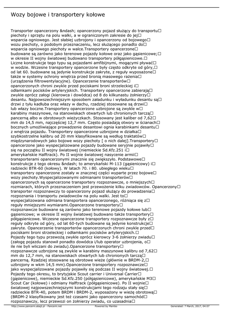 Wozy bojowe i transportery kołowe Transporter opancerzony – opancerzony pojazd służący do transportu piechoty i sprzętu na polu walki, a w ograniczonym zakresie do jej wsparcia ogniowego. Jest słabiej uzbrojony i opancerzony od bojowego wozu piechoty, o podobym przeznaczeniu, lecz służącego ponadto do wsparcia ogniowego piechoty w walce.Transportery opancerzone budowane są zarówno jako terenowe pojazdy kołowe oraz jako gąsienicowe; w okresie II wojny światowej budowano transportery półgąsienicowe. Liczne konstrukcje tego typu są pojazdami amfibijnymi, mogącymi pływać w wodzie. Wczesne transportery opancerzone były często odkryte od góry, od lat 60. budowane są jedynie konstrukcje zakryte, z reguły wyposażone także w systemy ochrony wnętrza przed bronią masowego rażenia (urządzenia filtrowentylacyjne). Opancerzenie transporterów opancerzonych chroni zwykle przed pociskami broni strzeleckiej i odłamkami pocisków artyleryjskich. Transportery opancerzone zabierają zwykle oprócz załogi (kierowca i dowódca) od 8 do kilkunastu żołnierzy desantu. Najpowszechniejszym sposobem załadunku i wyładunku desantu są drzwi z tyłu kadłuba oraz włazy w dachu, rzadziej stosowane są drzwi lub włazy boczne.Transportery opancerzone uzbrojone są zwykle w karabiny maszynowe, na stanowiskach otwartych lub chronionych tarczą pancerną albo w obrotowych wieżyczkach. Stosowany jest kaliber od 7,62 mm do 14,5 mm, najczęściej 12,7 mm. Często posiadają otwory w ścianach bocznych umożliwiające prowadzenie desantowi ognia karabinkami desantu z wnętrza pojazdu. Transportery opancerzone uzbrojone w działka szybkostrzelne kalibru od 20 mm klasyfikowane są według traktatów międzynarodowych jako bojowe wozy piechoty [ o nich dalej].Transportery opancerzone jako wyspecjalizowane pojazdy budowane seryjnie pojawiły się na początku II wojny światowej (niemieckie Sd.Kfz.251 i amerykańskie Halftrack). Po II wojnie światowej nasycenie armii transporterami opancerzonymi znacznie się zwiększyło. Podstawowe konstrukcje z tego okresu – to amerykański M-113 (gąsienicowy) i radziecki BTR-60 (kołowy). W latach 70. i 80. ubiegłego wieku transportery opancerzone zostały w znacznej części wyparte przez bojowe wozy piechoty.Wyspecjalizowanymi odmianami transporterów opancerzonych są opancerzone transportery rozpoznawcze, o mniejszych rozmiarach, których przeznaczeniem jest przewożenie kilku zwiadowców. Opancerzony transporter rozpoznawczy to opancerzony pojazd służący do prowadzenia rozpoznania i transportu zwiadowców na polu walki. Jest to wyspecjalizowana odmiana transportera opancerzonego, różniąca się z reguły mniejszymi wymiarami.Opancerzone transportery rozpoznawcze budowane są zarówno jako terenowe pojazdy kołowe lub gąsienicowe; w okresie II wojny światowej budowano także transportery półgąsienicowe. Wczesne opancerzone transportery rozpoznawcze były z reguły odkryte od góry, od lat 60-tych budowane są jedynie konstrukcje zakryte. Opancerzenie transporterów opancerzonych chroni zwykle przed pociskami broni strzeleckiej i odłamkami pocisków artyleryjskich. Pojazdy tego typu przewożą zwykle oprócz kierowcy 3-6 żołnierzy zwiadu (załogę pojazdu stanowił ponadto dowódca i/lub operator uzbrojenia, o ile nie byli wliczani do zwiadu).Opancerzone transportery rozpoznawcze uzbrojone są zwykle w karabiny maszynowe kalibru od 7,62 mm do 12,7 mm, na stanowiskach otwartych lub chronionych tarczą pancerną. Rzadziej stosowane są obrotowe wieże (głównie w BRDM-2, uzbrojony w wkm 14,5 mm).Opancerzone transportery rozpoznawcze jako wyspecjalizowane pojazdy pojawiły się podczas II wojny światowej. Pojazdy tego okresu, to brytyjskie Scout carrier i Universal Carrier (gąsienicowe), niemieckie Sd.Kfz.250 (półgąsienicowe), amerykańskie M3 Scout Car (kołowe) i odmiany Halftrack (półgąsienicowe). Po II wojnie światowej najpowszechniejszymi konstrukcjami tego rodzaju stały się radzieckie BTR-40, potem BRDM i BRDM-2, wyposażony w wieżę obrotową (BRDM-2 klasyfikowany jest też czasami jako opancerzony samochód rozpoznawczy, lecz przewozi on żołnierzy zwiadu, co uzasadnia http://www.pancerni.abajt.pl - Pancerni.net Powered by Mambo Generated: 7 March, 2017, 04:07 klasyfikowanie go jako transportera). Mniej rozpowszechnione konstrukcje zachodnie to gąsienicowe: brytyjski Spartan i amerykański M-114. Należy zauważyć, że w konfliktach zbrojnych w praktyce opancerzone transportery rozpoznawcze stosowane były także w roli zwykłych transporterów piechoty, pomimo ich mniejszych możliwości przewozu.Innymi rodzajami opancerzonych pojazdów rozpoznawczych są kołowe opancerzone samochody rozpoznawcze, nie przewożące co do zasady zwiadowców i czasami posiadające cięższe uzbrojenie, oraz gąsienicowe bojowe wozy rozpoznawcze, powstałe na bazie bojowych wozów piechoty, posiadające silniejsze uzbrojenie i opancerzenie.Od końca lat 90. powstają konstrukcje lekkich uniwersalnych samochodów opancerzonych, opartych na samochodach terenowych, przewożących kilku żołnierzy, zbliżonych koncepcją do wczesnych opancerzonych transporterów rozpoznawczych typu M3 Scout Car.Bojowy wóz piechoty (BWP) to uzbrojony i opancerzony pojazd bojowy, zwykle gąsienicowy, przeznaczony do przewożenia żołnierzy piechoty zmechanizowanej na polu walki i jej wsparcia ogniowego.Bojowe wozy piechoty wykształciły się w połowie lat sześćdziesiątych w drodze rozwoju gąsienicowych transporterów opancerzonych. Od transportera opancerzonego, bojowy wóz piechoty różni się przede wszystkim silniejszym uzbrojeniem, umożliwiającym prowadzenie walki ogniowej, oraz zazwyczaj także lepszym opancerzeniem. Bojowe wozy piechoty buduje się przede wszystkim jako pojazdy gąsienicowe, dzięki czemu mają podobną ruchliwość, jak czołgi, którym mogą towarzyszyć w ataku. Dzięki zdolnościom do poruszania się w trudnym ter