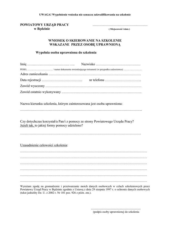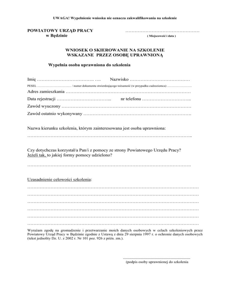 UWAGA! Wypełnienie wniosku nie oznacza zakwalifikowania na szkolenie POWIATOWY URZĄD PRACY w Będzinie ………………………………………… ( Miejscowość i data ) WNIOSEK O SKIEROWANIE NA SZKOLENIE WSKAZANE PRZEZ OSOBĘ UPRAWNIONĄ Wypełnia osoba uprawniona do szkolenia Imię ………………………………. …. Nazwisko ………………………………… PESEL …………………………… / numer dokumentu stwierdzającego tożsamość (w przypadku cudzoziemca) …………………… Adres zamieszkania ……………………………………………………………………… Data rejestracji ……………………………... nr telefonu ………………………….. Zawód wyuczony ………………………………………………………………………… Zawód ostatnio wykonywany ……………………………………………………………. Nazwa kierunku szkolenia, którym zainteresowana jest osoba uprawniona: …………………………………………………………………………………………….. Czy dotychczas korzystał/a Pan/i z pomocy ze strony Powiatowego Urzędu Pracy? Jeżeli tak, to jakiej formy pomocy udzielono? ……………………………………………………………………………………………. Uzasadnienie celowości szkolenia: ………………………………………………………………………………………………… ………………………………………………………………………………………………… ………………………………………………………………………………………………… ………………………………………………………………………………………………… ………………………………………………………………………………………………… ………………………………………………………………………………………………… Wyrażam zgodę na gromadzenie i przetwarzanie moich danych osobowych w celach szkoleniowych przez Powiatowy Urząd Pracy w Będzinie zgodnie z Ustawą z dnia 29 sierpnia 1997 r. o ochronie danych osobowych (tekst jednolity Dz. U. z 2002 r. Nr 101 poz. 926 z późn. zm.). .......................................................... (podpis osoby uprawnionej do szkolenia Informacje dotyczące planowanej działalności gospodarczej: 1. Rodzaj działalności określony zgodnie z Polską Klasyfikacją Działalności (PKD): _______ ___________________________________________________________________________ 2. Czy wnioskodawca prowadził wcześniej działalność gospodarczą? Jeżeli TAK to proszę podać: w jakim okresie oraz przyczyny likwidacji _________________ ___________________________________________________________________________ ___________________________________________________________________________ ___________________________________________________________________________ 3. Miejsce prowadzenia planowanej działalności: ___________________________________ ___________________________________________________________________________ ___________________________________________________________________________ 4. Forma użytkowania lokalu (np.: umowa dzierżawy, najmu lokalu, akt własności): _______ ___________________________________________________________________________ ___________________________________________________________________________ 5. Obszar prowadzenia planowanej działalności (miasto, gmina, powiat, województwo, itd.): __________________________________________________________________________ 6. Planowany termin rozpoczęcia działalności: _____________________________________ Pozostałe dane: 1. Termin szkolenia oraz nazwę i adres instytucji szkoleniowej, która mogłaby przeprowadzić szkolenie: __________________________________________________________________ ___________________________________________________________________________ ___________________________________________________________________________ 2. Koszt szkolenia: ___________________________________________________________ 3. Inne informacje potrzebne do organizacji szkolenia: _______________________________ ___________________________________________________________________________ ___________________________________________________________________________ ___________________________________________________________________________ Opinia pośrednika pracy: ___________________________________________________________________________ ___________________________________________________________________________ ___________________________________________________________________________ ___________________________________________________________________________ ___________________________________________________________________________ ____________________________ /data i podpis/ Opinia doradcy zawodowego: ___________________________________________________________________________ ___________________________________________________________________________ ___________________________________________________________________________ ___________________________________________________________________________ ___________________________________________________________________________ _____________________________ /data i podpis/ Opinia specjalisty ds. rozwoju zawodowego: ___________________________________________________________________________ ___________________________________________________________________________ ___________________________________________________________________________ ___________________________________________________________________________ ___________________________________________________________________________ ________________________ /data i podpis/ Decyzja Dyrektora Powiatowego Urzędu Pracy lub osoby uprawnionej: kandydat zakwalifikowany */, kandydat nie zakwa