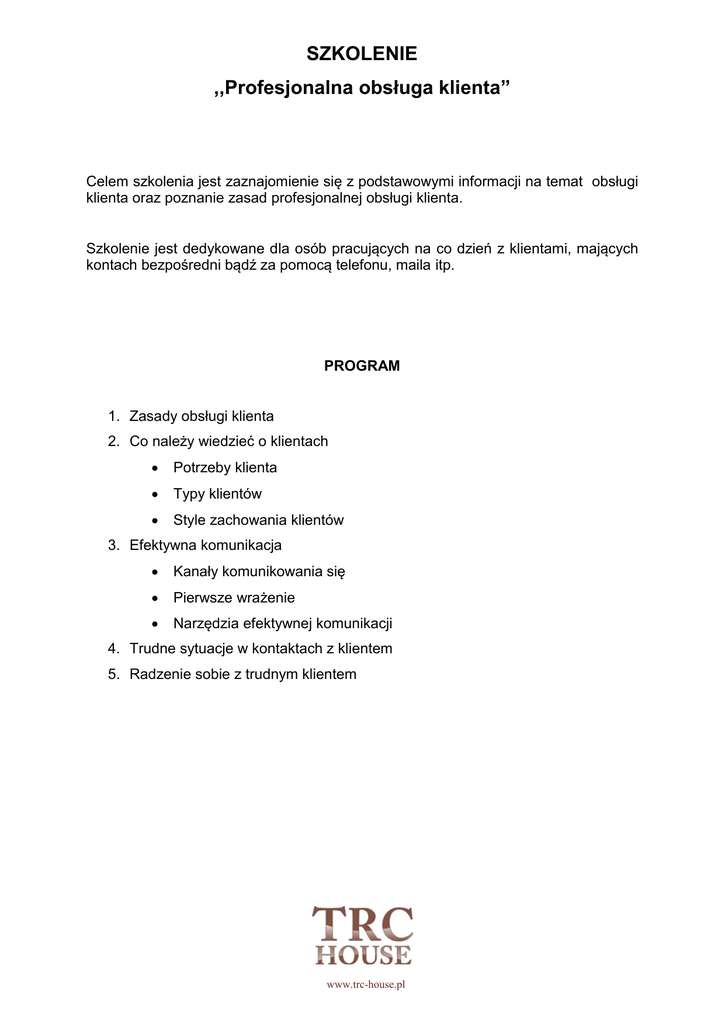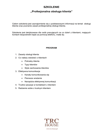 SZKOLENIE ,,Profesjonalna obsługa klienta” Celem szkolenia jest zaznajomienie się z podstawowymi informacji na temat obsługi klienta oraz poznanie zasad profesjonalnej obsługi klienta. Szkolenie jest dedykowane dla osób pracujących na co dzień z klientami, mających kontach bezpośredni bądź za pomocą telefonu, maila itp. PROGRAM 1. Zasady obsługi klienta 2. Co należy wiedzieć o klientach Potrzeby klienta Typy klientów Style zachowania klientów 3. Efektywna komunikacja Kanały komunikowania się Pierwsze wrażenie Narzędzia efektywnej komunikacji 4. Trudne sytuacje w kontaktach z klientem 5. Radzenie sobie z trudnym klientem www.trc-house.pl Formularz Zgłoszeniowy Zgłoszenie uczestnictwa w szkoleniu prosimy o przesłanie na adres [email protected] PROFESJONALNA OBSŁUGA KLIENTA Termin Miejsce Cena 01.03.2016 r. 9:00-14:00 Łuków, ul. Warszawska 24 100 zł brutto Imię i nazwisko Adres e-mail Telefon Stanowisko Instytucja Warunki uczestnictwa: 1. Organizatorem szkolenia jest TRC House z siedzibą w Łukowie. 2. Cena szkolenia obejmuje: udział w szkoleniu, materiały szkoleniowe, wydanie certyfikatu udziału w szkoleniu, serwis kawowy 3. Warunkiem udziału w szkoleniu jest otrzymanie przez TRC House. 4. Opłatę za szkolenie należy dokonać przelewem po otrzymaniu potwierdzenia od organizatora. W tytule przelewu należy wpisać nazwę szkolenia oraz nazwisko uczestnika TRC House Maria Michalczuk ul. Stodolna 20/45, 21-400 Łuków Bank BGŻ BNP Paribas S.A. 302030 0045 1110 0000 0237 4610 5. O przyjęciu na szkolenie decyduje kolejność zgłoszeń. 6. W przypadku odwołania szkolenia przez TRC House, wszelkie kwoty wpłacone tytułem udziału w szkoleniu zostaną zwrócone. 7. TRC House zastrzega sobie prawo do zmiany miejsca i terminu szkolenia po uprzednim poinformowaniu uczestnika. ………………….. Podpis www.trc-house.pl