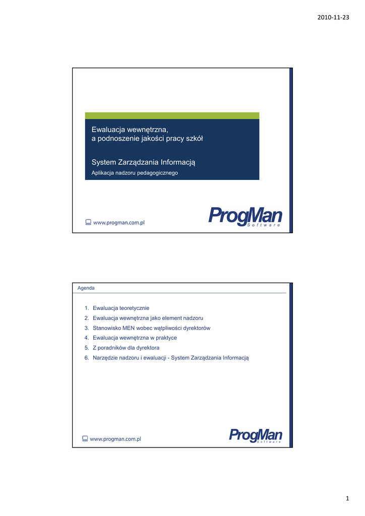 2010-11-23 Ewaluacja wewnętrzna, a podnoszenie jakości pracy szkół System Zarządzania Informacją Aplikacja nadzoru pedagogicznego Agenda 1. Ewaluacja teoretycznie 2. Ewaluacja wewnętrzna jako element nadzoru 3. Stanowisko MEN wobec wątpliwości dyrektorów 4. Ewaluacja wewnętrzna w praktyce 5. Z poradników dla dyrektora 6. Narzędzie nadzoru i ewaluacji - System Zarządzania Informacją 1 2010-11-23 Ewaluacja teoretycznie Ewaluacja ( z języka francuskiego ) - oszacowanie lub określenie wartości, ocena. Z historii: Pierwsze próby udokumentowanej oceny wyników nauczania - USA Joseph M. Rice (1857-1934) Pierwsze badania ewaluacyjne - USA lata 20-te; Teoria ewaluacji - 1949 rok, R. Tyler Z definicji: systematyczny proces obejmujący zbieranie informacji oraz zdawanie relacji (w postaci raportu) z tego, jak się rzeczy mają, z intencją dostarczenia danych ułatwiających podejmowanie decyzji; systematyczne zbieranie informacji z pewnego zakresu, którego celem jest dostarczenie przydatnej informacji zwrotnej; proces zbierania danych i ich interpretacja w celu podejmowania decyzji; systematyczne badanie wartości lub cech konkretnego programu, działania lub obiektu z punktu widzenia przyjętych w tym celu kryteriów w celu jego usprawnienia, rozwoju lub lepszego zrozumienia; Ewaluacja wewnętrzna jako element nadzoru Formy nadzoru pedagogicznego Ewaluacja Kontrola Wspomaganie § 20. 1. Zadania Dyrektora szkoły Przeprowadzanie jakości pracy ewaluacji wewnętrznej i wykorzystywanie jej wyników do doskonalenia Kontrolowanie przestrzegania przepisów prawa Wspomaganie nauczycieli w realizacji zadań § 20. 2. EWALUACJĘ WEWNĘTRZNĄ PRZEPROWADZA SIĘ W ODNIESIENIU DO WSZYSTKICH LUB WYBRANYCH WYMAGAŃ Ewaluacja praktyczne badanie oceniające przeprowadzane w szkole lub placówce, ... badanie wybranego fragmentu działalności szkoły (placówki), w wyniku którego pozyskuje ona informacje, analizuje je i na ich podstawie projektuje swoje dalsze działania 2 2010-11-23 Stanowisko MEN wobec wątpliwości dyrektorów Prowadzenie ewaluacji wewnętrznej – nowe zadanie w nadzorze ? rozporządzeniu Ministra Edukacji Narodowej i Sportu z dnia 23 kwietnia 2004 r. w sprawie nadzoru pedagogicznego - ewaluacja rozumiana jako ocena przydatności i skuteczności podejmowanych działań dydaktycznych, wychowawczych i opiekuńczych w odniesieniu do założonych celów, służąca doskonaleniu tych działań; rozporządzenie Ministra Edukacji Narodowej z dnia 15 grudnia 2006 r. – wprowadzenie konieczności prowadzenia działalności diagnostyczno-oceniającej, która obejmowała w szczególności diagnozowanie oraz ocenianie działalności dydaktycznej, wychowawczej i opiekuńczej szkół i placówek; Kto wybiera obszary będące przedmiotem ewaluacji wewnętrznej ? Ewaluacja wewnętrzna - działanie zespołowe; Wyboru dokonuje zespół, w wyniku Nowe zadanie dyrektora - zespoły nauczycielskie, liderzy; dyskusji , w oparciu o wnioski z nadzoru Stanowisko MEN wobec wątpliwości dyrektorów Czy ewaluacja wewnętrzna tylko wobec wymagań wskazanych w załączniku do rozporządzenia ? Zakres ewaluacji powinien wynikać z potrzeb szkoły; Istnieje możliwość prowadzenia ewaluacji wewnętrznej w zakresie wymagań opisanych w rozporządzeniu, ale też wobec innych zagadnień związanych z funkcjonowanie szkoły; Dlaczego określono tylko dwa poziomy spełniania wymagań wobec szkół ? Wymagania opisane są na dwóch poziomach - na poziomie B oraz na poziomie D. Poziom D - podstawowy - pozwala ustalić taki poziom spełniania wymagania, który musi być spełniony przez wszystkie szkoły lub placówki. Poziom B - wysoki - wskazuje szkole lub placówce pożądane kierunki jej rozwoju. Zarówno dobry jak i bardzo wysoki poziom spełniania wymagań zależy od potrzeb i możliwości szkoły lub placówki. Każda szkoła w sposób autonomiczny może ustalić charakterystykę poziomu C oraz A właściwą dla specyfiki szkoły oraz samodzielnie ustalić swój własny sposób dochodzenia do poziomu bardzo wysokiego. W każdej szkole i placówce poziom C oraz A może być różny. 3 2010-11-23 Ewaluacja wewnętrzna w praktyce Proces ewaluacji I. Przygotowanie Zaplanowanie działań Projekt ewaluacji (cele, sposoby zbierania informacji, terminy, grupy docelowe) II. Realizacja Ankieta Obserwacja Wywiad GROMADZENIE DANYCH Analiza dokumentów III. Podsumowanie Raport Warunki dobrej ewaluacji Systematyczne zbieranie danych - ulepszenie podejmowanych działań jeszcze w trakcie ich realizacji; Moralny obowiązek zachowania obiektywizmu i etycznego podejścia do procesu ewaluacji; Rzetelna ocena stopnia realizacji zamierzonych celów; Z poradników dla dyrektora Z internetowego poradnika dla dyrektora Dokumentowanie ewaluacji prowadzi się w celu wielokrotnego korzystania z uzyskanych materiałów, wniosków Skoncentrowanie działań na pozyskiwaniu informacji SKONCENTROWANIE DZIAŁAŃ NA ANALIZIE INFORMACJI System Zarządzania Informacją – APLIKACJA NADZORU PEDAGOGICZNEGO 4 2010-11-23 System Zarządzania Informacją – APLIKACJA NADZORU PEDAGOGICZNEGO GŁÓWNE FUNKCJE Systematyczne gromadzenie elektronicznych sprawozdań z działalności - źródło danych archiwalnych Źródło informacji do analizy jakości pracy – ewaluacja wewnętrzna Łatwy i szybki dostęp osób uprawnionych do zbioru potrzebnych informacji, raportów, statystyk i sprawozdań – Dostęp do raportów sprawozdawczych o zaprogramowanej strukturze – Dostęp do raportów przeglądowych tworzonych wg własnych kryteriów Monitoring przepływu informacji, audyt sprawozdawczości Zdalne wydawanie poleceń wykonania analizy, oceny, badania, przygotowania sprawozdania z realizacji zadań w określonych obszarach działalności Automatyczne powiadamianie o wywołaniach i sprawozdaniach oraz wiadomościach Komunikator informacji poufnych i publicznych System Zarządzania Informacją - komunikacja DYREKTOR PLACÓWKI LIDERZY ZESPOŁÓW SEKR