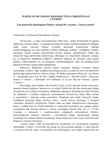 WSPÓLNE DUCHOWE DZIEDZICTWO CHRZEŚCIJAN I ŻYDÓW List pasterski Episkopatu Polski z okazji 50. rocznicy „Nostra aetate” Umiłowani w Chrystusie Panu Bracia i Siostry! 50 lat temu - w dniu 28 października 1965 roku - Sobór Watykański II ogłosił deklarację „Nostra aetate” o stosunku Kościoła do religii niechrześcijańskich. Badając znaki czasu, ojcowie Soboru wyraźnie dostrzegli konieczność dialogu międzyreligijnego na rzecz jedności rodzaju ludzkiego, pokoju i współpracy między narodami. Zanim zaczęto powszechnie używać pojęcia „globalizacja”, Sobór już ukazywał wagę pierwiastka duchowego, obecnego we wszystkich religiach, uznając go za konieczny fundament jedności wspólnoty ludzkiej na obszarze całej naszej planety. Opowiedzenie się za dialogiem międzyreligijnym stało się profetycznym głosem Kościoła u progu epoki globalizacji. Soborowa deklaracja pośród innych rodzajów dialogu wyróżnia dialog chrześcijan i Żydów. Jego wyjątkowość polega na tym, że rodzi się on ze świadomości duchowego pokrewieństwa obydwu religii. W duchu nauczania Soboru św. Jan Paweł II - nawiązując przy tym do słów Adama Mickiewicza - określał Żydów „starszymi braćmi w wierze”, a Benedykt XVI dodawał, że są oni dla nas również „ojcami w wierze”. Rozwijając myśl Soboru, Jan Paweł II uczył, że kto spotyka Jezusa Chrystusa, spotyka również judaizm. Sprawia to, że religia Żydów nie jest dla chrześcijan religią zewnętrzną, lecz religią wewnętrzną. Zgłębianie tajemnicy Kościoła prowadzi bowiem ku spotkaniu z Żydami będącymi uczestnikami Przymierza, które Bóg zawarł w przeszłości i któremu wielu potomków Abrahama jest nadal wiernych, będąc świadkami Jedynego Boga, Stwórcy nieba i ziemi, zawsze obecnego w dziejach człowieka. Duchowe dziedzictwo Żydów stało się także dziedzictwem chrześcijan, którzy, według słów św. Pawła Apostoła, w większości wywodząc się z pogan, zostali wszczepieni jak dziczka oliwna w mocny życiodajny korzeń (Por. Rz 11, 17-18). Czerpiąc z dawnych i współczesnych religijnych doświadczeń Żydów, przeżywających dramaty wierności i niewierności Bogu, chrześcijanie pełniej rozumieją swą własną duchową kondycję, której istotą jest żywa więź z prawdziwym Bogiem w Jezusie Chrystusie. „Nostra aetate” stała się prawdziwym przełomem we wzajemnych relacjach chrześcijan i Żydów. Utorowała ona drogę do oczyszczania pamięci w imię prawdy o więzach, których często w przeszłości nie dostrzegano i nie rzadko zaprzeczano im 2 w praktyce, co prowadziło do wzajemnej wrogości. Antyjudaizm i antysemityzm są grzechem przeciwko miłości bliźniego, grzechem niweczącym prawdę o chrześcijańskiej tożsamości i dlatego ich kategorycznego potępienia nie można łagodzić przez uwarunkowania kulturowe, polityczne czy ideologiczne, w jakich antyjudaizm i antysemityzm występowały w przeszłości. Oczyszczenie pamięci, do którego z taką mocą wzywał św. Jan Paweł II, a którego dokonał oficjalnie także Episkopat Polski, wypływa z odróżnienia autentycznych wymogów chrześcijaństwa od partykularnych zachowań tych jego członków, którzy wypaczyli przesłanie Ewangelii. Wyznanie grzechu antysemityzmu jest dojrzałym owocem nawrócenia i wiary w Ewangelię. Wypływa ono z najgłębszych religijnych i moralnych źródeł chrześcijaństwa. Deklaracja „Nostra aetate” stwierdza: „Kościół […] ubolewa nad wszelkimi aktami nienawiści, prześladowań, wszelkimi manifestacjami antysemityzmu, jakie miały miejsce w jakimkolwiek czasie i ze strony jakichkolwiek ludzi. Czyni to nie ze względów politycznych, ale powodowany [jest] bogobojną miłością ewangeliczną”. Słowa te spotkały się z uznaniem wielu środowisk żydowskich. Po wielu stuleciach obcości nie łatwo było nawiązać dialog chrześcijan i Żydów. Jego rozkwit w ostatnim półwieczu jest świadectwem głębokich przemian mentalnościowych, zachodzących zarówno wśród katolików, jak i wyznawców judaizmu. Wielkim wstrząsem dla chrześcijan była zaplanowana przez nazistowskie Niemcy Zagłada Żydów, zrealizowana w dużej mierze na terenie okupowanej Polski. Pamięć o Zagładzie stanowi zarazem oskarżenie i wyzwanie. Barbarzyński wyrok wydany na naród żydowski spotykał się niekiedy z obojętnością pewnej części chrześcijan. Los żydowski w XX wieku został głęboko naznaczony cierpieniem w osamotnieniu. Gdyby chrześcijanie i Żydzi praktykowali w przeszłości religijne braterstwo, więcej Żydów znalazłoby ratunek i pomoc ze strony chrześcijan. Tym bardziej na wdzięczną pamięć i szacunek zasługują ci chrześcijanie, których Żydzi nazywają „sprawiedliwymi wśród narodów świata”, a którzy ryzykując życiem własnym i swoich bliskich, bohatersko nieśli pomoc ukrywającym się Żydom. „Nostra aetate” w ciągu półwiecza inspirowała bł. Pawła VI, św. Jana Pawła II, Benedykta XVI i Franciszka do intensywnego rozwijania dialogu chrześcijan i Żydów. Papieże naszych czasów stali się wielkimi świadkami duchowości dialogu, a w przypadku dialogu z Żydami - oprócz bogatego w treści nauczania - obdarzyli Kościół Powszechny wymownymi osobistymi gestami otwartości, przyjaźni i modlitwy. Takim wspaniałym znakiem pozostają odwiedziny Papieża Polaka w rzymskiej synagodze. Był on pierwszym po św. Piotrze papieżem, który odwiedził synagogę położoną nieopodal Watykanu, zmniejszając symbolicznie dystans dzielący wyznawców obydwu religii. Kardynał Bergoglio zanim został papieżem Franciszkiem doświadczył głębokiej przyjaźni i współpracy z rabinem Buenos Aires. Wszyscy posoborowi papieże, począwszy od Pawła VI, pielgrzymowali do Ziemi Świętej, 3 wpisując w swoje pielgrzymki dwa zasadnicze motywy: obecność u źródeł naszej wiary i spotkanie ze współczesnymi Żydami. Kościół 