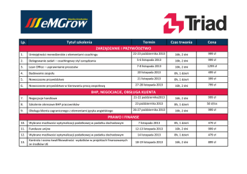 Lp. Tytuł szkolenia Termin Czas trwania Cena ZARZĄDZANIE I PRZYWÓDZTWO 1. Umiejętności menedżerskie z elementami coachingu 22-23 października 2013 16h, 2 dni 999 zł 2. Delegowanie zadań – coachingowy styl zarządzania 5-6 listopada 2013 16h, 2 dni 999 zł 3. Lean Office – usprawnianie procesów 7-8 listopada 2013 16h, 2 dni 1299 zł 4. Budowanie zespołu 20 listopada 2013 8h, 1 dzień 499 zł 5. Nowoczesne przywództwo 21 listopada 2013 8h, 1 dzień 399 zł 6. Nowoczesne przywództwo w kierowaniu pracą zespołową 27-28 listopada 2013 16h, 2 dni 799 zł 21-22 października2013 16h, 2 dni 999 zł 23 października 2013 8h, 1 dzień 50 zł/os 26-27 października 2013 16h, 2 dni 999 zł 7 listopada 2013 8h, 1 dzień 479 zł 12-13 listopada 2013 16h, 2 dni 999 zł 14 listopada 2013 8h, 1 dzień 479 zł 18-19 listopada 2013 16h, 2 dni 899 zł BHP, NEGOCJACJE, OBSŁUGA KLIENTA 7. Negocjacje handlowe 8. Szkolenie okresowe BHP pracowników 9. Obsługa klienta zagranicznego z elementami języka angielskiego PRAWO I FINANSE 10. Wybrane możliwości optymalizacji podatkowej w podatku dochodowym 11. Fundusze unijne 12. Wybrane możliwości optymalizacji podatkowej w podatku dochodowym 13. Kontrola i ocena kwalifikowalności wydatków w projektach finansowanych ze środków UE 14. Budowa systemu zarządzania i kontroli w perspektywie finansowej 20142020 20 listopada 2013 8h, 1 dzień 399 zł 15. Kurs pisania wniosków unijnych - jednodniowy 22 listopada 2013 8h, 1 dzień 499 zł 16. Zmiany w podatkach 2014 29 listopada 2013 8h, 1 dzień 399 zł 17. Zmiany w podatkach 2014 30 listopada 2013 8h, 1 dzień 399 zł 18. Prawo zamówień publicznych oraz zasada konkurencyjności w projektach finansowanych ze środków UE 2-3 grudnia 2013 16h, 2 dni 999 zł 19. VAT dla zaawansowanych w świetle najnowszej praktyki i orzecznictwa 6 grudnia 2013 8h, 1 dzień 499 zł 20. VAT dla zaawansowanych w świetle najnowszej praktyki i orzecznictwa 7 grudnia 2013 8h, 1 dzień 499 zł 21. Postępowanie administracyjne w sprawie zwrotu środków europejskich 9-10 grudnia 2013 16h, 2 dni 899 zł Więcej informacji pod nr telefonu 89 523 65 84 lub pod adresem e-mail: [email protected] Proponujemy także szkolenia „follow up” i e-konsultacje. Istnieje również możliwość zorganizowania szkoleń zamkniętych na prośbę klienta.